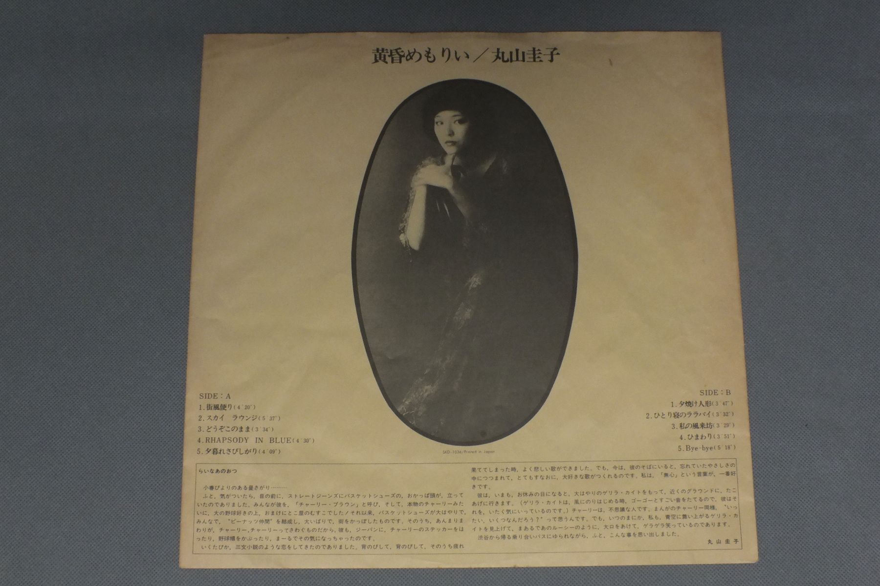 KEIKO MARUYAMA丸山圭子/TASOGARE MEMORY黄昏めもりい SKD-1036 製造国:日本盤 / Media:LP外観:EX盤の状態:EX帯:EX- 価格(税込):¥2,922(売約済) 送料 7inch:定形外郵便 360円~LP:定形外郵便 660円~送料は、注文の最終画面で確認頂けます。 > > KEIKO MARUYAMA/TASOGARE MEMORY 外観 (EX)特記事項:特記なし。外観EXの共通説明:ダメージが限定的。中古品としては保存状態がよい方。シミ、ヨゴレ、スレ 少し~軽度。 盤の状態 (EX)特記事項:薄いスリキズ・スレ軽くある感じ。殆どが軽微なものの様子です。盤EXの共通説明:盤面のスリキズが薄いものが少し~軽度 音に出そうなものは無いように見える(軽微なソフトティック音は除く)。 帯の状態 (EX-):シミや切れやヨレ有り。 Tweet それぞれの画像をクリックすると、大きい写真が見られます こちらの商品もお勧めです 550円 MASAHIRO KUWANA & TEAR DROPS桑名正博 & TEAR FROPS / COMMUNICATIONコミュニケーション 2,200円 ALFEEアルフィー / MASTAER SOUND PRESSINGザ・ルネッサンス MASTER SOUND盤 1,320円 DARK DUCKSダーク・ダックス / FOLK ALBUM AUTOGRAPHEDフォーク思考(サイン付) 880円 TULIPチューリップ / LIVE ACT TULIPライヴ アクト・チューリップ 1,320円 MARI AMACHI天地真理 / WHISPERING GREENLEAVES若葉のささやき/さよならだけ残して 1,320円 YASUHA泰葉 / RESERVEDリザーブド 770円 KUMIKO YAMASHITA山下久美子 / DANCIN` IN THE KITCHENダンシン・イン・ザ・キッチン 990円 YUKO TOMITAとみたゆう子 / TIMEタイム