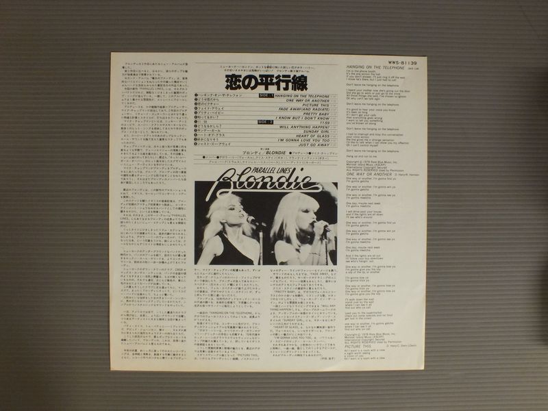 BLONDIEブロンディ/PARALLEL LINES恋の平行線 WWS81139 製造国:日本盤 / Media:LP外観:EX盤の状態:EX+帯:EX- 価格(税込):¥1,716(売約済) 送料 7inch:定形外郵便 360円~LP:定形外郵便 660円~送料は、注文の最終画面で確認頂けます。 > > BLONDIE/PARALLEL LINES 外観 (EX)特記事項:背スレ有り。外観EXの共通説明:ダメージが限定的。中古品としては保存状態がよい方。シミ、ヨゴレ、スレ 少し~軽度。 盤の状態 (EX+)特記事項:薄いスリキズ・スレ少し。一見してきれいな状態です。盤EX+の共通説明:盤面の極薄いスリキズ、スレ少し程度 音に出そうなものは無いように見える(極軽微なソフトティック音は除く)。 帯の状態 (EX-):裏側にシミ Tweet それぞれの画像をクリックすると、大きい写真が見られます こちらの商品もお勧めです 1,320円 ELVIS COSTELLOエルヴィス・コステロ / GOODBYE CRUEL WORLDグッバイ・クルエル・ワールド 1,320円 DEAD OR ALIVEデッド・オア・アライヴ / YOUTHQUAKEユースクエイク 1,320円 DOOL BY DOOLドール・バイ・ドール / GYPSY BLOODジプシー・ブラッド 1,320円 ADAM AND THE ANTSアダム&ジ・アンツ / KINGS OF THE WILD FRONTIERアダムの王国 1,320円 KEVIN ROWL & DEXYS MIDNIGHT RUNNERSテキシーズ・ミッドナイト・ランナーズ / TOO-RYE-AY女の泪はワザモンだ!! 770円 BOOMTOWN RATSブームタウン・ラッツ / MONDO BONGOモンド・ボンゴ 770円 CULTURE CLUB / KISSING TO BE CLEVER 1,650円 BLONDIEブロンディ / EAT TO THE BEAT恋のハートビート