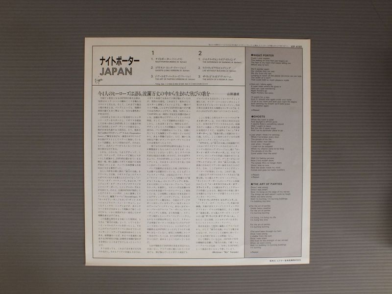JAPANジャパン/NIGHTPORTERナイトポーター VIP4181 製造国:日本盤 / Media:LP外観:VG+盤の状態:EX帯:EX 価格(税込):¥1,320(売約済) 送料 7inch:定形外郵便 360円~LP:定形外郵便 660円~送料は、注文の最終画面で確認頂けます。 > > JAPAN/NIGHTPORTER 外観 (VG+)特記事項:表ジャケにシミ。外観VG+の共通説明:ダメージやや有り。シミ、ヨゴレ、スレなど多少~やや多め。 盤の状態 (EX)特記事項:薄いスリキズ・スレ軽くある感じ。軽微なものの様子です。盤EXの共通説明:盤面のスリキズが薄いものが少し~軽度 音に出そうなものは無いように見える(軽微なソフトティック音は除く)。 帯の状態 (EX):特記なし。 Tweet それぞれの画像をクリックすると、大きい写真が見られます こちらの商品もお勧めです 770円 CULTUTE CLUB / HOUSE ON FIRE 1,320円 NENAネーナ / NENAロックバルーンは99 550円 BOOM CRASH OPERAブーム・クラッシュ・オペラ / GREAT WALLグレイト・ウォール 770円 TAZMANIAN DEVILSタズマニアン・デヴィルズ / アメリカン・ドリームを探して 440円 HIPSWAYヒップスウェイ / HIPSWAYヒップスウェイ 770円 NENAネーナ / ? (FRAGEZEICHEN)? (クエスチョンマーク) 440円 TEN TENテン・テン / WALK ONウォーク・オン 770円 CULTURE CLUBカルチャー・クラブ / WAR SONG戦争のうた