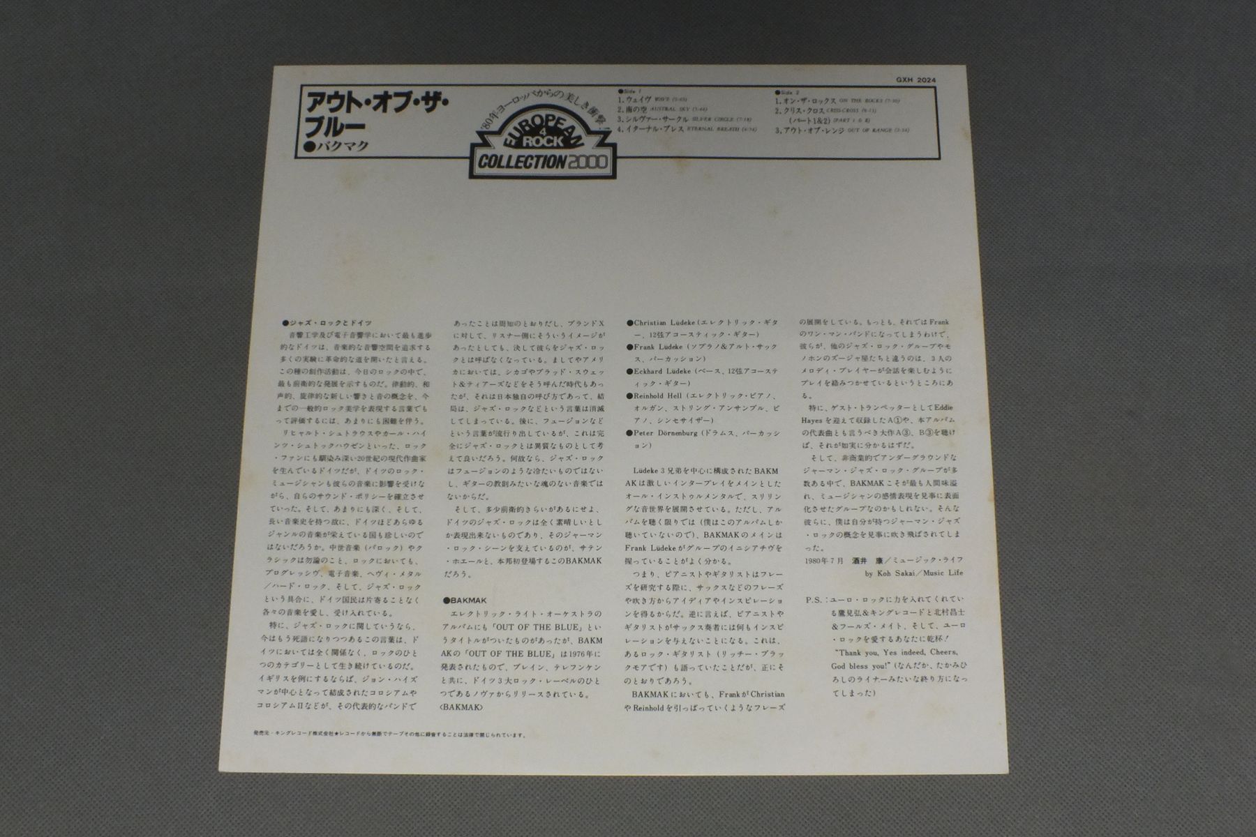 BAKMAKバクマク/OUT OF THE BLUEアウト・オブ・ザ・ブルー GXH-2024 製造国:日本盤 / Media:LP外観:EX盤の状態:EX- 価格(税込):¥1,430(売約済) 送料 7inch:定形外郵便 360円~LP:定形外郵便 660円~送料は、注文の最終画面で確認頂けます。 > > BAKMAK/OUT OF THE BLUE 外観 (EX)特記事項:ジャケ表面にシミやよごれ有り。外観EXの共通説明:ダメージが限定的。中古品としては保存状態がよい方。シミ、ヨゴレ、スレ 少し~軽度。 盤の状態 (EX-)特記事項:全体的には薄いスレやスリキズ程度できれいな印象。B2最初から半ばにかけてのスリキズで軽いプチ有り。盤EX-の共通説明:盤面のスリキズが多少有り。音に出そうなものは殆ど無いように見える~さほど気にならないぐらいの軽いプチ数カ所程度。 Tweet それぞれの画像をクリックすると、大きい写真が見られます こちらの商品もお勧めです 1,650円 WILLIE & THE POOR BOYSウィリーとプア・ボーイズ / ACTION FOR RESEARCH INTO MULTIPLE SCLEROSISロニー・レイン救済基金 770円 ABBAアバ / GREATEST HITS VOL.2グレイテスト・ヒッツVOL.2 1,100円 ABBAアバ / GREATEST HITS 24 1,210円 SKYスカイ / SKY 2スカイ2 990円 ABBAアバ / ARRIVALアライバル 770円 ABBAアバ / ARRIVALアライバル 990円 BAD COMPANYバッド・カンパニー / RUN WITH THE PACKバッド・カンパニー ?-ラン・ウィズ・ザ・パック 1,210円 ABBAアバ / ABBA GREATEST HITS VOL2アバ・グレイテスト・ヒッツ VOL2