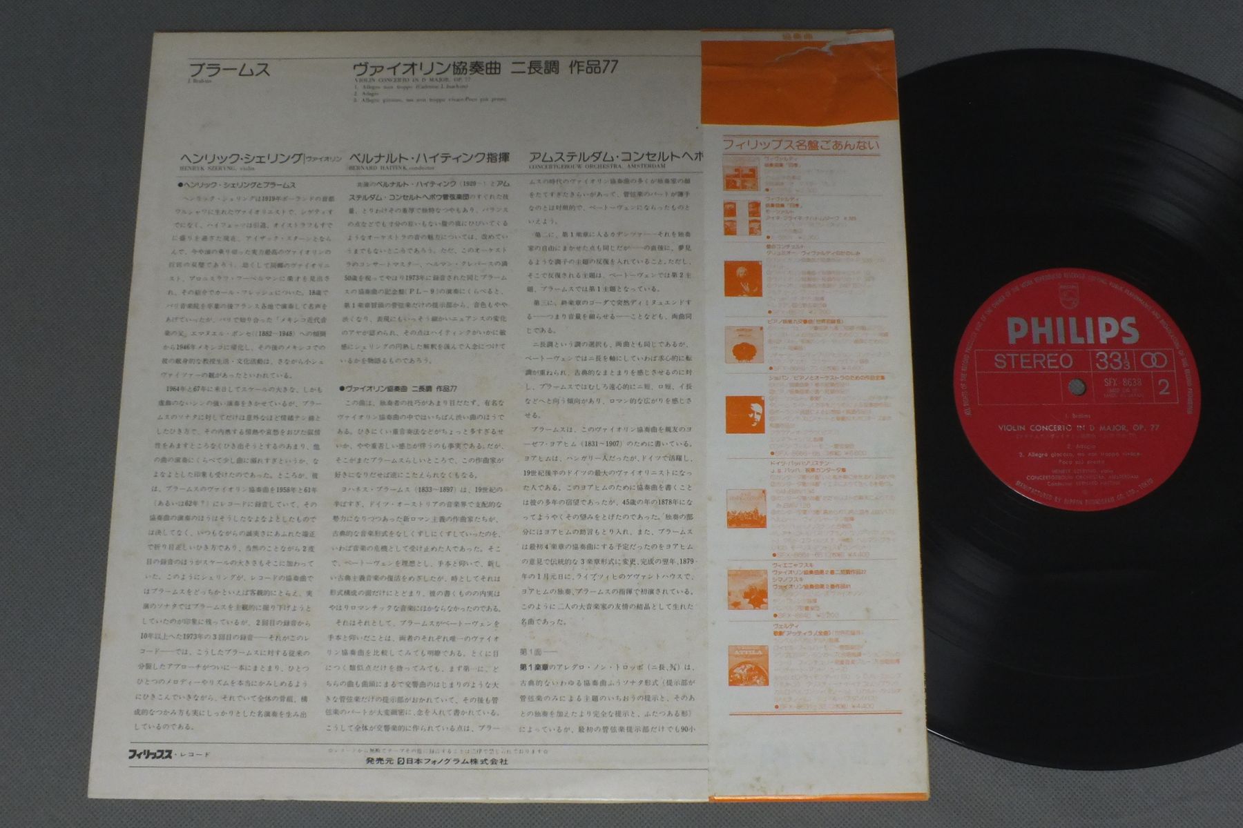 SZERYNG-HAITINKシェリング-ハイティンク/BRAHMS VIOLIN CONC. IN D OP77ブラームス ヴァイオリン協奏曲 SFX-8638 製造国:日本盤 / Media:LP外観:EX-盤の状態:EX+帯:VG+ 価格(税込):¥2,602(売約済) 送料 7inch:定形外郵便 360円~LP:定形外郵便 660円~送料は、注文の最終画面で確認頂けます。 レコード検索 > CLASSIC ORCH. > SZERYNG-HAITINK/BRAHMS VIOLIN CONC. IN D OP77 外観 (EX-)特記事項:裏ジャケにシミ有。外観EX-の共通説明:ダメージ軽度~多少。 中古品としては普通の状態。シミ、ヨゴレ、スレなど軽く~多少。 盤の状態 (EX+)特記事項:薄いスリキズ・スレ少し。一見してきれいな状態です。盤EX+の共通説明:盤面の極薄いスリキズ、スレ少し程度 音に出そうなものは無いように見える(極軽微なソフトティック音は除く)。 帯の状態 (VG+):裏側にヨレや破け。 Tweet それぞれの画像をクリックすると、大きい写真が見られます こちらの商品もお勧めです 990円 DAVISデイヴィス / BERLIOZ SYM. FANTASTIQUEベルリオーズ 幻想交響曲 990円 ANSERMET - NEW PHILHARMONIA ORCHESTRAアンセルメ - ニュー・フィルハーモニア管弦楽団 / FIRE BIRD火の鳥 1,320円 MENGELBERG - CONCERTGEBOUW ORCHESTRA OF AMSTERDAMメンゲルベルク - アムステルダム・コンセルトヘボウ管弦楽団 / BEETHOVEN - SYMPHONY NO.3ベートーヴェン - 交響曲第3番 990円 MARTINONマルティノン / DVORAK-SLAVONIC DANCESドヴォルザーク-スラヴ舞曲集 1,430円 BRENDEL - HAITINK - LONDON PHILHARMONIC ORCHESTRAブレンデル - ハイティンク - ロンドン・フィルハーモニー管弦楽団 / BEETHOVEN - CONCERTO NO5 EMPERORベートーヴェン - ピアノ協奏曲第5番 皇帝 990円 WALTER - NEW YORK PHIL.ワルター - ニューヨーク・フィル / BEETHOVEN - SYM. NO9 CHORALベートーヴェン - 交響曲第9番合唱 1,320円 ZDENEK KOSLERズデニェク・コシュラー / DVORAK-SLAVONIC DANCESドヴォルザーク-スラヴ舞曲集 990円 MAAZELマゼール / TCHAIKOVSKY SUITE NO3チャイコフスキー 組曲第3番