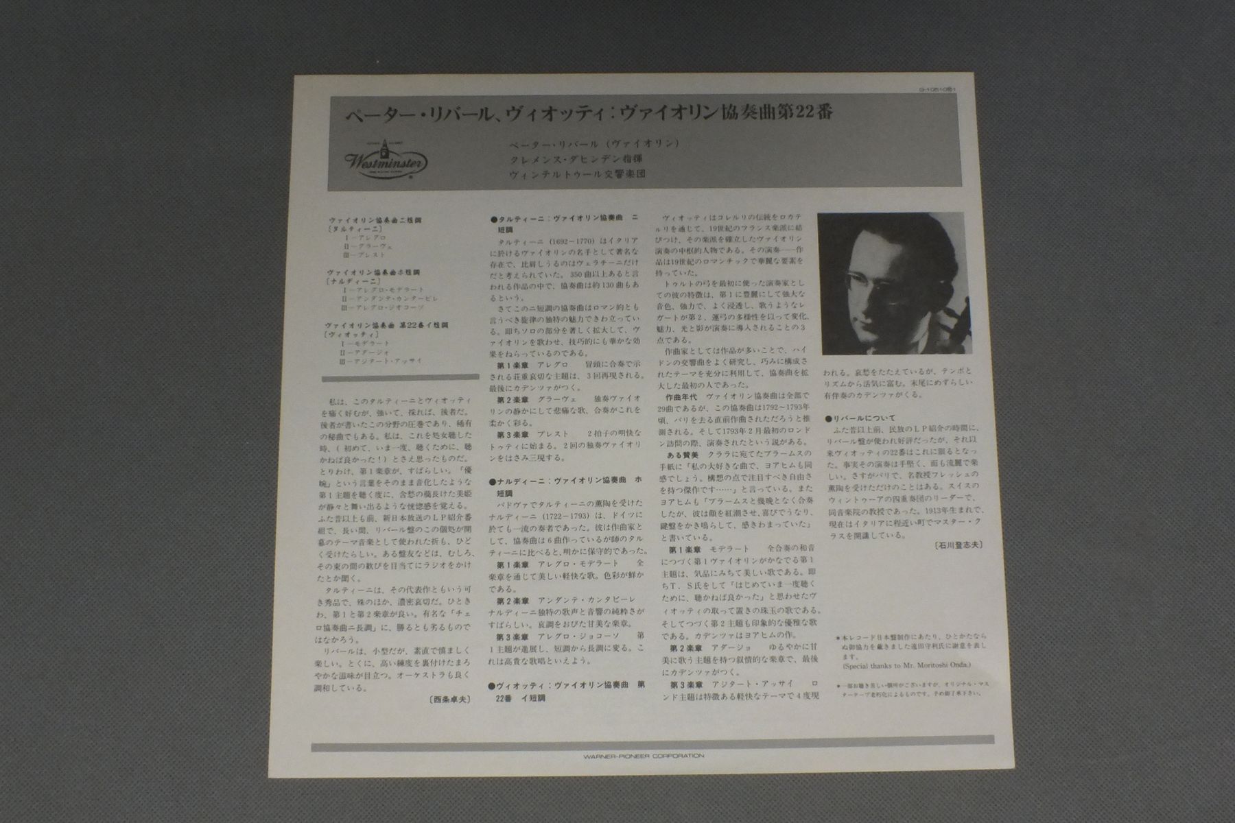 RYBAR-DAHINDENリバール-ダヒンデン/TARTINI NARDINI VIOTTI VIOLIN CONCERTIヴィオッティ ヴァイオリン協奏曲第22番 G-10510 製造国:日本盤 / Media:LP外観:EX盤の状態:EX+帯:EX 価格(税込):¥1,361(売約済) 送料 7inch:定形外郵便 360円~LP:定形外郵便 660円~送料は、注文の最終画面で確認頂けます。 > > RYBAR-DAHINDEN/TARTINI NARDINI VIOTTI VIOLIN CONCERTI 外観 (EX)特記事項:裏ジャケにシミ少し。外観EXの共通説明:ダメージが限定的。中古品としては保存状態がよい方。シミ、ヨゴレ、スレ 少し~軽度。 盤の状態 (EX+)特記事項:薄いスリキズ・スレ少し。一見してきれいな状態です。盤EX+の共通説明:盤面の極薄いスリキズ、スレ少し程度 音に出そうなものは無いように見える(極軽微なソフトティック音は除く)。 帯の状態 (EX):表側に退色。 Tweet それぞれの画像をクリックすると、大きい写真が見られます こちらの商品もお勧めです 1,320円 GALLOIS - BRIDE - ENSEMBLE INSTRUMENTAL DE FRANCEガロウ - ブライド - フランス室内合奏団 / PATRICK GALLOIS黄金のフルート パトリック・ガロウ4 990円 WILFRED LEHMANN-KAZUYOSHI AKIYAMAウィルフレッド・レーマン-秋山和慶 / ZIGEUNERWEISENチゴイネルワイゼン 1,320円 TASTONE TASSINARI - I MUSICIガストーネ・タッシナーリ - イ・ムジチ合奏団 / VIVARDI - FLUTE CONCERTOSヴィヴァルディ - フルート協奏曲集 990円 NEVILLE MARRINER - ACADEMY OF ST MARTINマリナー - アカデミー室内管弦楽団 / HANDEL - BALLET MUSICヘンデル - バレエ音楽名曲集 990円 ISAAC STERN - EUGENE ISTOMINアイザック・スターン - ユージン・イストミン / BEETHOVEN - VIOLIN SONATASベートーヴェン - ヴァイオリン・ソナタ第4番-第9番 クロイツェル 880円 VLADIMIR RIHA - SMETANA QUARTETウラディミール・ルジーハ - スメタナ四重奏団 / MOZART - CLALINET QUINTET モーツァルト - クラリネット五重奏曲 1,320円 HOLLIGER - NEGRI - DRESDEN STATE ORCHESTRAホリガー - ネグリ - ドレスデン国立管弦団員 / FAMOUS OBOE CONCERTOSバロック名協奏曲集 990円 SUK スーク-ホレチェック-スメターチェク-外山滋-ハイマン・ブレス-霧生トシ子-近衛秀麿 / HUMORESQUE ZIGEUNERWEISENユーモレスク-チゴイネルワイゼン (母と子の名曲コンサート・ダブル・デラックス ヴァイオリン名曲篇)