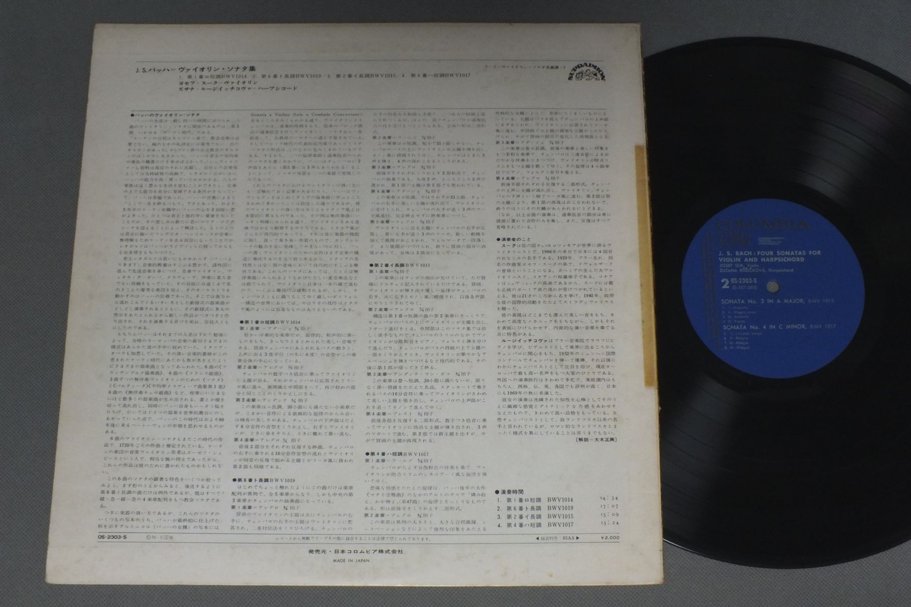 SUK-ROZICKOVAスーク-ルージイッチコヴァ/BACH FOUR SONATAS FOR VIOLIN & HARPSICHORDバッハ ヴァイオリン・ソナタ集 OS-2303-S 製造国:日本盤 / Media:LP外観:VG+盤の状態:EX 価格(税込):¥567(売約済) 送料 7inch:定形外郵便 360円~LP:定形外郵便 660円~送料は、注文の最終画面で確認頂けます。 レコード検索 > CLASSIC ORCH. > SUK-ROZICKOVA/BACH FOUR SONATAS FOR VIOLIN & HARPSICHORD 外観 (VG+)特記事項:背にスレやテープ補修。ジャケ表面にシミ有り。外観VG+の共通説明:ダメージやや有り。シミ、ヨゴレ、スレなど多少~やや多め。 盤の状態 (EX)特記事項:薄いスリキズ・スレ軽くある感じ。殆どが軽微なものの様子です。盤EXの共通説明:盤面のスリキズが薄いものが少し~軽度 音に出そうなものは無いように見える(軽微なソフトティック音は除く)。 Tweet それぞれの画像をクリックすると、大きい写真が見られます こちらの商品もお勧めです 990円 RAMPAL-LASLINEランパル−ラヌキーヌ / RECITAL DE FLUTE ET HARPEフルートとハープ 990円 JOG DEMUS - SCHUBERT QUARTETデームス / SCHUBERT - TROUT QUINTETシューベルト - ピアノ5重奏曲ます 990円 OTTO RUHM - BARYLLI QUARTET - VIENNA PHILオットー・リューム - バリリ四重奏団 - ウィーン・フィルハーモニー木管グループ / MOZART - SERENADE NO.9モーツァルト - セレナード 第9番 ポストホルン 990円 COLLEGIUM AUREUMコレギウム・アウレウム合奏団 / MOZART DIVERTIMENTO K251 DIVERTIMENTO K247モーツァルト 喜遊曲第11・10番 1,320円 Y.UNNO / M.MATSUBARA海野義雄 松原緑 / MOZART SONATAS FOR PIANO & VIOLINモーツァルト ヴァイオリン・ソナタ集 990円 LA PETTIE BANDラ・プティット・バンド / MUFFAT SUITEミュファ 組曲他 990円 GRUMIAUX & HASKILグリュミオー & ハスキル / MOZART - SONATAS FOR VIOLIN & PIANOモーツアルト - ヴァイオリン・ソナタ第40番42番 1,430円 PAUL BADURA-SKODAパウル・バドゥラ-スコダ / SCHUBERT PIANO QUINTET `TROUT`シューベルト-ピアノ五重奏曲 `鱒`