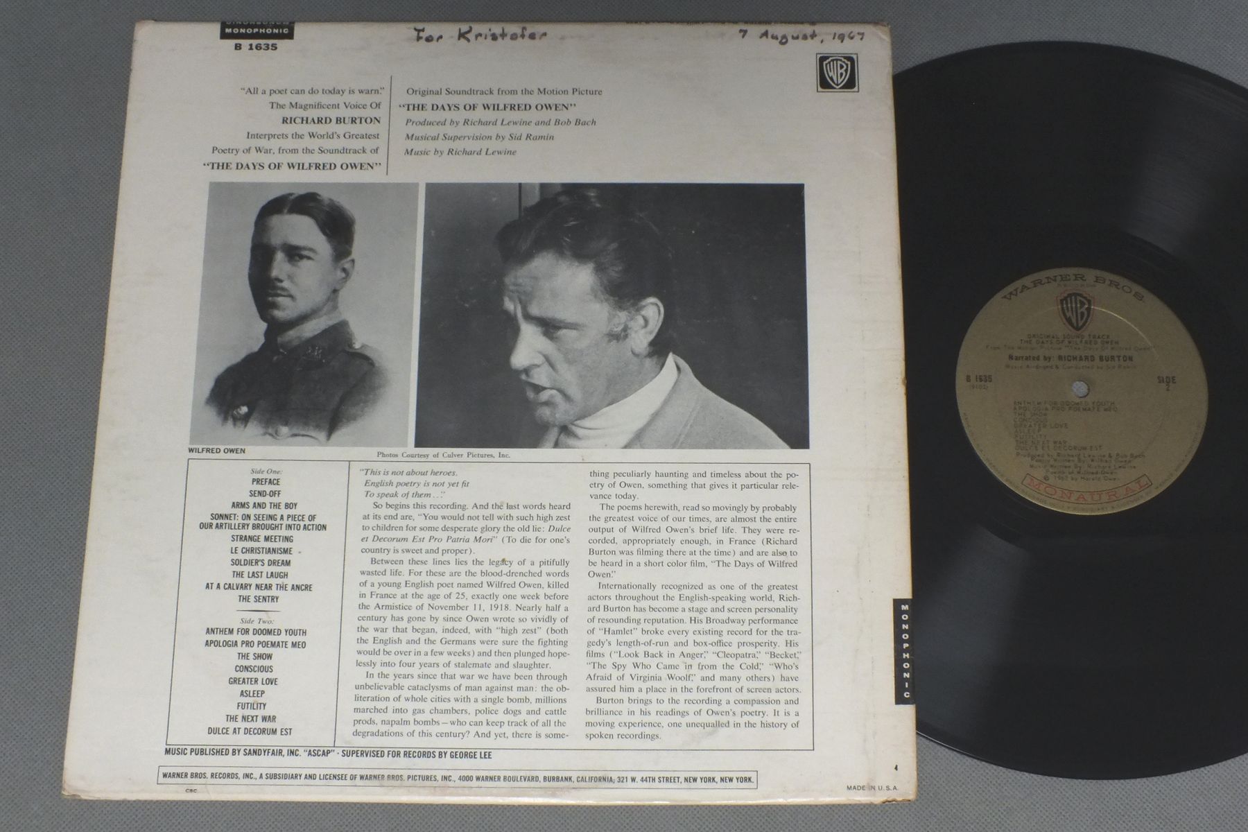 RICHARD BURTON/DAYS OF WILFRED OWEN B 1635 製造国:米国盤 / Media:LP外観:VG+盤の状態:EX 価格(税込):¥2,270(売約済) 送料 7inch:定形外郵便 360円~LP:定形外郵便 660円~送料は、注文の最終画面で確認頂けます。 > > RICHARD BURTON/DAYS OF WILFRED OWEN 外観 (VG+)特記事項:表ジャケにレコードリングスレ等。裏ジャケに書込。外観VG+の共通説明:ダメージやや有り。シミ、ヨゴレ、スレなど多少~やや多め。 盤の状態 (EX)特記事項:薄いスリキズ・スレ軽くある感じ。軽微なものの様子です。盤EXの共通説明:盤面のスリキズが薄いものが少し~軽度 音に出そうなものは無いように見える(軽微なソフトティック音は除く)。 Tweet それぞれの画像をクリックすると、大きい写真が見られます こちらの商品もお勧めです 880円 VANGELIS / CHARIOTS OF FIRE 770円 GERSHWIN / SOUND TRACK PORGY & BESS 880円 ALFRED NEWMAN / HOW THE WEST WAS WON 1,980円 DIMITRI TIOKINディミトリー・ティオムキン / SOSUNDTRACK GUNS OF NAVARONEナバロンの要塞 880円 RICHARD ATTENBOROUGHリチャード・アッテンボロー / CRY FREEDOM遠い夜明け 1,980円 MIKLOS ROZSAミクロス・ロージャ / SOUNDTRACK EL CIDエル・シド 1,650円 DIMITRI TIOKINディミトリー・ティオムキン / SOUNDTRACK ALAMOアラモ 770円 ELMER BERNSTEIN / ORIGINAL SOUNDTRACK RECORDING-THE TEN COMMANDMENTS