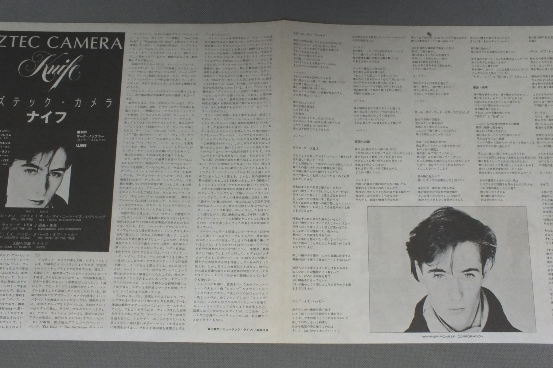 AZTEC CAMERAアズテック・カメラ/KNIFEナイフ P-13066 製造国:日本盤 / Media:LP外観:EX盤の状態:EX+帯:EX 価格(税込):¥1,870(売約済) 送料 7inch:定形外郵便 360円~LP:定形外郵便 660円~送料は、注文の最終画面で確認頂けます。 > > AZTEC CAMERA/KNIFE 外観 (EX)特記事項:特記なし。外観EXの共通説明:ダメージが限定的。中古品としては保存状態がよい方。シミ、ヨゴレ、スレ 少し~軽度。 盤の状態 (EX+)特記事項:薄いスリキズ・スレ少し。一見してきれいな状態です。盤EX+の共通説明:盤面の極薄いスリキズ、スレ少し程度 音に出そうなものは無いように見える(極軽微なソフトティック音は除く)。 帯の状態 (EX):特記なし。 その他:白見本盤 Tweet それぞれの画像をクリックすると、大きい写真が見られます こちらの商品もお勧めです 550円 HUNG CHUNGワン・チャン / HUNG CHUNGダンス・ホール・デイズ 440円 TAXXIタクシー / STATES OF EMERGENCY緊急発進 ! 770円 NENAネーナ / ? (FRAGEZEICHEN)? (クエスチョンマーク) 1,210円 OXOオクソ / 1st ALBUMオクソ 1,320円 QUARTERFLASHクウォーターフラッシュ / QUARTERFLASHミッドナイト・フラッシュ 440円 WILD BLUEワイルド・ブルー / NO MORE JINXノー・モア・ジンクス 770円 TAZMANIAN DEVILSタズマニアン・デヴィルズ / アメリカン・ドリームを探して 770円 CHEAP TRICKチープ・トリック / HEAVEN TONIGHT天国の罠(トリック)