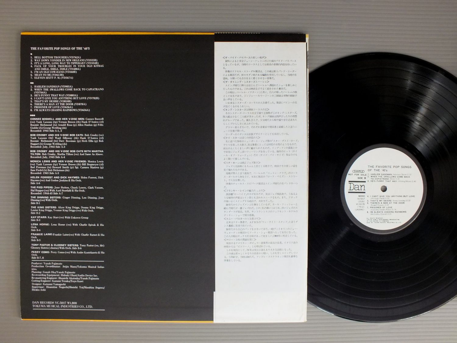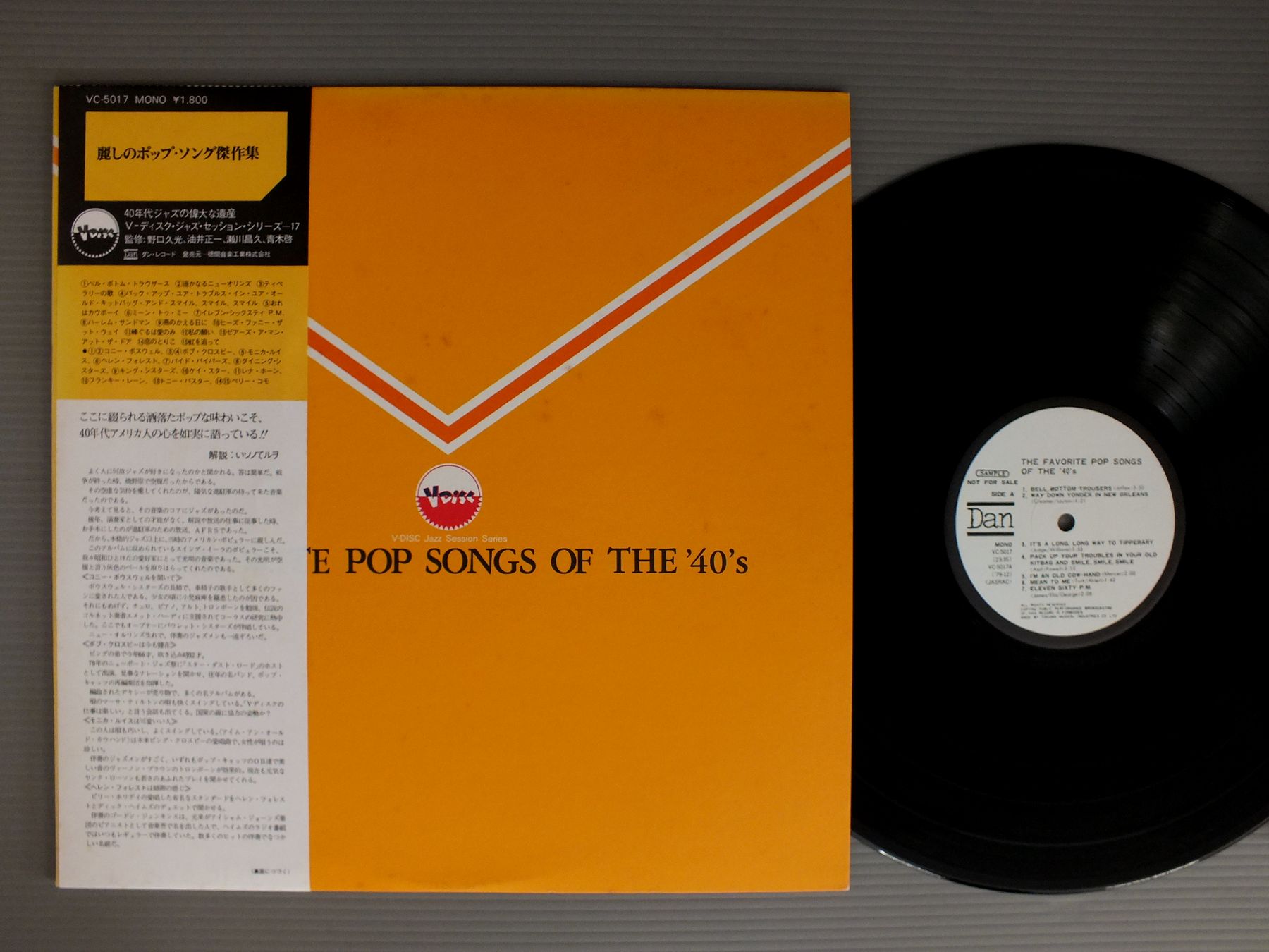 40s VARIOUS JAZZ VOCAL40年代ジャズ・ボーカル/FAVORITE POP SONGS OF THE 40 S麗しのポップ・ソング傑作集-40年代ジャズの偉大な遺産 VC5017 製造国:日本盤 / Media:LP外観:EX-盤の状態:EX帯:EX 価格(税込):¥990(売約済) 送料 7inch:定形外郵便 360円~LP:定形外郵便 660円~送料は、注文の最終画面で確認頂けます。 > > 40s VARIOUS JAZZ VOCAL/FAVORITE POP SONGS OF THE 40 S 外観 (EX-)特記事項:表ジャケにシミ有り。外観EX-の共通説明:ダメージ軽度~多少。 中古品としては普通の状態。シミ、ヨゴレ、スレなど軽く~多少。 盤の状態 (EX)特記事項:薄いスリキズ・スレ軽くある感じ。軽微なものの様子です。盤EXの共通説明:盤面のスリキズが薄いものが少し~軽度 音に出そうなものは無いように見える(軽微なソフトティック音は除く)。 帯の状態 (EX):シミやよごれ有り。 Tweet それぞれの画像をクリックすると、大きい写真が見られます こちらの商品もお勧めです 1,320円 MATT DENNISマット・デニス / DENNIS ANYONE?デニス・エニワン 880円 MAEDA SISTERS前田姉妹 / GERSHWINGガーシュイン 1,320円 DINAH WASHINGTONダイナ・ワシントン / DINAH JAMSウィズ・クリフォード・ブラウン 1,210円 TONY BENNETTトニー・ベネット / ART OF EXCELLENCEアート・オブ・エクセレンス 770円 SWINGLE SINGERSスイングル・シンガーズ / JAZZ SEBASTIEN BACHジャズ・セバスチャン・バッハ 990円 CLEO LAINEクレオ・レーン / RETURN TO CARNEGIEリターン・トゥ・カーネギー 1,320円 BUDDY GRECOバディ・グレコ / AT MISTER KELLY`Sアット・ミスター・ケリーズ 1,320円 CLEO LAINEクレオ・レーン / AT THE WAVENDON FESTIVALジス・イズ・クレオ -クレオ・レーン・アット・ザ・ウェイヴンドン-