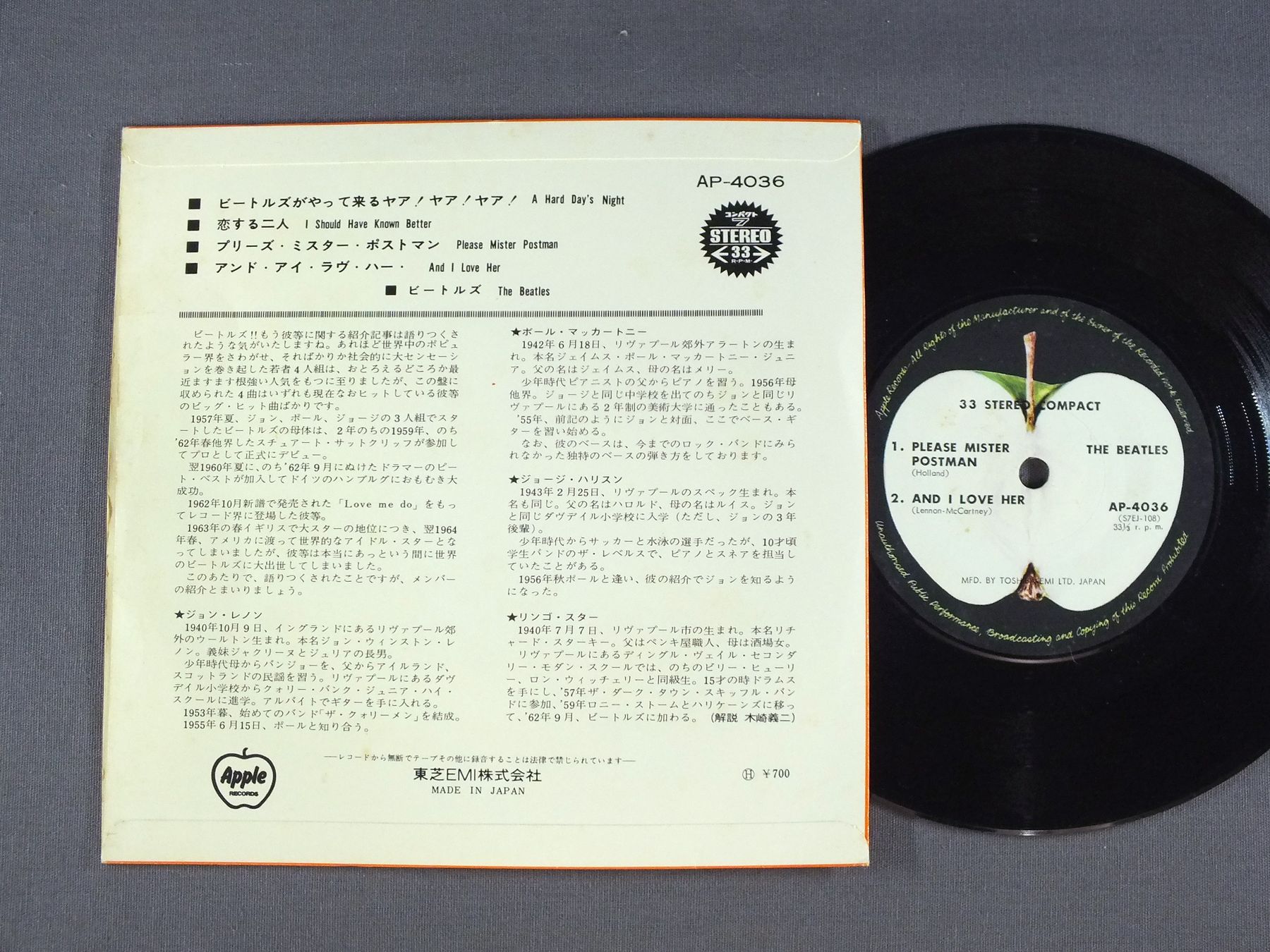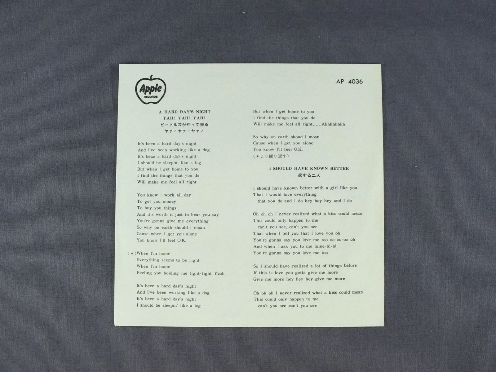 BEATLESビートルズ/HARD DAY`S NIGHT EPビートルズがやって来る ヤァ!ヤァ!ヤァ!4曲EP AP4036 製造国:日本盤 / Media:7inch外観:EX盤の状態:EX 価格(税込):¥880(売約済) 送料 7inch:定形外郵便 360円~LP:定形外郵便 660円~送料は、注文の最終画面で確認頂けます。 > > BEATLES/HARD DAY`S NIGHT EP 外観 (EX)特記事項:ヨレ有り。裏ジャケによごれやシミ。外観EXの共通説明:ダメージが限定的。中古品としては保存状態がよい方。シミ、ヨゴレ、スレ 少し~軽度。 盤の状態 (EX)特記事項:スレやスリキズが少し。全体的にきれいな状態です。盤EXの共通説明:盤面のスリキズが薄いものが少し~軽度 音に出そうなものは無いように見える(軽微なソフトティック音は除く)。 Tweet それぞれの画像をクリックすると、大きい写真が見られます こちらの商品もお勧めです 770円 PAUL MCCARTNEY&WINGSポール・マッカートニー&ウイングス / BAND ON THE RUNバンド・オン・ザ・ラン 1,650円 GEORGE HARRISONジョージ・ハリスン / DARK HORSEダーク・ホース 770円 JOHN LENNONジョン・レノン / PLASTIC ONO BANDプラスティック・オノ・バンド 770円 PAUL MCCARTNEY & WINGSポール・マッカートニー & ウイングス / WINGS AT THE SPEED OF SOUNDスピード・オヴ・サウンド 1,210円 WINGSウイングス / GREATEST HITSグレイテスト・ヒット 1,980円 GEORGE HARRISONジョージ・ハリスン / LIVING IN THE MATERIAL WORLDリヴィング・イン・ザ・マテリアル・ワールド 1,210円 WINGSウィングス / WINGS OVER AMERICAウィングスU.S.A ライヴ 880円 WINNGSウイングス / VENUS AND MARS WIGSヴィーナス・アンド・マース