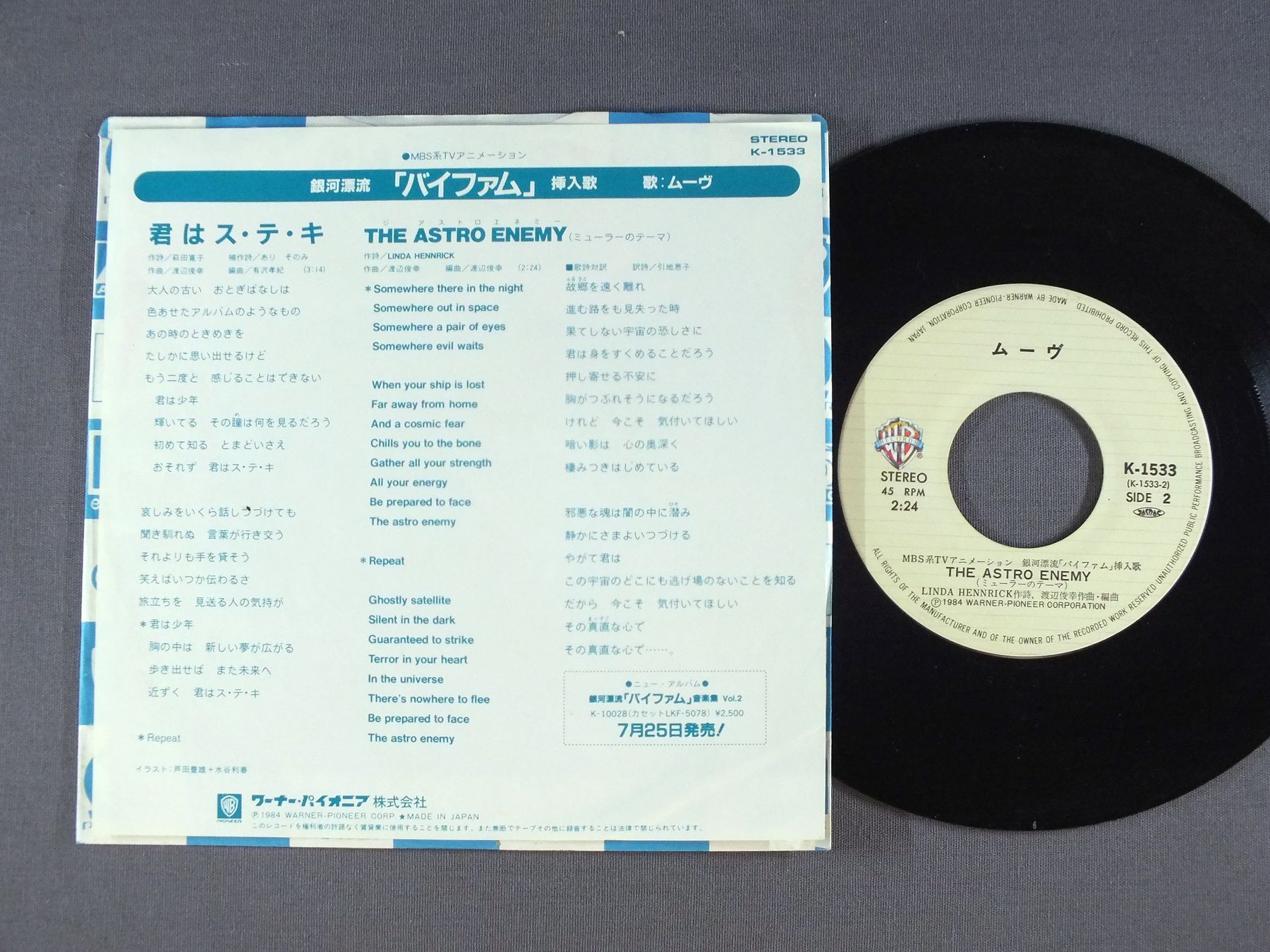 ANIME ROUND VERNIAN VIFAMテレビアニメ 銀河漂流 バイファム/INSERT SONG YOUR ARE NICE挿入歌 君はス・テ・キ K1533 製造国:日本盤 / Media:7inch外観:EX-盤の状態:EX+ 価格(税込):¥550(売約済) 送料 7inch:定形外郵便 360円~LP:定形外郵便 660円~送料は、注文の最終画面で確認頂けます。 > > ANIME ROUND VERNIAN VIFAM/INSERT SONG YOUR ARE NICE 外観 (EX-)特記事項:ヨレ有り。裏側によごれやシミ。外観EX-の共通説明:ダメージ軽度~多少。 中古品としては普通の状態。シミ、ヨゴレ、スレなど軽く~多少。 盤の状態 (EX+)特記事項:スレやスリキズが少し。全体的にきれいな状態です。盤EX+の共通説明:盤面の極薄いスリキズ、スレ少し程度 音に出そうなものは無いように見える(極軽微なソフトティック音は除く)。 Tweet それぞれの画像をクリックすると、大きい写真が見られます こちらの商品もお勧めです 550円 ANIME LOCKE THE SUPERMANタリスマン / TIGER OF FIREアニメ「超人ロック」炎の虎 770円 ANIMETOPIAアニメトピア / 3アニメトピア3 1,320円 ANIME SPACE PIRATE CAPTAIN HARLOCK宇宙海賊 キャプテン・ハーロック / TV SOUNDTRACK交響組曲 テレビ・サウンドトラック盤 440円 TALIZMANタリスマン / SUPERMAN LOCKロック組曲 超人ロック 770円 CRUSHER JOEクラッシャージョウ / SOUND TRACK音楽篇 1,210円 ANIME AONI PPRODUCTION青二プロ / VOICE VOICE VOICE10周年記念フェスティバル・ライヴ 770円 TV ANIME AIM FOR THE ACEアニメ エースをねらえ ! / VOL2新エースをねらえ ! 770円 ANIME MOBILE SUIT GUNDAM機動戦士ガンダム / AMURO ( ORIGINAL SOUNDTRACK )アムロよ ( オリジナル・サウンドトラック )