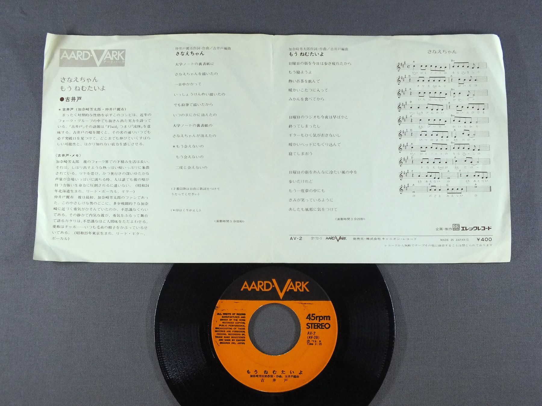 FURUIDO古井戸/SANAE CHANさなえちゃん AV2 製造国:日本盤 / Media:7inch外観:VG+盤の状態:EX- 価格(税込):¥550 送料 7inch:定形外郵便 360円~LP:定形外郵便 660円~送料は、注文の最終画面で確認頂けます。 > > FURUIDO/SANAE CHAN 外観 (VG+)特記事項:ヨレ有り。外観VG+の共通説明:ダメージやや有り。シミ、ヨゴレ、スレなど多少~やや多め。 盤の状態 (EX-)特記事項:薄いスレやスリキズ多少有り。軽微な感じです。盤EX-の共通説明:盤面のスリキズが多少有り。音に出そうなものは殆ど無いように見える~さほど気にならないぐらいの軽いプチ数カ所程度。 Tweet それぞれの画像をクリックすると、大きい写真が見られます こちらの商品もお勧めです 990円 NOBUYASU OKABAYASHI岡林信康 / DAREZO KONOKO NI AINOTE WO誰ぞこの子に愛の手を 440円 BILLY BANBANビリー・バンバン / BILLY BANBANビリー・バンバン 1,210円 KUMIKO YOKOI - CHUO CHOIR etc横井久美子・中央合唱団他 / HIROBAうたごえフォーク ひろば 1,650円 ITSUTSUNO AKAI FUSEN五つの赤い風船 / FOLK ALBUM NO1フォーク・アルバム第1集 880円 KEM佐藤公彦 / KEME VOL3千羽鶴 2,640円 UTANOICHI唄の市 / YAON + BOOKLET野音唄の市 + 楽譜集 1,980円 HAKO YAMAZAKI山崎ハコ / NINGEN MAGAI人間まがい 1,210円 TOMOYA TAKAISHI高石友也 / FOLK SONGS VOL3坊や大きくならないで フォーク・アルバム第3集