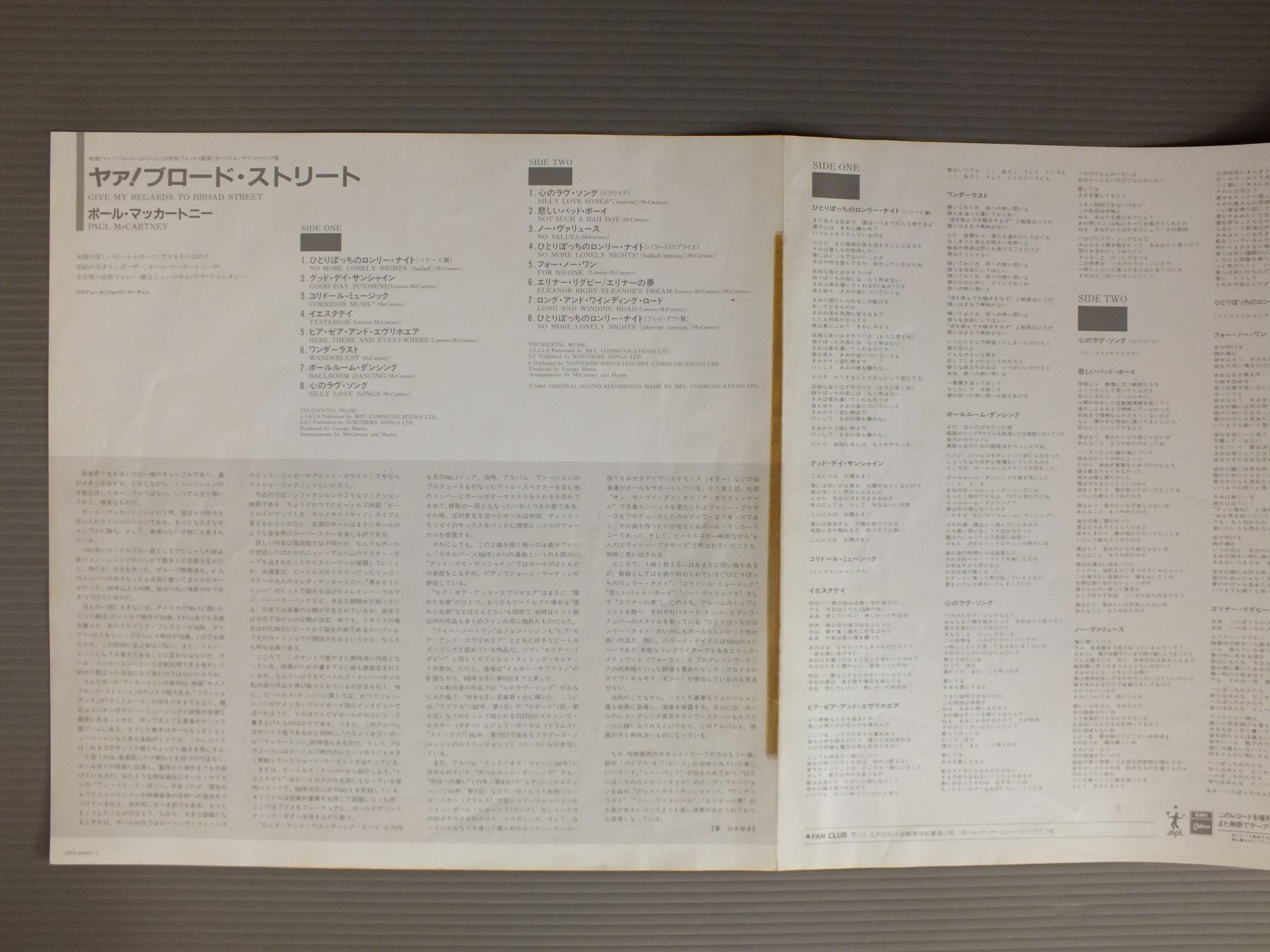 PAUL MCCARTNEYポール・マッカートニー/GIVE MY REGARDS TO BROAD STREETヤァ! ブロード・ストリート EPS91094 製造国:日本盤 / Media:LP外観:VG+盤の状態:EX帯:VG 価格(税込):¥578(売約済) 送料 7inch:定形外郵便 360円~LP:定形外郵便 660円~送料は、注文の最終画面で確認頂けます。 > > PAUL MCCARTNEY/GIVE MY REGARDS TO BROAD STREET 外観 (VG+)特記事項:背スレやヘリスレ有り。レコードリングスレ有り。見開きにスレやテープ。解説カードにテープ跡。外観VG+の共通説明:ダメージやや有り。シミ、ヨゴレ、スレなど多少~やや多め。 盤の状態 (EX)特記事項:薄いスリキズ・スレ軽くある感じ。軽微なものの様子です。盤EXの共通説明:盤面のスリキズが薄いものが少し~軽度 音に出そうなものは無いように見える(軽微なソフトティック音は除く)。 帯の状態 (VG):切れやヨレ、テープ有り。 Tweet それぞれの画像をクリックすると、大きい写真が見られます こちらの商品もお勧めです 770円 PAUL MCCARTNEY & WINGSポール・マッカートニー & ウイングス / WINGS AT THE SPEED OF SOUNDスピード・オヴ・サウンド 770円 WINGSウイングス / AT THE SPEED OF SOUNDスピード・オブ・サウンド 770円 JOHN LENNONジョン・レノン / PLASTIC ONO BANDプラスティック・オノ・バンド 770円 WINGSポール・マッカートニー&ウイングス / VENUS AND MARSヴィーナス・アンド・マース 1,320円 WINGSウイングス / WINGS OVER AMERICAウイングス U.S.A.ライヴ!! 990円 WINGS / VENUS AND MARS 1,320円 JOHN LENNON & YOKO ONOジョン・レノン.ヨーコ・オノ / MILK AND HONEYミルク・アンド・ハニー 1,540円 WINGSポール・マッカートニーとウイングス / LONDON TOWN
