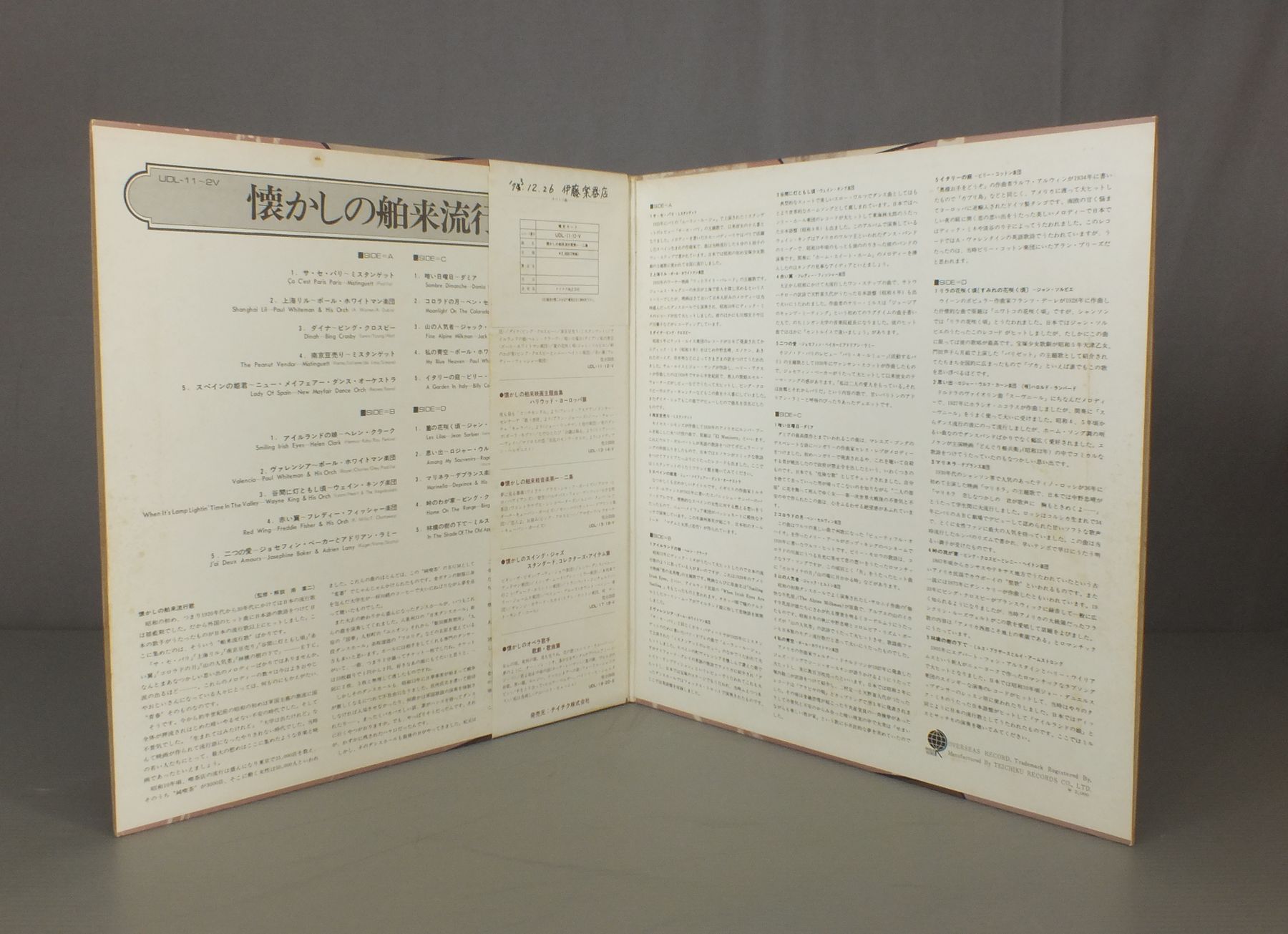 MISTINGUETT-BING CROSBY etcミスタンゲット-ビング・クロスビー 他/POPULAR MUSIC IN 20s-30s懐かしの舶来流行歌 UDL11-12V 製造国:日本盤 / Media:LP外観:EX-盤の状態:EX帯:VG+ 価格(税込):¥924(売約済) 送料 7inch:定形外郵便 360円~LP:定形外郵便 660円~送料は、注文の最終画面で確認頂けます。 > > MISTINGUETT-BING CROSBY etc/POPULAR MUSIC IN 20s-30s 外観 (EX-)特記事項:見開きや背も含めてジャケ表面にシミやよごれ有り。外観EX-の共通説明:ダメージ軽度~多少。 中古品としては普通の状態。シミ、ヨゴレ、スレなど軽く~多少。 盤の状態 (EX)特記事項:薄いスリキズ・スレ軽くある感じ。殆どが軽微なものの様子です。盤EXの共通説明:盤面のスリキズが薄いものが少し~軽度 音に出そうなものは無いように見える(軽微なソフトティック音は除く)。 帯の状態 (VG+):シミや書き込み、ヨレ有り。底にテープ補修。 Tweet それぞれの画像をクリックすると、大きい写真が見られます こちらの商品もお勧めです 1,210円 ZTT ( ZANG TUMB TUMB ) LABEL ARTISTS / IQ6 ( ZTT SAMPLERD )IQ6 (ZTTサンプラー) 770円 CRAMMED LABEL ARTISTSクラムド・ディスク / IT`S A CRAMMED CRAMMED CRAMMED WORLDクラムド・ワールド 770円 JAY & AMERICANS-GARY LEWIS & PLAYBOYS etcジェイとアメリカンズ-ゲーリー・ルイスとプレイボーイズ 他 / 60S POP VOCAL HITS COLLECTION60S ポップ・ヴォーカルヒット・コレクション 550円 VARIOUS ARTISTSブラック系オムニバス / BLACK CRYSTALブラック・クリスタル 880円 JEAN VAISSADE-GEORGES GUETARY etcジャン・ヴェザード-ジョルジュ・ゲッタリー 他 / LE SOUVENIR DES CHANSONS懐かしのシャンソン 1,320円 MUSE CONCERTS FOR A NON-NUCLEAR FUTURE原子力発電所建設反対運動 ミューズ・コンサート・ライヴ / NO NUKESノー・ニュークス