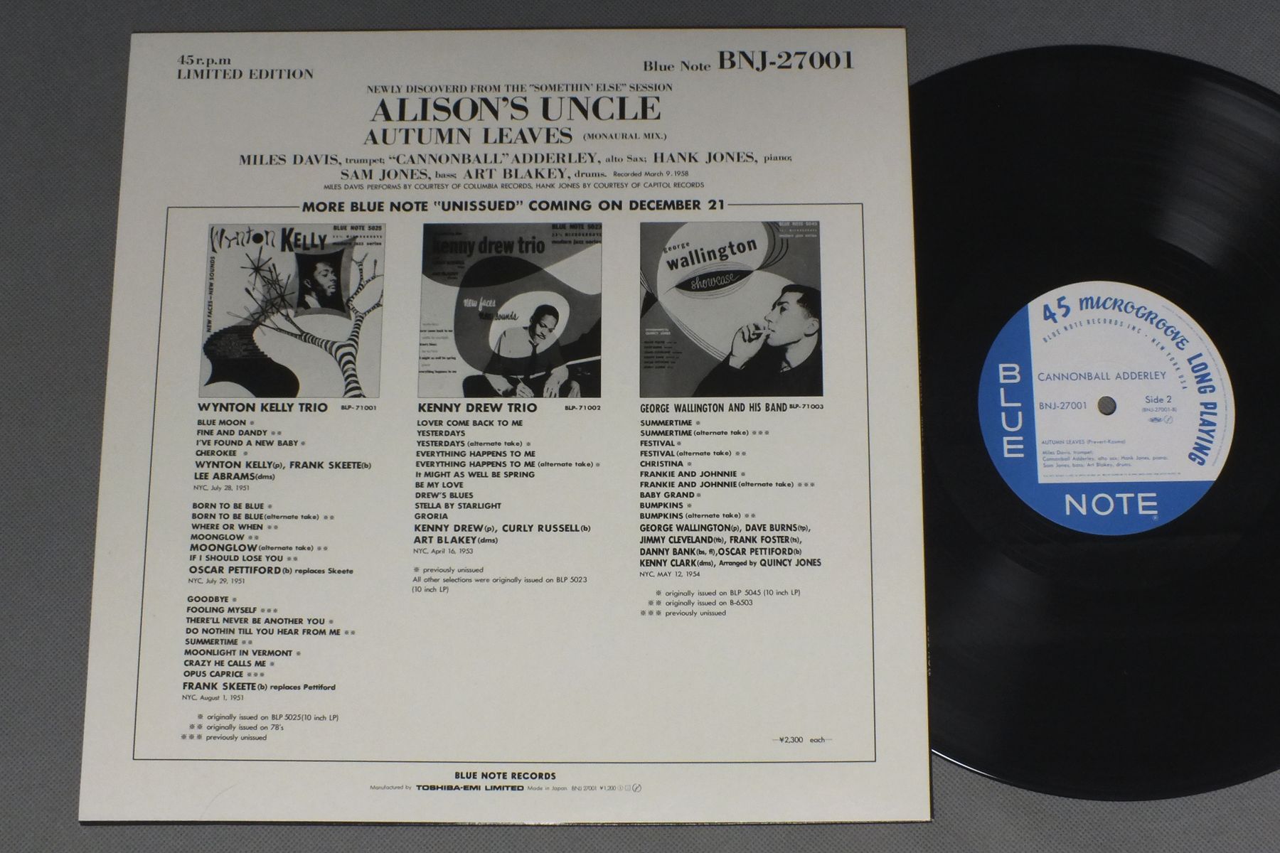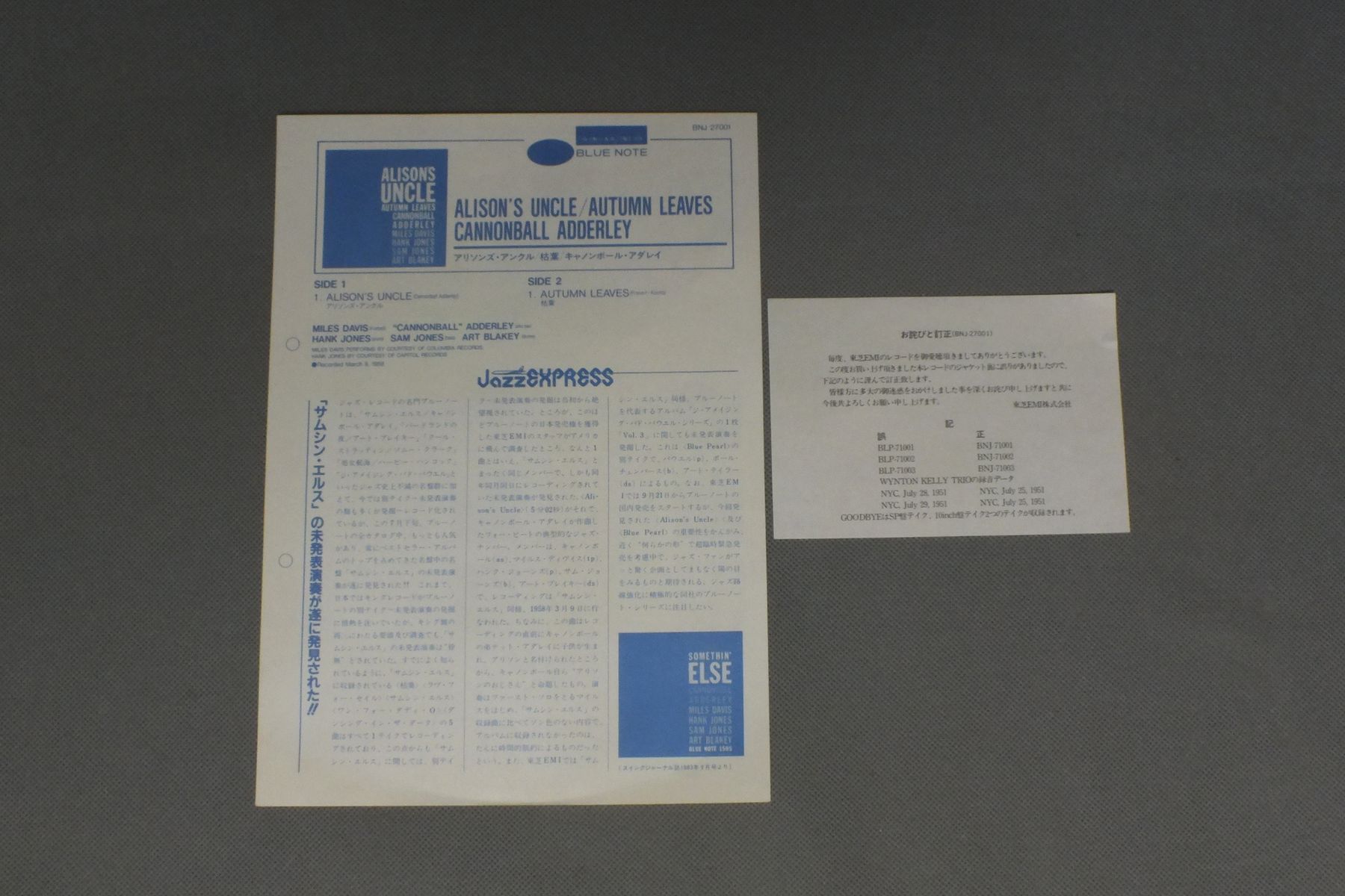 CANNONBALL ADDERLEYキャノンボール・アダレイ/ALISON`S UNCLE-AUTUMN LEAVESアリソンズ・アンクル-枯葉 BNJ-27001 製造国:日本盤 / Media:12inch外観:EX盤の状態:EX+ 価格(税込):¥990(売約済) 送料 7inch:定形外郵便 360円~LP:定形外郵便 660円~送料は、注文の最終画面で確認頂けます。 > > CANNONBALL ADDERLEY/ALISON`S UNCLE-AUTUMN LEAVES 外観 (EX)特記事項:特記なし。外観EXの共通説明:ダメージが限定的。中古品としては保存状態がよい方。シミ、ヨゴレ、スレ 少し~軽度。 盤の状態 (EX+)特記事項:薄いスリキズ・スレ少し。一見してきれいな状態です。盤EX+の共通説明:盤面の極薄いスリキズ、スレ少し程度 音に出そうなものは無いように見える(極軽微なソフトティック音は除く)。 Tweet それぞれの画像をクリックすると、大きい写真が見られます こちらの商品もお勧めです 1,320円 KAZUMI WATANABE-STEVE GADD etc渡辺香津美-スティーヴ・ガッド 他 / TEO MACERO PRESENTS IMPRESSIONS OF VIRUSテオ・マセロ・プレゼンツ 復活の日の印象 1,980円 YASUTAKA TSUTSUI + YOSUKE YAMASHITA etc筒井康隆 + 山下洋輔他 / INNER SPACE OF YASUTAKA TSUTSUI筒井康隆全集プレゼント INNER SPACE OF YASUTAKA TSUTSUI 770円 THAD JONES & MEL LEWISサド・ジョーンズ & メル・ルイス / LIVE IN TOKYOライブ・イン・東京 770円 GEORGE LEWISジョージ・ルイス / AT CLUB HANGOVER VOL1アット・クラブ・ハングオーヴァー VOL1 660円 JACQUES LOUSSIERジャック・ルーシェ / PLAY BACHプレイ・バッハ 770円 SONYA ROBINSONソニア・ロビンソン / SONYAソニア 440円 MOE KOFFMAN / GOES ELECTRIC 770円 JOHN KLEMMERジョン・クレマー / LIFESTYLEライフスタイル