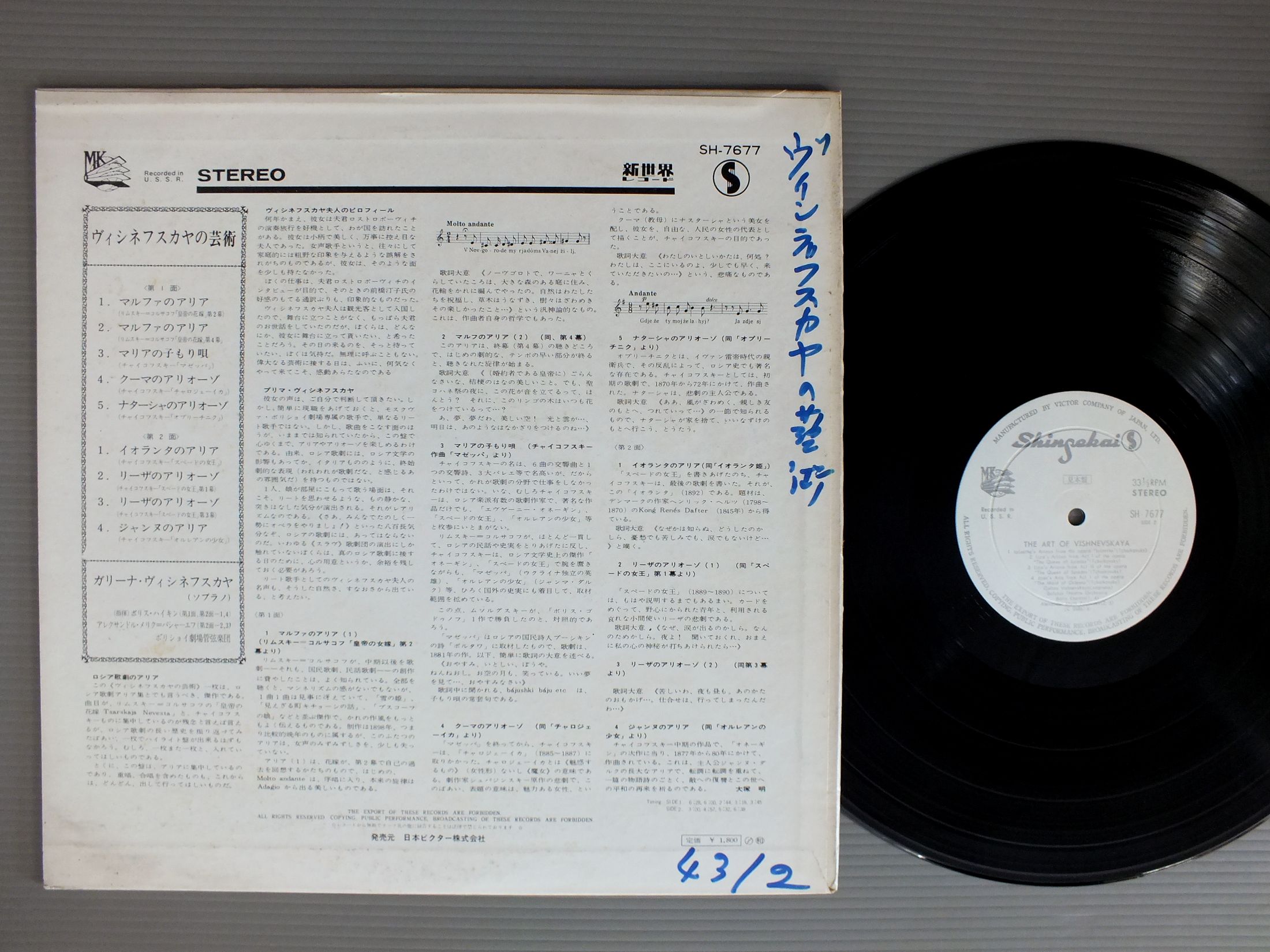 GALINA VISHNEVSKAYA-BORIS KHAIKIN-A.MELIK-PASHAYEVガリーナ・ヴィシネフスカヤ-ボリス・ハイキン-アレクサンドル・メリク=パシャーエフ/ART OF VISHNEVSKAYAヴィシネフスカヤの芸術 SH7677 製造国:日本盤 / Media:LP外観:VG+盤の状態:EX 価格(税込):¥440(売約済) 送料 7inch:定形外郵便 360円~LP:定形外郵便 660円~送料は、注文の最終画面で確認頂けます。 > > GALINA VISHNEVSKAYA-BORIS KHAIKIN-A.MELIK-PASHAYEV/ART OF VISHNEVSKAYA 外観 (VG+)特記事項:ジャケ表面によごれやシミ。裏ジャケに書き込み。外観VG+の共通説明:ダメージやや有り。シミ、ヨゴレ、スレなど多少~やや多め。 盤の状態 (EX)特記事項:薄いスリキズ・スレ軽くある感じ。軽微なものの様子です。盤EXの共通説明:盤面のスリキズが薄いものが少し~軽度 音に出そうなものは無いように見える(軽微なソフトティック音は除く)。 その他:白見本盤 Tweet それぞれの画像をクリックすると、大きい写真が見られます こちらの商品もお勧めです 990円 FRANZ NAVELフランツ・ナヴァル / SCHUBERT - DIE SCHONE MULLERINシューベルト歌曲集 水車小屋の娘 全曲 2,420円 BOHM - ORCHESTER DES NATIONALTHEATERS PRAGベーム - プラハ国立場管弦楽団 / MOZART - DON GIOVANNI 2LP BOXモーツアルト - ドン・ジョヴァンニ 2枚組 1,210円 HIROSHI WAKASUGI - JAPAN CHORUS SOCIETY若杉弘 - 日本合唱協会 / CONTEMPORARY JAPANESE CHORUS VOL2現代日本の合唱曲2 990円 BENIAMINO GIGLIベニァミーノ・ジーリ / BENIAMINO GIGLI SINGT AUS OPERN UND LIEDERベニァミーノ・ジーリ . 歌曲名唱集 1,980円 ROBERT FALLERロベール・ファラー / FRANK MARTIN GOLGOTHAフランク・マルタン-ゴルゴタ 1,320円 LAZAR BERMANラザール・ベルマン / PLAYS SCHUMANNシューマン・リサイタル 990円 PETER SCHREIER - OTMAR SUITNERペーター・シュライヤー - オトマール・スウィトナー / ITALIENISCHE OPERNARIEN VON MOZARTモーツァルト - イタリアオペラ・アリア集 990円 YOSHIYA KAKEHI筧義也 / SCHUMANN - DICHTERLIEBEドイツ歌曲の夕べ