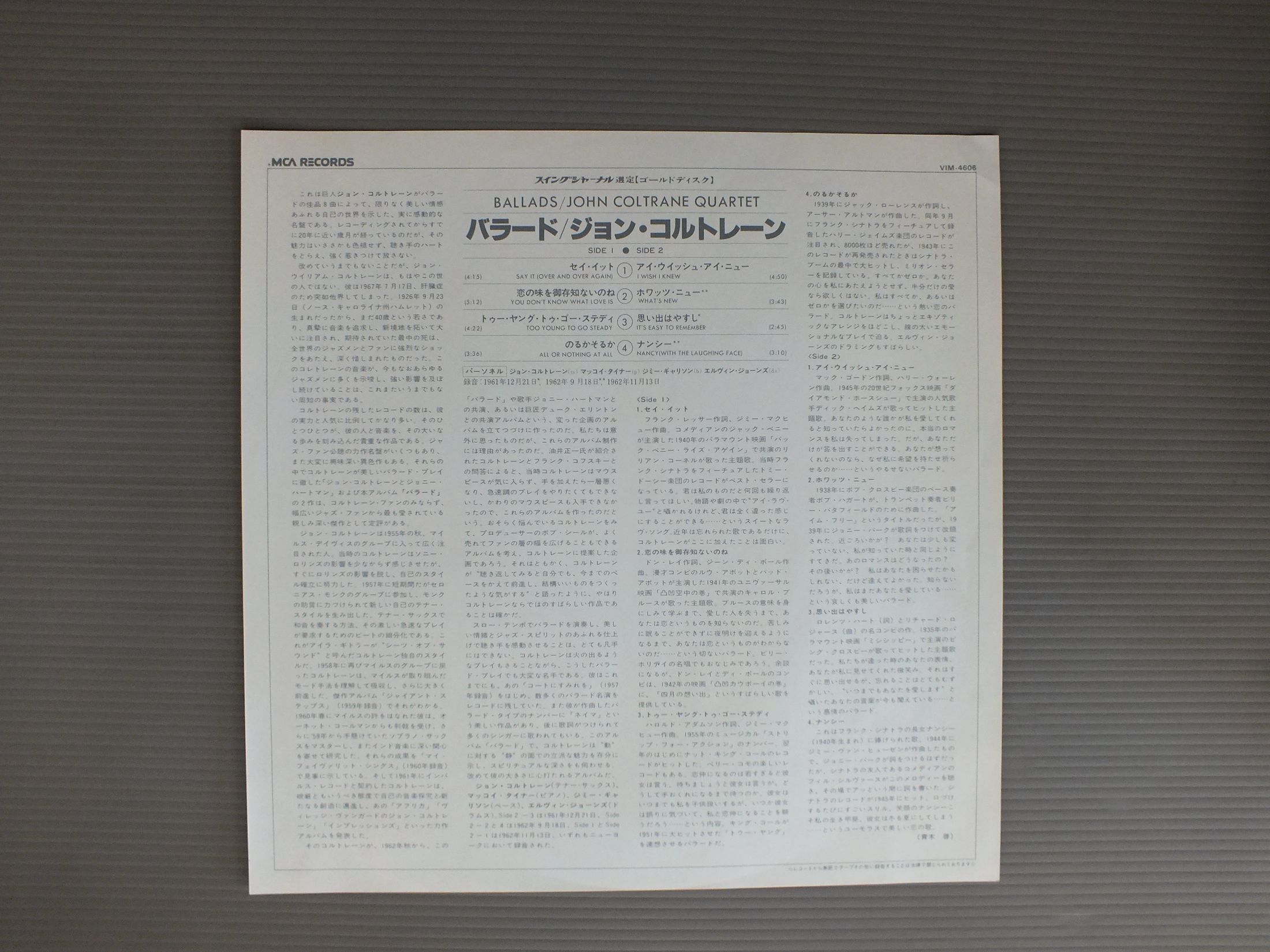 JOHN COLTRANE QUARTETジョン・コルトレーン/BALLADSバラード VIM4606 製造国:日本盤 / Media:LP外観:EX盤の状態:EX 価格(税込):¥1,320(売約済) 送料 7inch:定形外郵便 360円~LP:定形外郵便 660円~送料は、注文の最終画面で確認頂けます。 > > JOHN COLTRANE QUARTET/BALLADS 外観 (EX)特記事項:見開きと裏ジャケにシミやよごれ有り。外観EXの共通説明:ダメージが限定的。中古品としては保存状態がよい方。シミ、ヨゴレ、スレ 少し~軽度。 盤の状態 (EX)特記事項:薄いスリキズ・スレ軽くある感じ。軽微なものの様子です。盤EXの共通説明:盤面のスリキズが薄いものが少し~軽度 音に出そうなものは無いように見える(軽微なソフトティック音は除く)。 Tweet それぞれの画像をクリックすると、大きい写真が見られます こちらの商品もお勧めです 990円 JAY HOGGARDジェイ・ホガード / LOVE SURVIVESラヴ・サーヴァイブズ 660円 EDDIE HEYWOOD / TOUCH OF EDDIE HEYWOOD 990円 ISAO SASAKIイサオ・ササキ / AUTUMN SERENADEオータム・セレナーデ 770円 JACQUES LOUSSIER TRIO - ROYAL PHIL. ORCH.ジャック・ルーシェ・トリオ - ロイヤル・フィルハーモニー管弦楽団 / BACH - BRANDENBURG NO5バッハ - ブランデンブルグ協奏曲第5番 770円 BRUBECK & LAVERNE TRIO / SEE HOW IT FEELS想いのままに 1,210円 ERROLL GARNERエロール・ガーナー / SERENADE TO LAURAセレナード・トゥ・ローラ 660円 JACQUES LOUSSIERジャック・ルーシェ / PLAY BACHプレイ・バッハ 770円 COZY COLE - RED NORVO etcコジー・コール - レッド・ノーヴォ他 / ALL STAR SESSIONSオール・スター・セッション