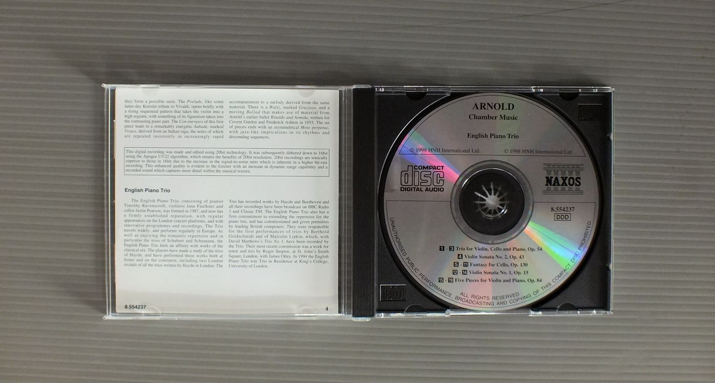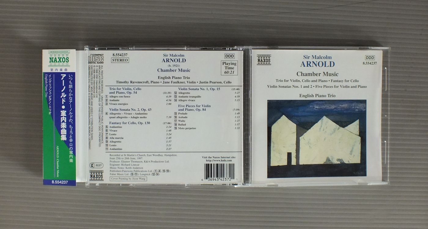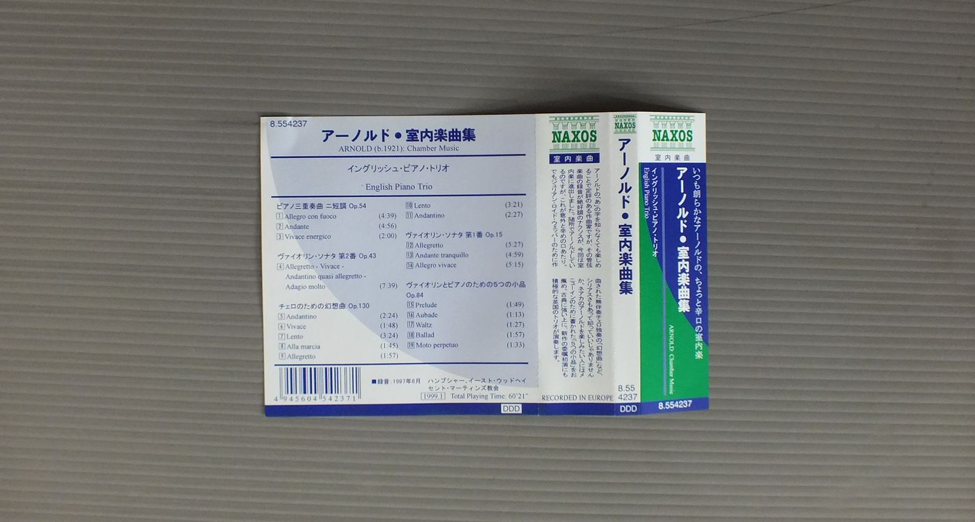 ENGLISH PIANO TRIOイングリッシュ・ピアノ・トリオ/ARNOLD-CHAMBER MUSICアーノルド-室内楽曲集 8.554237 製造国:輸入盤 / Media:CD外観:EX+盤の状態:EX+帯:EX 価格(税込):¥550 送料 7inch:定形外郵便 360円~LP:定形外郵便 660円~送料は、注文の最終画面で確認頂けます。 > > ENGLISH PIANO TRIO/ARNOLD-CHAMBER MUSIC 外観 (EX+)特記事項:特記事項無し。コンディションリスト参照。外観EX+の共通説明:中古としては美品、一見してきれいでダメージが軽微。シミ、ヨゴレ、スレ有っても僅か~少し。 盤の状態 (EX+)特記事項:薄いスリキズ・スレ少し。一見してきれいな状態です。盤EX+の共通説明:盤面の極薄いスリキズ、スレ少し程度 音に出そうなものは無いように見える(極軽微なソフトティック音は除く)。 帯の状態 (EX):裏側に折れ跡。 Tweet それぞれの画像をクリックすると、大きい写真が見られます こちらの商品もお勧めです 2,200円 MENGELBERG / BEETHOVEN LES 9 SYMPHONIES 8LP BOX