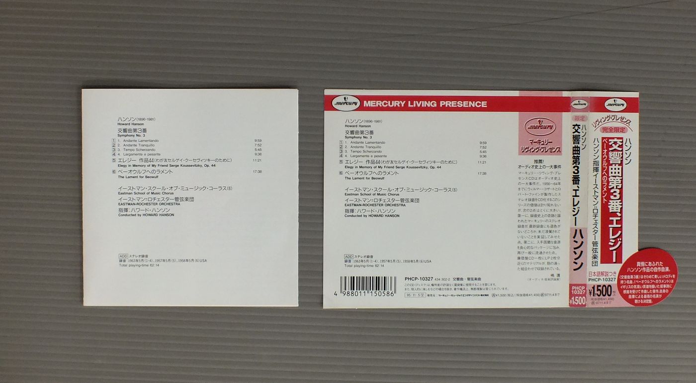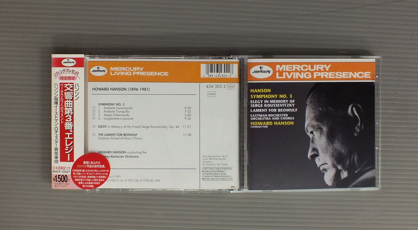 HOWARD HANSONハンソン/SYM. NO3-ELEGY-BEOWULF交響曲第3番-エレジー-ベーオウルフへのラメント PHCP10327 製造国:米国盤 / Media:CD外観:EX+盤の状態:EX+帯:EX 価格(税込):¥1,100 送料 7inch:定形外郵便 360円~LP:定形外郵便 660円~送料は、注文の最終画面で確認頂けます。 > > HOWARD HANSON/SYM. NO3-ELEGY-BEOWULF 外観 (EX+)特記事項:特記事項無し。コンディションリスト参照。外観EX+の共通説明:中古としては美品、一見してきれいでダメージが軽微。シミ、ヨゴレ、スレ有っても僅か~少し。 盤の状態 (EX+)特記事項:薄いスリキズ・スレ少し。一見してきれいな状態です。盤EX+の共通説明:盤面の極薄いスリキズ、スレ少し程度 音に出そうなものは無いように見える(極軽微なソフトティック音は除く)。 帯の状態 (EX):特記事項無し。コンディションリスト参照。 Tweet それぞれの画像をクリックすると、大きい写真が見られます こちらの商品もお勧めです 2,200円 MENGELBERG / BEETHOVEN LES 9 SYMPHONIES 8LP BOX