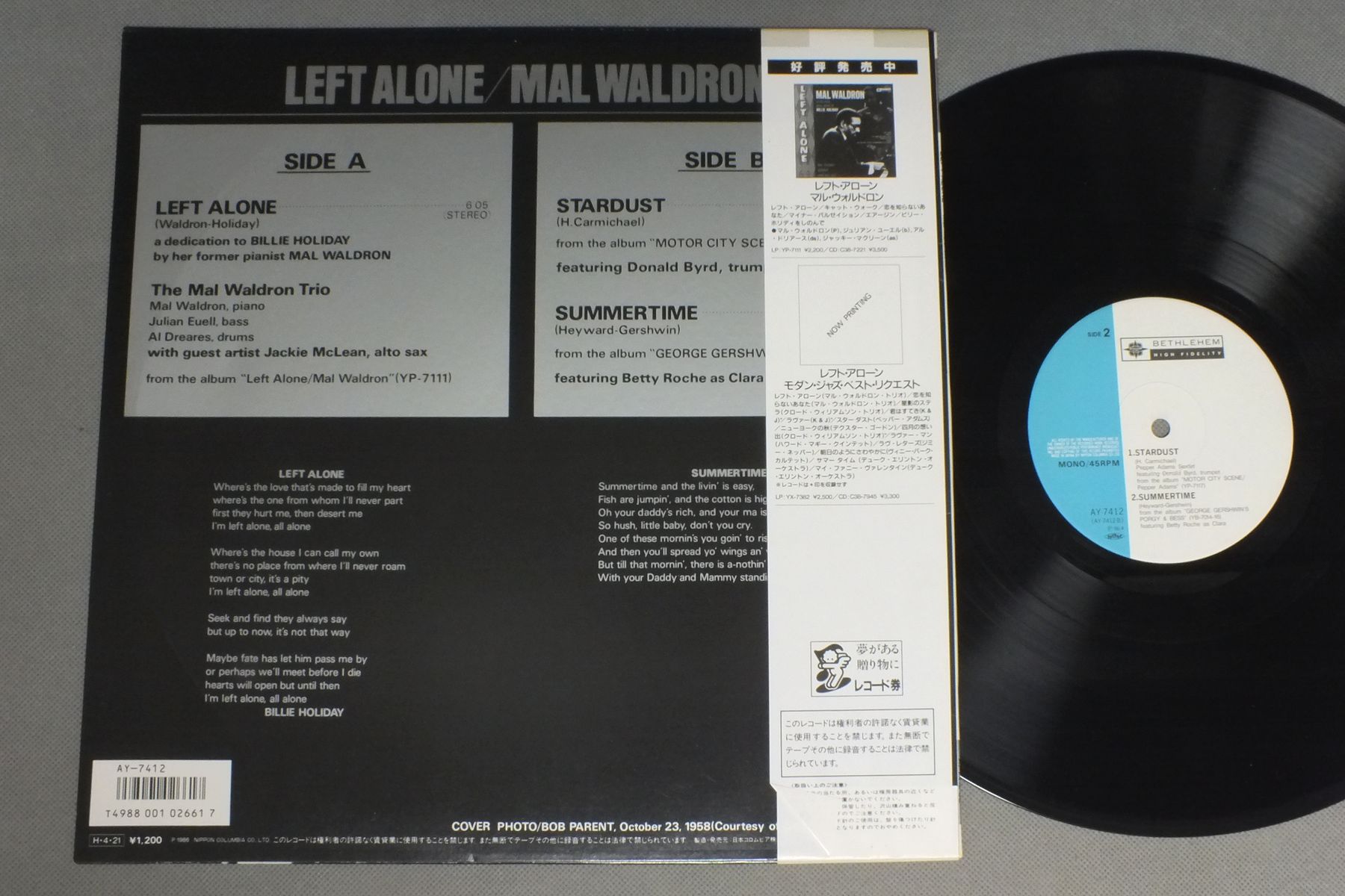 MAL WALDRONマル・ウォルドロン/LEFT ALONEレフト・アローン AY-7412 製造国:日本盤 / Media:12inch外観:EX盤の状態:EX+帯:EX 価格(税込):¥880(売約済) 送料 7inch:定形外郵便 360円~LP:定形外郵便 660円~送料は、注文の最終画面で確認頂けます。 > > MAL WALDRON/LEFT ALONE 外観 (EX)特記事項:レコードリングスレやスリキズが少し。外観EXの共通説明:ダメージが限定的。中古品としては保存状態がよい方。シミ、ヨゴレ、スレ 少し~軽度。 盤の状態 (EX+)特記事項:薄いスリキズ・スレ少し。一見してきれいな状態です。盤EX+の共通説明:盤面の極薄いスリキズ、スレ少し程度 音に出そうなものは無いように見える(極軽微なソフトティック音は除く)。 帯の状態 (EX):表側にシミわずかに有り。 Tweet それぞれの画像をクリックすると、大きい写真が見られます こちらの商品もお勧めです 1,650円 MASARU IMADA今田勝 / MINT BREEZEミント・ブリーズ 1,210円 JACK SHELDON & HIS WEST COAST FRIENDSジャック・シェルドンとヒズ・ウェスト・コースト・フレンズ / ANGEL WINGSエンジェル・ウィングス 770円 TEDDY WILSONテディ・ウイルソン / NOBLE ART OF TEDDY WILSONノーブル・アート・オブ・テディ・ウイルソン 440円 HERB ALPERT & TIJUANA BRASS / BRASS ARE COMIN` 1,210円 DUKE ELLINGTON WITH JIMMY JONESデューク・エリントン & ジミー・ジョーンズ / DUKE ELLINGTON`S MY PEOPLEマイ・ピープル 1,210円 WILLIE SMITH - JESS STACY - JOE SULLIVANジェス・ステイシー - ウィリイ・スミス - ジョー・サリバン / CHAIRMEN OF THE BOARD VOL2ピアノ・ジャズの競演 第2集 1,650円 MASARU IMADA今田勝 / DAY IN THE PARADISEコーラルの涙 660円 SADAO WATANABE渡辺貞夫 / CALIFORNIA SHOWERカリフォルニア・シャワー