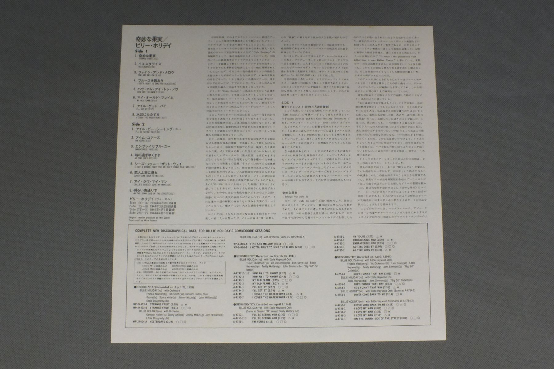 BILLIE HOLIDAYビリー・ホリデイ/GREATEST INTERPRETATIONS OF BILLIE HOLIDAY奇妙な果実 K23P-6611 製造国:日本盤 / Media:LP外観:EX盤の状態:EX+ 価格(税込):¥1,155(売約済) 送料 7inch:定形外郵便 360円~LP:定形外郵便 660円~送料は、注文の最終画面で確認頂けます。 > > BILLIE HOLIDAY/GREATEST INTERPRETATIONS OF BILLIE HOLIDAY 外観 (EX)特記事項:裏ジャケにシミが少し。外観EXの共通説明:ダメージが限定的。中古品としては保存状態がよい方。シミ、ヨゴレ、スレ 少し~軽度。 盤の状態 (EX+)特記事項:薄いスリキズ・スレ少し。一見してきれいな状態です。盤EX+の共通説明:盤面の極薄いスリキズ、スレ少し程度 音に出そうなものは無いように見える(極軽微なソフトティック音は除く)。 Tweet それぞれの画像をクリックすると、大きい写真が見られます こちらの商品もお勧めです 770円 PEGGY LEEペギー・リー / CRAZY IN THE HEART乱るる心 770円 BRENDA LEEブレンダ・リー / NEW EXCELLENTニュー・エクセレント 440円 BING CROSBYビング・クロスビー / BING CROSBY GOLDEN DISC追悼盤 440円 MARI NAKAMOTO中本マリ / APHORODITEアフロディーの祈り 1,320円 SAMMY DAVIS JR & CARMEN MCRAEサミー・ディヴィス・ジュニア & カーメン・マクレエ / BOY MEETS GIRLボーイ・ミーツ・ガール 1,210円 CLEO LAINEクレオ・レーン / BORN ON A FRIDAY金曜日のクレオ 770円 BUDDY GRECOバディ・グレコ / HERE`S BUDDY GRECOヒアーズ・バディ・グレコ 1,320円 BUDDY GRECOバディ・グレコ / AT MISTER KELLY`Sアット・ミスター・ケリーズ