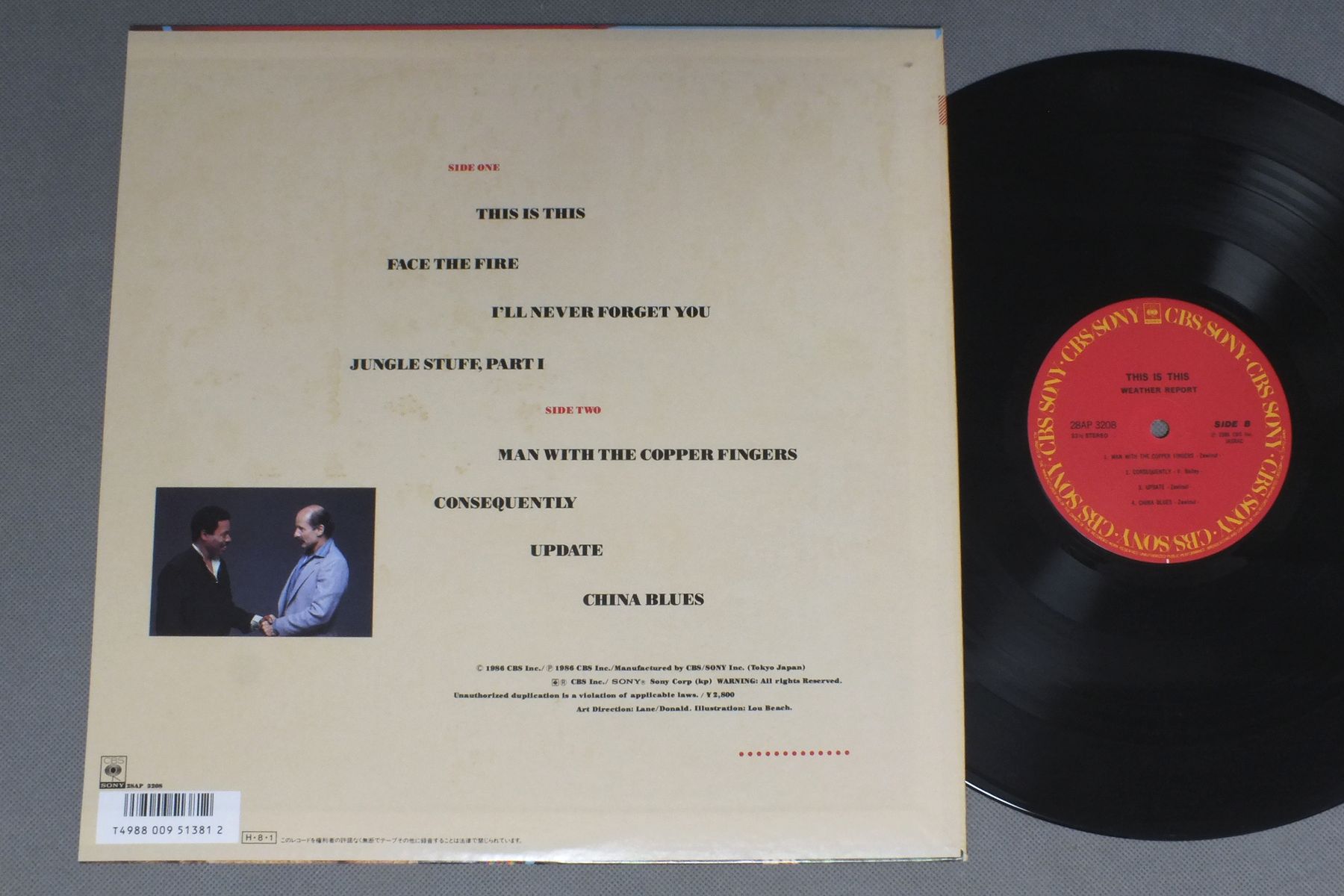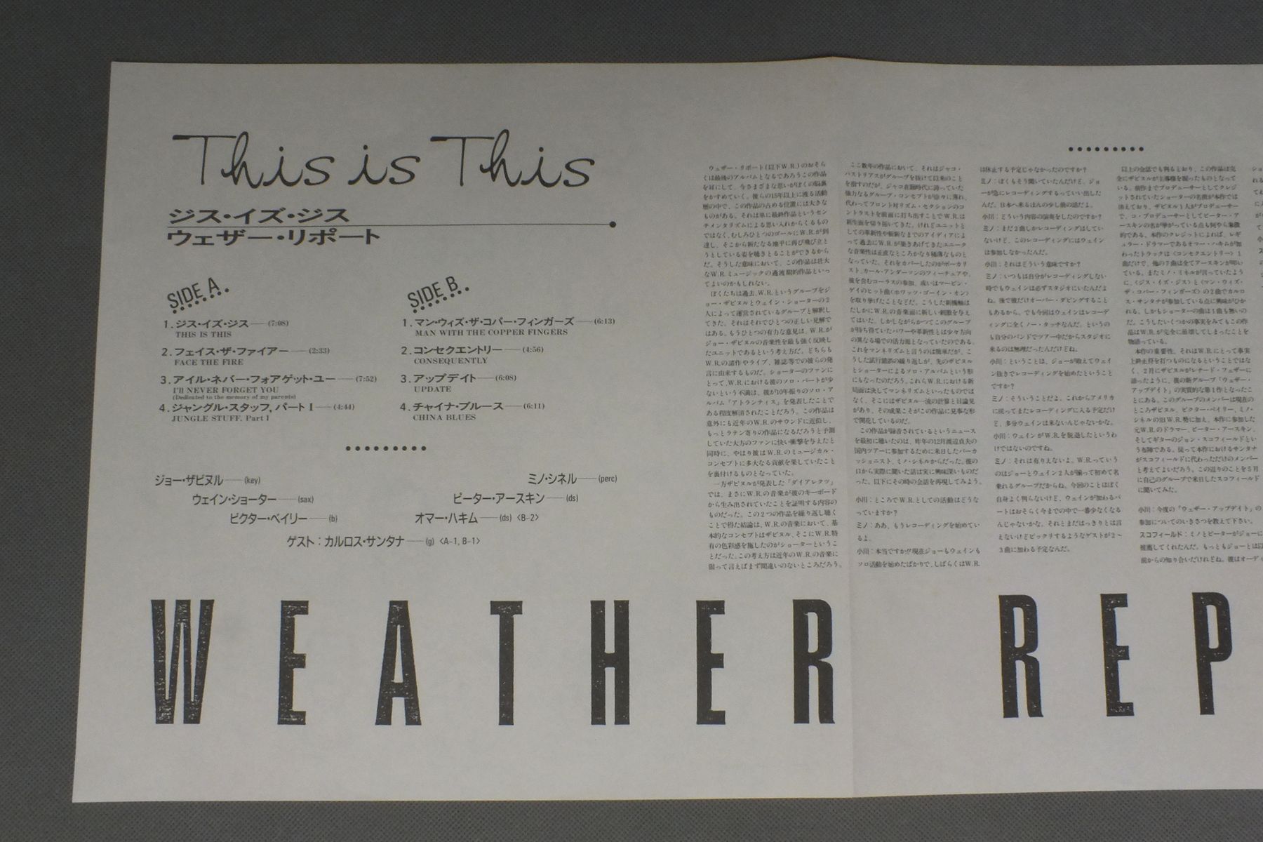 WEATHER REPORTウェザー・リポート/THIS IS THISジス・イズ・ジス 28AP 3208 製造国:日本盤 / Media:LP外観:EX-盤の状態:EX+ 価格(税込):¥924(売約済) 送料 7inch:定形外郵便 360円~LP:定形外郵便 660円~送料は、注文の最終画面で確認頂けます。 > > WEATHER REPORT/THIS IS THIS 外観 (EX-)特記事項:ジャケ表面にシミやよごれ有り。外観EX-の共通説明:ダメージ軽度~多少。 中古品としては普通の状態。シミ、ヨゴレ、スレなど軽く~多少。 盤の状態 (EX+)特記事項:薄いスリキズ・スレ少し。一見してきれいな状態です。盤EX+の共通説明:盤面の極薄いスリキズ、スレ少し程度 音に出そうなものは無いように見える(極軽微なソフトティック音は除く)。 Tweet それぞれの画像をクリックすると、大きい写真が見られます こちらの商品もお勧めです 1,650円 ALBERT AYLERアルバート・アイラー / VOLUME 1ラスト・レコーディング VOL1 770円 ERROLL GARNER-ARCHIE SHEPP etc / SAVOY 100 ALUMS-SPECIAL MENUサヴォイ・スペシャル・メニュー 770円 EDDIE JEFFERSONエディ・ジェファーソン / LETTER FROM HOMEレター・フロム・ホーム 1,320円 GREAT JAZZ TRIOグレート・ジャズ・トリオ / AT THE VILLAGE VANGUARD VOL2アット・ザ・ヴィレッジ・ヴァンガードVOL2 1,650円 TATSUYA TAKAHASHI&TOKYO UNION ORCH.高橋達也と東京ユニオン / SWING ON SWINGスイング・オン・スイング 770円 TONY SCOTT QUINTETトニー・スコット・クワルテット / TONY SCOTT QUINTET 1,210円 LENNY WHITEレニー・ホワイト / STREAMLINEストリームライン 1,320円 MONTY ALEXANDER TRIOモンティ・アレキサンダー / MONTREUX ALEXANDERアット・モントルー