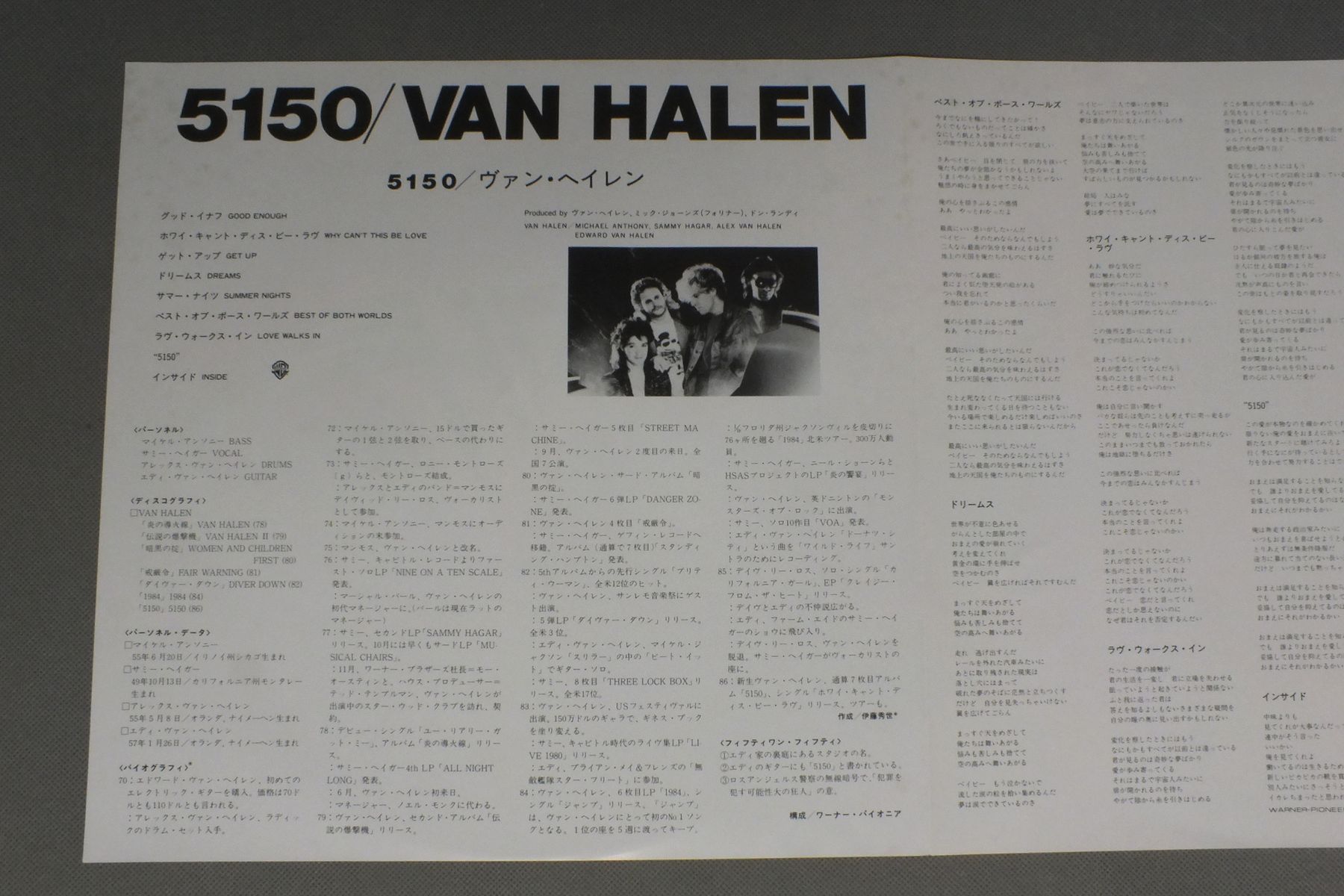 VAN HALENヴァン・ヘイレン/51505150 P-13285 製造国:日本盤 / Media:LP外観:EX盤の状態:EX+ 価格(税込):¥1,155(売約済) 送料 7inch:定形外郵便 360円~LP:定形外郵便 660円~送料は、注文の最終画面で確認頂けます。 > > VAN HALEN/5150 外観 (EX)特記事項:特記なし。外観EXの共通説明:ダメージが限定的。中古品としては保存状態がよい方。シミ、ヨゴレ、スレ 少し~軽度。 盤の状態 (EX+)特記事項:薄いスリキズ・スレ少し。一見してきれいな状態です。盤EX+の共通説明:盤面の極薄いスリキズ、スレ少し程度 音に出そうなものは無いように見える(極軽微なソフトティック音は除く)。 Tweet それぞれの画像をクリックすると、大きい写真が見られます こちらの商品もお勧めです 770円 NIGHT RANGERナイト・レンジャー / DAWN PATROL緊急指令 660円 ANGELエンジェル / ANGEL 1,320円 NIGHT RANGERナイト・レンジャー / MIDNIGHT MADNESSミッドナイト・マッドネス 770円 TED NUGENTテッド・ニュージェント / DOUBLE LIVE GONZO絶叫のライブ・ゴンゾー 770円 IAN GILLAN BANDイアン・ギラン・バンド / LIVE AT THE BUDOKANライブ・イン・ジャパン 1,980円 MACHAEL SCHENKER GROOPマイケル・シェンカー・グループ / MSG神話 1,320円 MICHAEL SCHENKER GROUPマイケル・シェンカー・グループ / 1st ALBUM神(帰ってきたフライング・アロウ 2,200円 KEELキール / FINAL FRONTIERファイナル・フロンティア