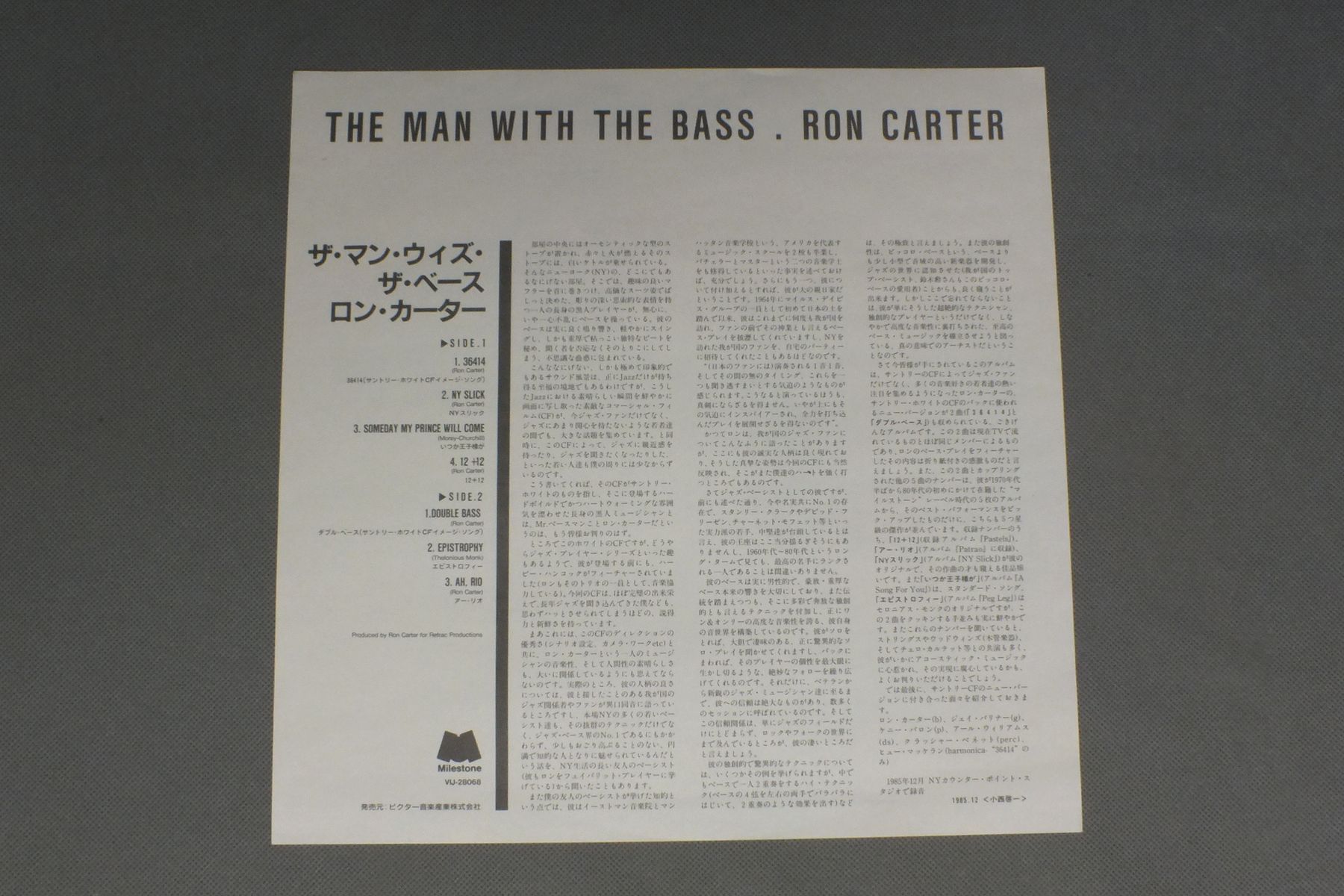RON CARTERロン・カーター/MAN WITH THE BASSマン・ウィズ・ザ・ベース VIJ-28068 製造国:日本盤 / Media:LP外観:EX盤の状態:EX+ 価格(税込):¥1,155(売約済) 送料 7inch:定形外郵便 360円~LP:定形外郵便 660円~送料は、注文の最終画面で確認頂けます。 > > RON CARTER/MAN WITH THE BASS 外観 (EX)特記事項:特記なし。外観EXの共通説明:ダメージが限定的。中古品としては保存状態がよい方。シミ、ヨゴレ、スレ 少し~軽度。 盤の状態 (EX+)特記事項:薄いスリキズ・スレ少し。一見してきれいな状態です。盤EX+の共通説明:盤面の極薄いスリキズ、スレ少し程度 音に出そうなものは無いように見える(極軽微なソフトティック音は除く)。 Tweet それぞれの画像をクリックすると、大きい写真が見られます こちらの商品もお勧めです 1,210円 BUD POWELL TRIOバド・パウエル・トリオ / ROOST SESSION BEST 6-VOL.1バド・パウエルの芸術 770円 TEDDY WILSONテディ・ウイルソン / NOBLE ART OF TEDDY WILSONノーブル・アート・オブ・テディ・ウイルソン 1,320円 HERBIE MANNハービー・マン楽団 / ST.THOMAS 60s ISSUEセント・トーマス ペラジャケ 1,210円 RAY BROWN & MILT JACKSONレイ・ブラウンとミルト・ジャクソン / BROWN & JACKSON 1,210円 SONY CLARK TRIOソニー・クラーク・トリオ / SAME TITLEソニー・クラーク・トリオ 990円 TAL FARLOWタル・ファーロウ / SWINGINNG GUITARスウィンギング・ギター 770円 RON CARTERロン・カーター / ANYTHING GOESエニシング・ゴーズ 770円 ERROLL GARNER-ARCHIE SHEPP etc / SAVOY 100 ALUMS-SPECIAL MENUサヴォイ・スペシャル・メニュー