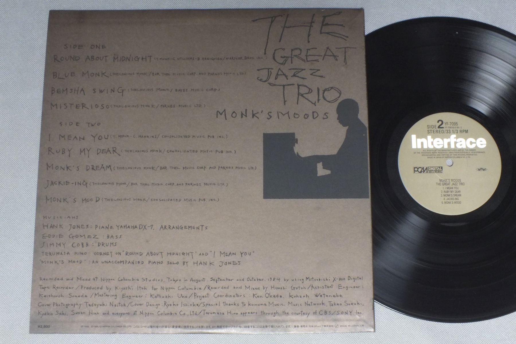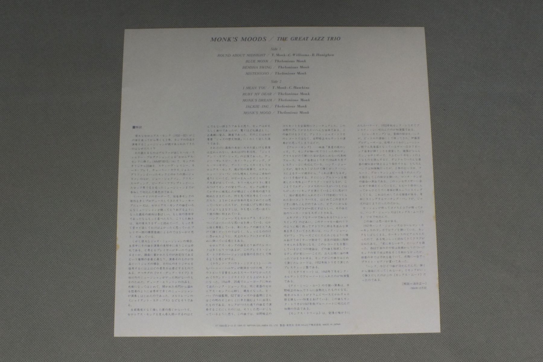 GREAT JAZZ TRIOグレート・ジャズ・トリオ/MONK`S MOODS YF-7095 製造国:日本盤 / Media:LP外観:EX盤の状態:EX 価格(税込):¥1,650(売約済) 送料 7inch:定形外郵便 360円~LP:定形外郵便 660円~送料は、注文の最終画面で確認頂けます。 > > GREAT JAZZ TRIO/MONK`S MOODS 外観 (EX)特記事項:特記なし。外観EXの共通説明:ダメージが限定的。中古品としては保存状態がよい方。シミ、ヨゴレ、スレ 少し~軽度。 盤の状態 (EX)特記事項:薄いスリキズ・スレ軽くある感じ。軽微なものの様子です。盤EXの共通説明:盤面のスリキズが薄いものが少し~軽度 音に出そうなものは無いように見える(軽微なソフトティック音は除く)。 Tweet それぞれの画像をクリックすると、大きい写真が見られます こちらの商品もお勧めです 880円 HARRIS SIMON GROUPハリス・サイモン・グループ / NEW YORK CONNECTIONニューヨーク・コネクション 660円 EDDIE HEYWOOD / TOUCH OF EDDIE HEYWOOD 770円 THAD JONES & MEL LEWISサド・ジョーンズ & メル・ルイス / LIVE IN TOKYOライブ・イン・東京 770円 BUDDY GRECOバディ・グレコ / BIG BAND&BALLADSビッグ・バンド・アンド・バラード 1,210円 STUFFスタッフ / LIVE STUFFライヴ・スタッフ 990円 CHARLIE PARKERチャーリー・パーカー / CHARLIE PARKER ON SAVOY VOL4チャーリー・パーカー・オン・サヴォイVOL4 1,320円 CHARLIE MINGUSチャーリー・ミンガス / PITHECANTHROPUS ERECTUS直立猿人 1,210円 CLIFORD BROWN ALL STARSクリフォード・ブラウン・オール・スターズ / CARAVAN AUTUMN IN NEW YORKキャラバン