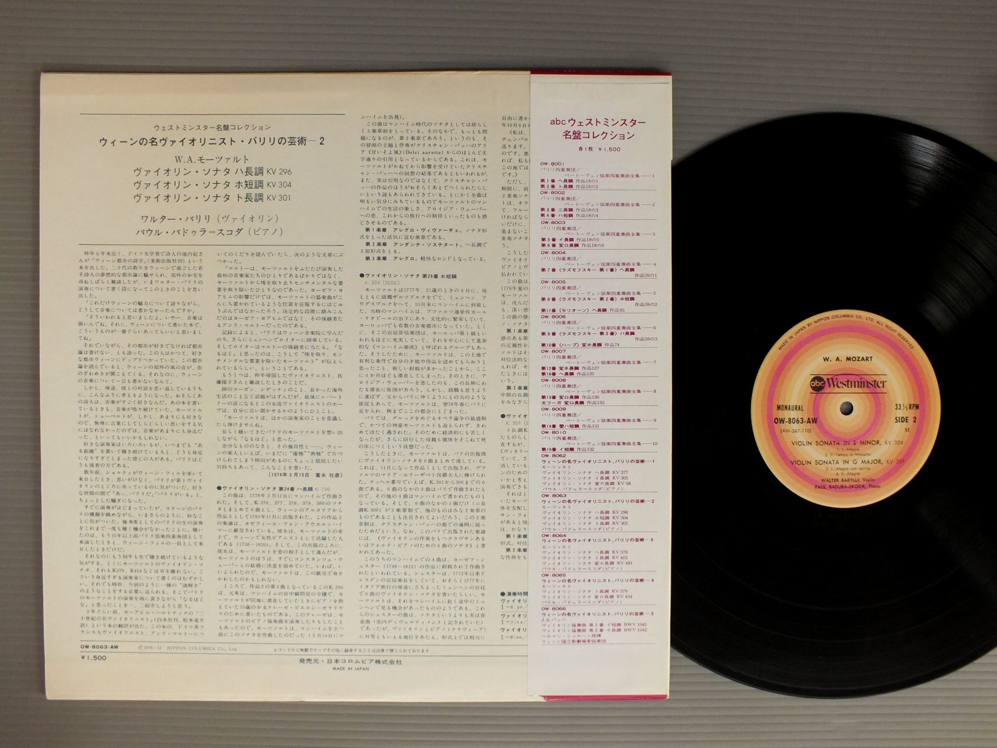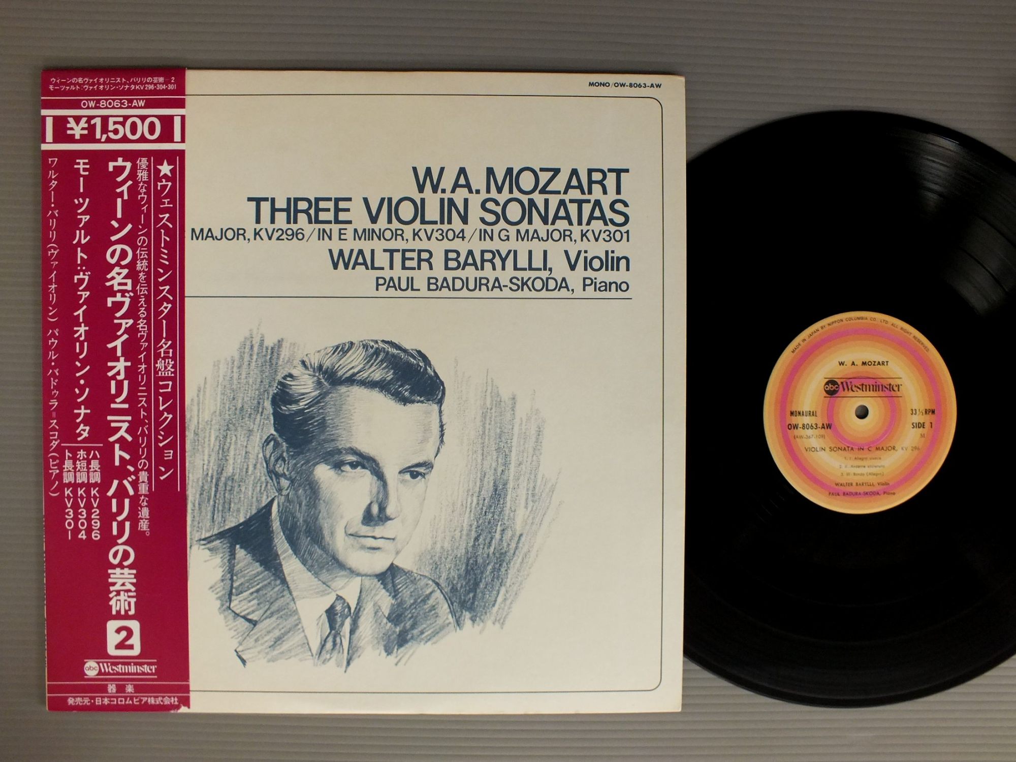 WALTER BARYLLI-PAUL BADURA-SKODAワルター・バリリ-パウル・バドゥラ=スコダ/MOZART-VIOLIN SONATAS KV296-304-301W.A.モーツァルト-ヴァイオリン・ソナタ KV296-304-301 OW8063AW 製造国:日本盤 / Media:LP外観:EX盤の状態:EX帯:EX- 価格(税込):¥2,298(売約済) 送料 7inch:定形外郵便 360円~LP:定形外郵便 660円~送料は、注文の最終画面で確認頂けます。 > > WALTER BARYLLI-PAUL BADURA-SKODA/MOZART-VIOLIN SONATAS KV296-304-301 外観 (EX)特記事項:特記なし。外観EXの共通説明:ダメージが限定的。中古品としては保存状態がよい方。シミ、ヨゴレ、スレ 少し~軽度。 盤の状態 (EX)特記事項:薄いスリキズ・スレ軽くある感じ。軽微なものの様子です。盤EXの共通説明:盤面のスリキズが薄いものが少し~軽度 音に出そうなものは無いように見える(軽微なソフトティック音は除く)。 帯の状態 (EX-):底に切れ有り。 Tweet それぞれの画像をクリックすると、大きい写真が見られます こちらの商品もお勧めです 990円 LARROCHAラローチャ / ALBENIZ/IBERIA NAVARRA/CANTOS DE ESPANAアルベニス/組曲イベリア ナバーラ/スペインの歌 990円 HOROWITZホロヴィッツ / HOROWITZ ENCORESホロヴィッツ・アンコール 990円 ESCHENBACH - FRANZエッシェンバッハ -フランツ / MOZART - SONATA FOR TWO PIANOSモーツァルト - 2台のピアノのためのソナタ 1,980円 MARIKO HAYASHI林まり子 / THREE FANTASIES3つの幻想曲 990円 INGRID HAEBLERイングリット・へプラー / MOZART - PIANO SONATAモーツアルト - ピアノ・ソナタ集 990円 INGRID HAEBLERイングリット・ヘブラー / MOZART - PIANO SONATA NO 2 etcモーツァルト - ピアノ・ソナタ第2番他 990円 FRANCOISフランソワ / BEST OF CHOPINショパン珠玉集 990円 JIRI REINBERGERイルジー・ラインベルガー / BACH - TOCCATA&FUGUEバッハ - トッカータとフーガ