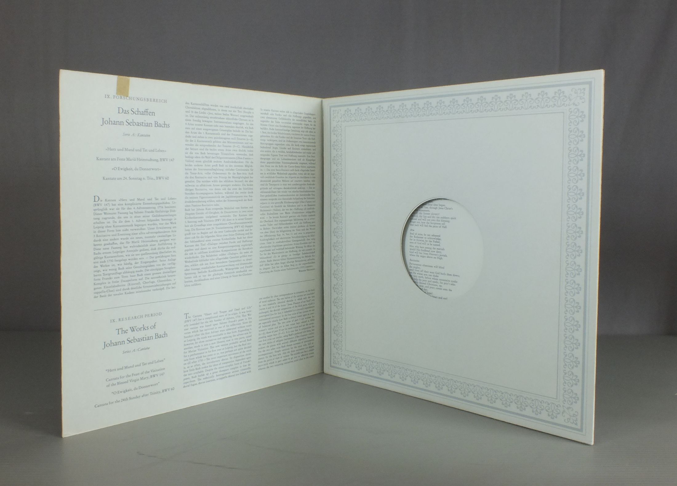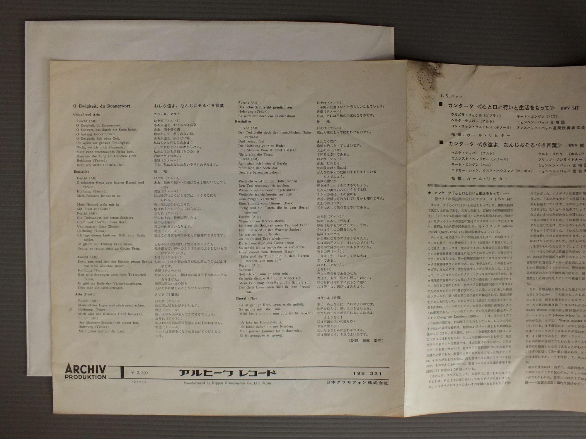RICHTERカール・リヒター/BACH-KANTATEN BWV147-BWV60バッハ-カンタータ BWV147-BWV60 198 331 製造国:独盤 / Media:LP外観:EX盤の状態:EX 価格(税込):¥1,155(売約済) 送料 7inch:定形外郵便 360円~LP:定形外郵便 660円~送料は、注文の最終画面で確認頂けます。 > > RICHTER/BACH-KANTATEN BWV147-BWV60 外観 (EX)特記事項:背やジャケ表面にシミやよごれ。見開きにテープ跡。外観EXの共通説明:ダメージが限定的。中古品としては保存状態がよい方。シミ、ヨゴレ、スレ 少し~軽度。 盤の状態 (EX)特記事項:薄いスリキズ・スレ軽くある感じ。軽微なものの様子です。盤EXの共通説明:盤面のスリキズが薄いものが少し~軽度 音に出そうなものは無いように見える(軽微なソフトティック音は除く)。 Tweet それぞれの画像をクリックすると、大きい写真が見られます こちらの商品もお勧めです 880円 DAME JOAN HAMMOND / ART OF DAME JOAN HAMMOND 1,320円 FLAGSTAD-McARTHURフラグスタート-マクァーサー / GRIEG-HAUGTUSSA-SINDING SONGSグリーグ-シンディング・リサイタル 880円 NILS GREVILLIUS-JUSSI BJOERLING / OPERA ARIAS 1,430円 JANET BAKER / MOZART-ARIAS D`OPERAS 2,420円 RENATA TEBALDI / RENATA TEBALDI EIN PORTRAIT 2,200円 MARIA CALLAS / PUCCINI ARIAS D`OPERAS 1,430円 ERICH LEINSDORF - LEONTYNE PRICE - PLACIDO DOMINGO - SHERRILL MILNES / VERDI - AIDA 1,430円 SCHREIER / BACH BWV215