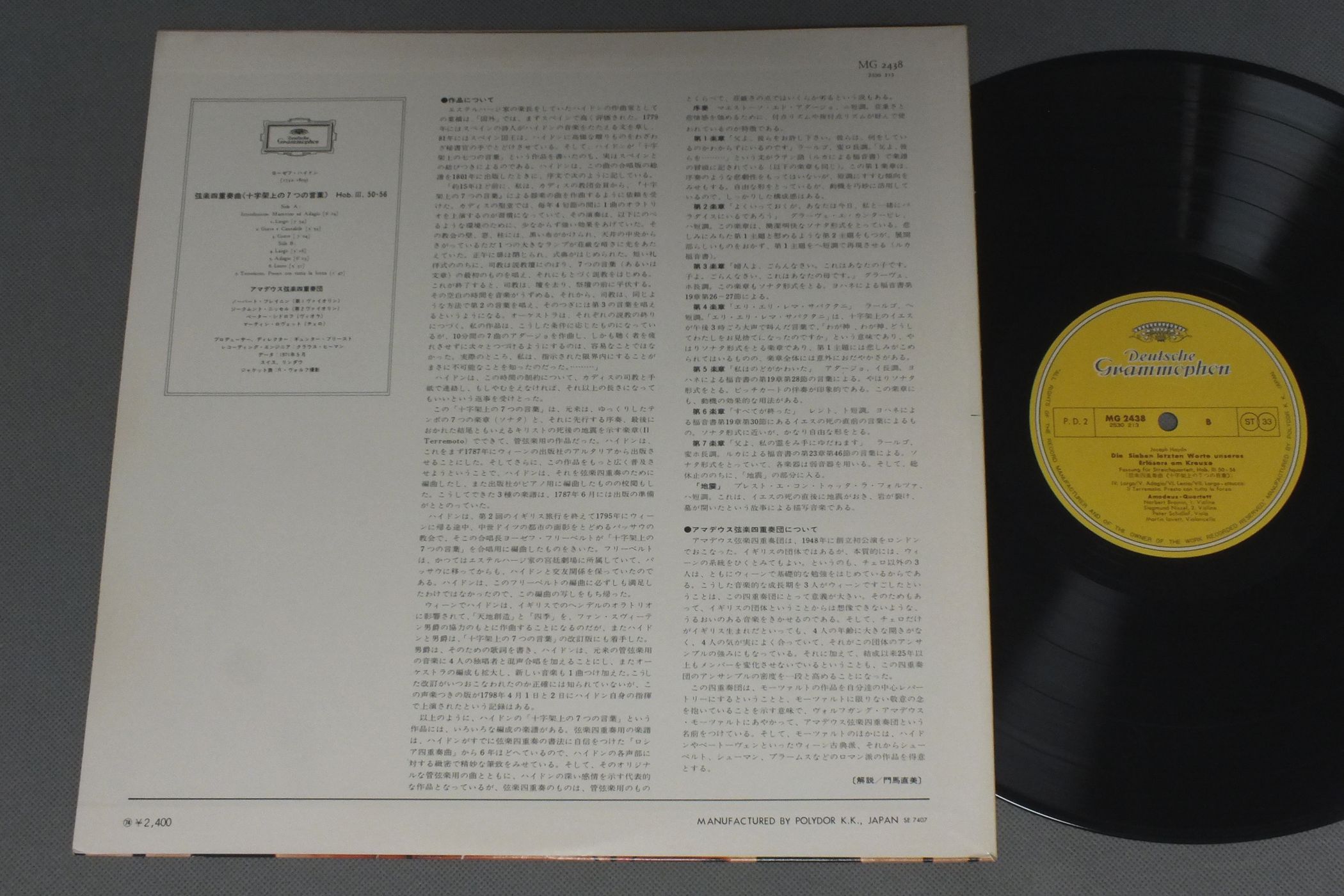 AMADEUS Qアマデウス弦楽四重奏団/HAYDN SIEBEN LETZTEN WORTE UNSERES ERLOSERS AM KREUZEハイドン 十字架上の7つの言葉 MG 2438 製造国:日本盤 / Media:LP外観:EX盤の状態:EX+ 価格(税込):¥1,320(売約済) 送料 7inch:定形外郵便 360円~LP:定形外郵便 660円~送料は、注文の最終画面で確認頂けます。 > > AMADEUS Q/HAYDN SIEBEN LETZTEN WORTE UNSERES ERLOSERS AM KREUZE 外観 (EX)特記事項:特記なし。外観EXの共通説明:ダメージが限定的。中古品としては保存状態がよい方。シミ、ヨゴレ、スレ 少し~軽度。 盤の状態 (EX+)特記事項:薄いスリキズ・スレ少し。一見してきれいな状態です。盤EX+の共通説明:盤面の極薄いスリキズ、スレ少し程度 音に出そうなものは無いように見える(極軽微なソフトティック音は除く)。 Tweet それぞれの画像をクリックすると、大きい写真が見られます こちらの商品もお勧めです 990円 GINES ROMANヒネス・ロマン / EL MISATERIO DE ELCHEエルチェの神秘劇 990円 WUNDERLICH-GIESENヴンダーリッヒ-ギーゼン / LIEDERABEND MIT FRITZ WUNDERLICHヴンダーリッヒ-リート・リサイタル 990円 FREMAUXフレモー / FAURE-REQUIEMフォーレ-レクイエム 1,760円 KIYOSHI IGARASHI五十嵐喜芳 / FAMOUS OPERANTIC ARIAS五十嵐喜芳のすべて`5` 女心の歌-オペラ・アリア集 1,320円 KARAJAN - VIENNA PHIL.カラヤン - ウィーン・フィル / VERDI - OTELLO (HIGHLIGHTS)ヴェルディ - オテロ 1,210円 ALFRED DELLERアルフレッド・デラ― - 二―ル・ジェンキンス - モーリス・ベーバン他 / WILLIAM BYRD - MASS FOR 3 4 & 5 VOICES 3LP BOX SETウィリアム・バード - 三声部 四声部 五声部のミサ曲 - モテトゥス集 3枚組 1,430円 WUNDERLICH - GRAUNKE SYMPHONY ORCHESTRAフリッツ・ヴンダーリッヒ / O SOLE MIOオ・ソレ・ミオ 990円 RICHTERカール・リヒター / MOZART-REQUIEM K626モーツァルト-死者のためのミサ曲 K626