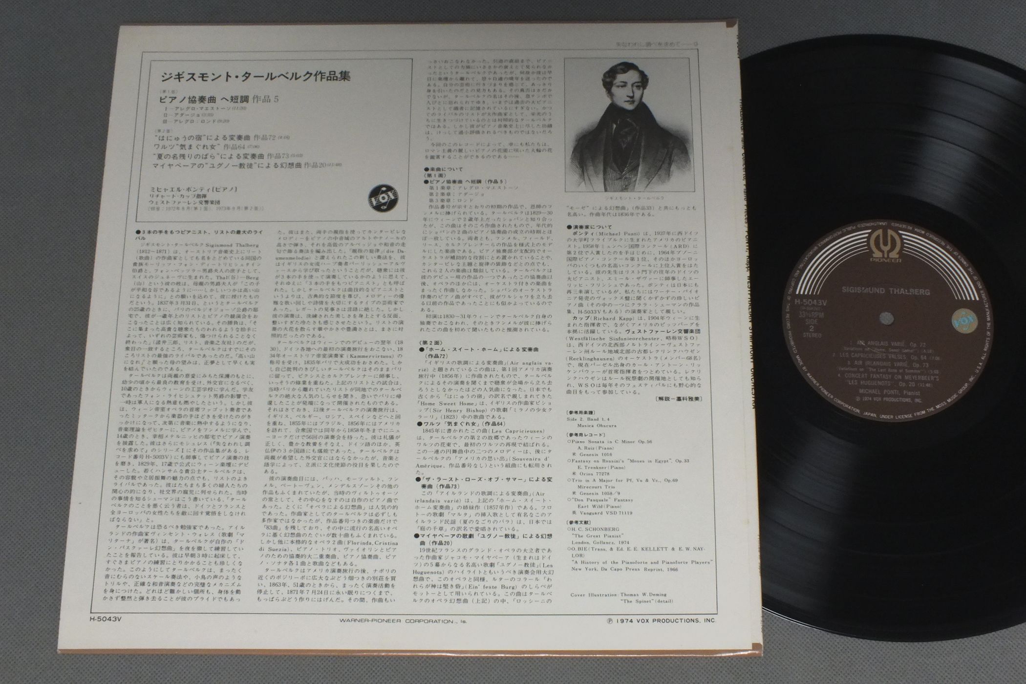 PONTI-KAPPポンティ-カップ/THALBERG PIANO CONC. PIANO PIECESジギスモント・タールベルク作品集 H-5043V 製造国:日本盤 / Media:LP外観:EX盤の状態:EX+ 価格(税込):¥990 送料 7inch:定形外郵便 360円~LP:定形外郵便 660円~送料は、注文の最終画面で確認頂けます。 > > PONTI-KAPP/THALBERG PIANO CONC. PIANO PIECES 外観 (EX)特記事項:上ヘリにスレ。表ジャケ上ヘリ周辺に日焼け退色。外観EXの共通説明:ダメージが限定的。中古品としては保存状態がよい方。シミ、ヨゴレ、スレ 少し~軽度。 盤の状態 (EX+)特記事項:薄いスリキズ・スレ少し。一見してきれいな状態です。盤EX+の共通説明:盤面の極薄いスリキズ、スレ少し程度 音に出そうなものは無いように見える(極軽微なソフトティック音は除く)。 Tweet それぞれの画像をクリックすると、大きい写真が見られます こちらの商品もお勧めです 1,540円 M. MIYAZAWA宮沢明子 / YOSHINAO NAKADA-SUITE FOR PIANO TIME-LIGHT&SHADOW中田喜直-ピアノのための組曲 時間-光と影 880円 AKIRA YUYAMA / SUNDAY SONATINA日曜日のソナチネ 1,320円 AKIRA MIYOSHI-AKIO YASHIRO三善晃 矢代秋雄 / QUATUOR A CORDES NO.1弦楽四重奏曲第1番 1,760円 SEIJI OZAWA小沢征爾 / SCHOENBERG-GURRELIEDERシェーンベルク-グレの歌 1,650円 SHINYA KOIDE-RYU NOGUCHI-AKIO YASHIRO小出信也-野口龍-矢代秋雄 / AKIO YASHIRO-QUATUOR A CORDES-SONATE POUR PIANO-SONATE POUR 2 FLUTES ET PIANO矢代秋雄--ピアノ・ソナタ-2本のフルートとピアノのためのソナタ 1,540円 ENSEMBLE INSTRUMENTAL DE TOULOUSEトゥールーズ管楽器合奏団 / ENSEMBLE INSTRUMENTAL DE TOULOUSE現代管楽器名曲集 2,090円 OZAWA - JAPAN PHILHARMONIC SYM. ORCH.小沢征爾 - 日本フィル / TORU TAKEMITSU - CASSIOPEIA武満徹 - カシオペア 1,760円 NOBUAKI - TANAKA - TOKYO MIXED CHORUS田中信昭 - 東京混声合唱団 / MICHIO MAMIYA WORKS ( CONTEMPORARY JAPANESE CHORUS )間宮芳生作品集 オンゴー・オーニ他