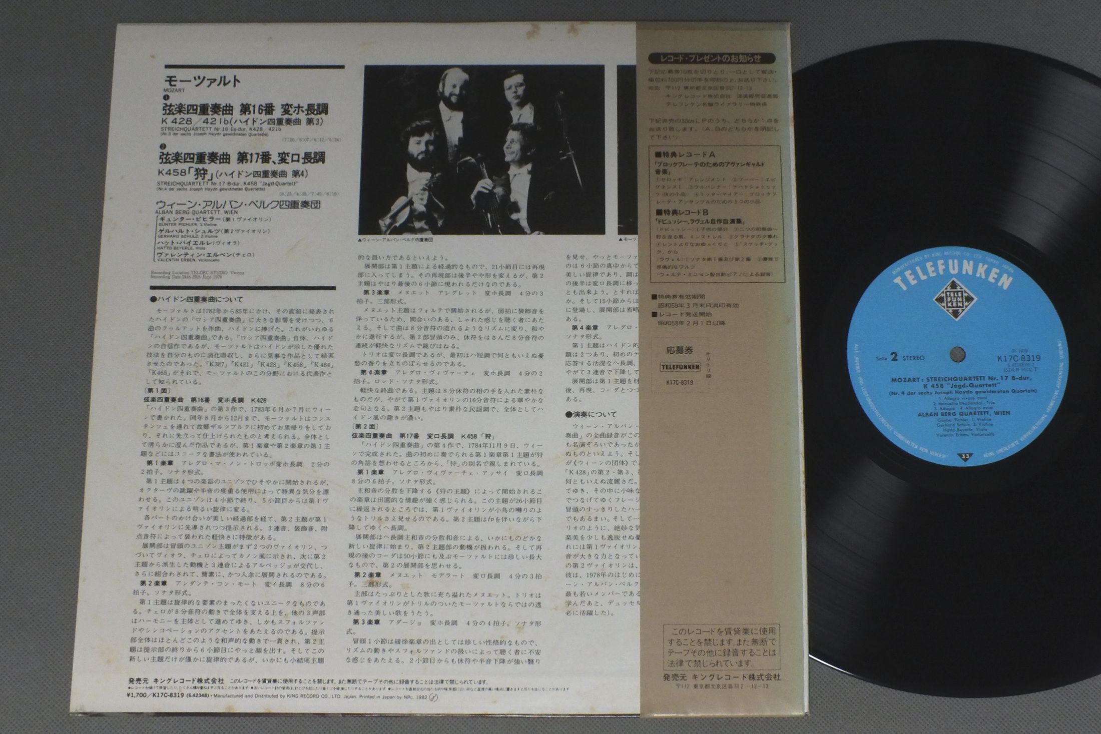 ALBAN BERG QUARTETT WIENウィーン・アルバン・ベルク四重奏団/MOZART STREICHQUARTETT NR 16 ES-DURモ−ツァルト・ 第16番-第17番`狩` K17C-8319 製造国:日本盤 / Media:LP外観:VG+盤の状態:EX帯:EX 価格(税込):¥550(売約済) 送料 7inch:定形外郵便 360円~LP:定形外郵便 660円~送料は、注文の最終画面で確認頂けます。 > > ALBAN BERG QUARTETT WIEN/MOZART STREICHQUARTETT NR 16 ES-DUR 外観 (VG+)特記事項:ジャケ表面にシミやよごれ有り。外観VG+の共通説明:ダメージやや有り。シミ、ヨゴレ、スレなど多少~やや多め。 盤の状態 (EX)特記事項:薄いスリキズ・スレ軽くある感じ。軽微なものの様子です。盤EXの共通説明:盤面のスリキズが薄いものが少し~軽度 音に出そうなものは無いように見える(軽微なソフトティック音は除く)。 帯の状態 (EX):シミやよごれ有り。 Tweet それぞれの画像をクリックすると、大きい写真が見られます こちらの商品もお勧めです 990円 BOHM - VPOボーム - ウィーン・フィル / BRAHMS SYM NO3ブラームス交響曲第3番 1,320円 KARAJAN - VIENNA PHIL.カラヤン - ウィーン・フィル / MOZART - SYM. NO40 & 41モーツァルト 交響曲第40 & 41番 990円 KARAJANカラヤン / HAYDN SYM.S NOS103-104ハイドン 交響曲 103番 変`太鼓連打`-交響曲 第104番 `ロンドン` 990円 KAREL ANCERLカレル・アンチェル / STRAVINSKY-SACRE DU PRINTEMPSストラヴィンスキー-春の祭典 990円 ANSERMET - L`ORCHESTRE DE LA SUISSE ROMANDEアンセルメ - スイス・ロマンド管弦楽団 / ANSERMET CONDUCTS RAVELアンセルメ・ラヴェル名演集 990円 STEIN - VIENNA PHILHARMONIC ORCHESTRAシュタイン - ウィーン・フィル / WEBER - SYMPHONY NO1舞踏への勧誘 1,210円 RUBINSTEINルービンシュタイン / CHOPIN - SHUMANN - LISZT PIANO CONCERTO三大ピアノ協奏曲 1,320円 KEMPFF - KEMPEN - BERLIN PHILHARMONIC ORCHESTRAケンプ - ケンペン - ベルリンフィルハーモニー管弦楽団 / BEETHOVEN - PIANO CONCERT NO.1ベートーヴェン - ピアノ協奏曲第1番