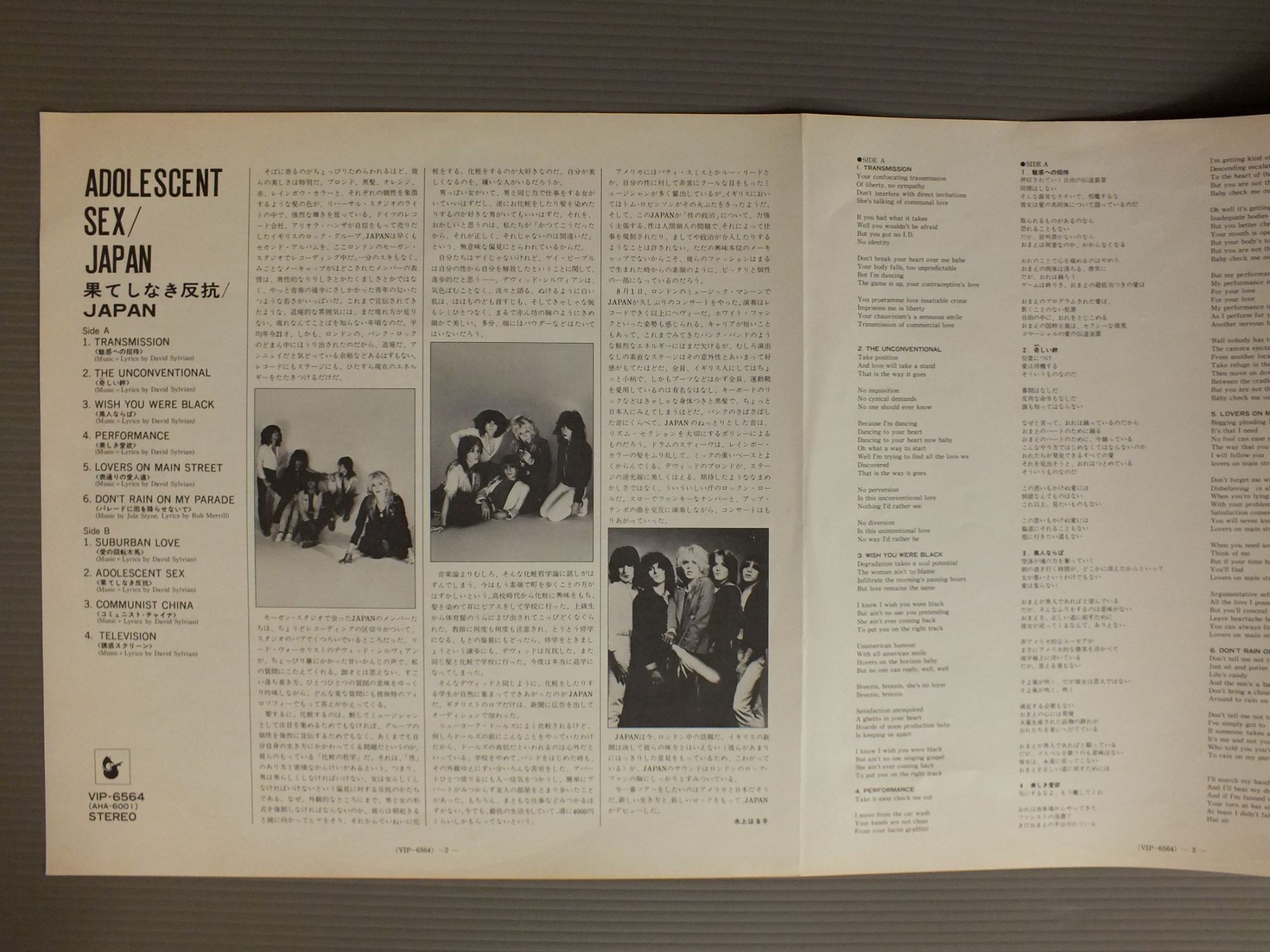 JAPANジャパン/ADORESCENT SEX果てしなき反抗 VIP6564 製造国:日本盤 / Media:LP外観:EX盤の状態:EX+帯:EX- 価格(税込):¥1,980(売約済) 送料 7inch:定形外郵便 360円~LP:定形外郵便 660円~送料は、注文の最終画面で確認頂けます。 > > JAPAN/ADORESCENT SEX 外観 (EX)特記事項:特記なし。外観EXの共通説明:ダメージが限定的。中古品としては保存状態がよい方。シミ、ヨゴレ、スレ 少し~軽度。 盤の状態 (EX+)特記事項:薄いスリキズ・スレ少し。一見してきれいな状態です。盤EX+の共通説明:盤面の極薄いスリキズ、スレ少し程度 音に出そうなものは無いように見える(極軽微なソフトティック音は除く)。 帯の状態 (EX-):上角に切れとテープ補修。 Tweet それぞれの画像をクリックすると、大きい写真が見られます こちらの商品もお勧めです 440円 HIPSWAYヒップスウェイ / HIPSWAYヒップスウェイ 1,210円 OXOオクソ / 1st ALBUMオクソ 440円 GLASS TIGERグラス・タイガー / DIAMOND SUNダイヤモンド・サン 1,210円 GO WESTゴー・ウェスト / MORE BANGS & CRASHESモア・バン ! アンド・クラッシュ ! 770円 MEN AT WORKメン・アット・ワーク / BUSINESS AS USUALワーク・ソングズ 440円 TAXXIタクシー / STATES OF EMERGENCY緊急発進 ! 440円 WILD BLUEワイルド・ブルー / NO MORE JINXノー・モア・ジンクス 550円 HUNG CHUNGワン・チャン / HUNG CHUNGダンス・ホール・デイズ