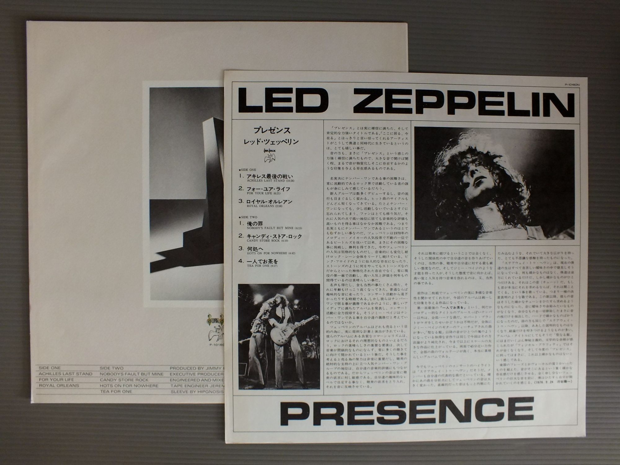 LED ZEPPELINレッド・ツェッペリン/PRESENCEプレゼンス P10160N 製造国:日本盤 / Media:LP外観:EX+盤の状態:EX+帯:EX 価格(税込):¥2,750(売約済) 送料 7inch:定形外郵便 360円~LP:定形外郵便 660円~送料は、注文の最終画面で確認頂けます。 > > LED ZEPPELIN/PRESENCE 外観 (EX+)特記事項:特記なし。外観EX+の共通説明:中古としては美品、一見してきれいでダメージが軽微。シミ、ヨゴレ、スレ有っても僅か~少し。 盤の状態 (EX+)特記事項:薄いスリキズ・スレ少し。一見してきれいな状態です。盤EX+の共通説明:盤面の極薄いスリキズ、スレ少し程度 音に出そうなものは無いように見える(極軽微なソフトティック音は除く)。 帯の状態 (EX):裏側に小さなシミ。 Tweet それぞれの画像をクリックすると、大きい写真が見られます こちらの商品もお勧めです 1,980円 ROBERT PLANTロバート・プラント / PICTURE AT ELEVEN11時の肖像