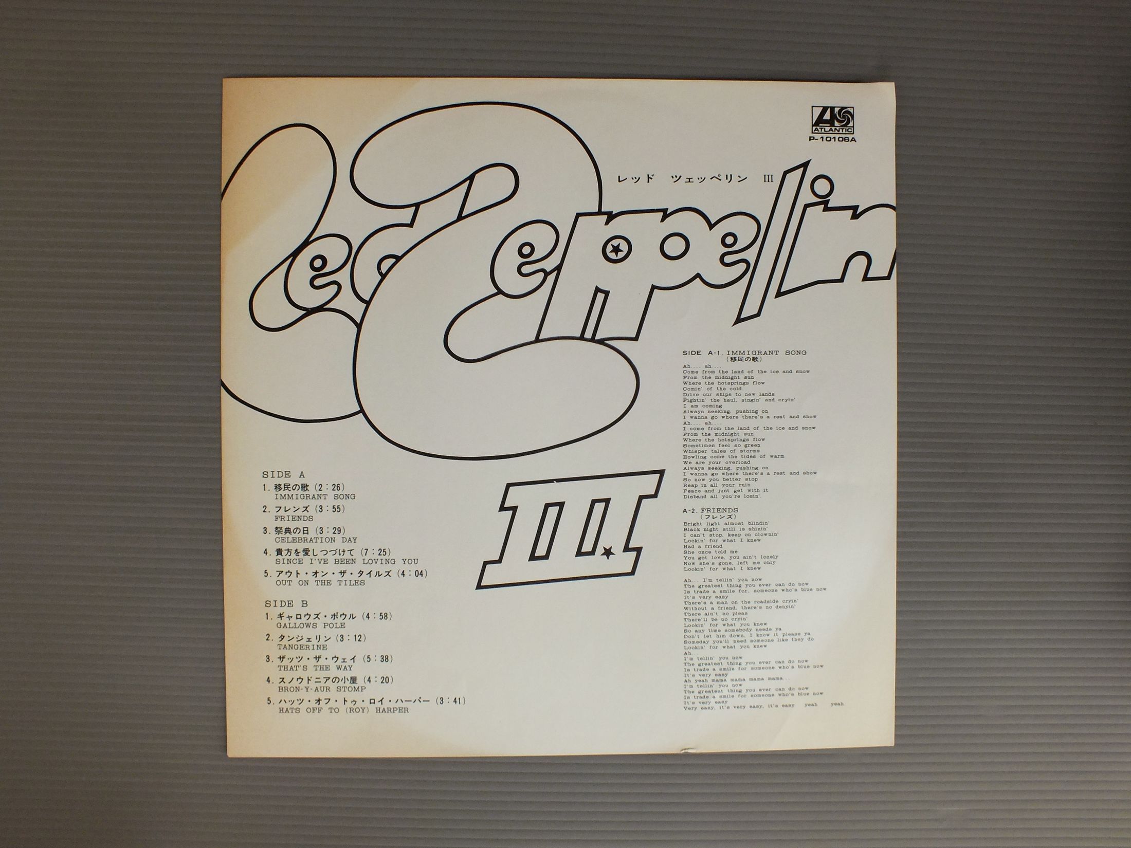 LED ZEPPELINレッド・ツェッペリン/LED ZEPPELIN IIIレッド・ツェッペリンIII P10106A 製造国:日本盤 / Media:LP外観:EX盤の状態:EX+帯:EX 価格(税込):¥2,200(売約済) 送料 7inch:定形外郵便 360円~LP:定形外郵便 660円~送料は、注文の最終画面で確認頂けます。 > > LED ZEPPELIN/LED ZEPPELIN III 外観 (EX)特記事項:ポスターの付属は有りません。外観EXの共通説明:ダメージが限定的。中古品としては保存状態がよい方。シミ、ヨゴレ、スレ 少し~軽度。 盤の状態 (EX+)特記事項:薄いスリキズ・スレ少し。一見してきれいな状態です。盤EX+の共通説明:盤面の極薄いスリキズ、スレ少し程度 音に出そうなものは無いように見える(極軽微なソフトティック音は除く)。 帯の状態 (EX):特記なし。 Tweet それぞれの画像をクリックすると、大きい写真が見られます こちらの商品もお勧めです 1,980円 ROBERT PLANTロバート・プラント / PICTURE AT ELEVEN11時の肖像