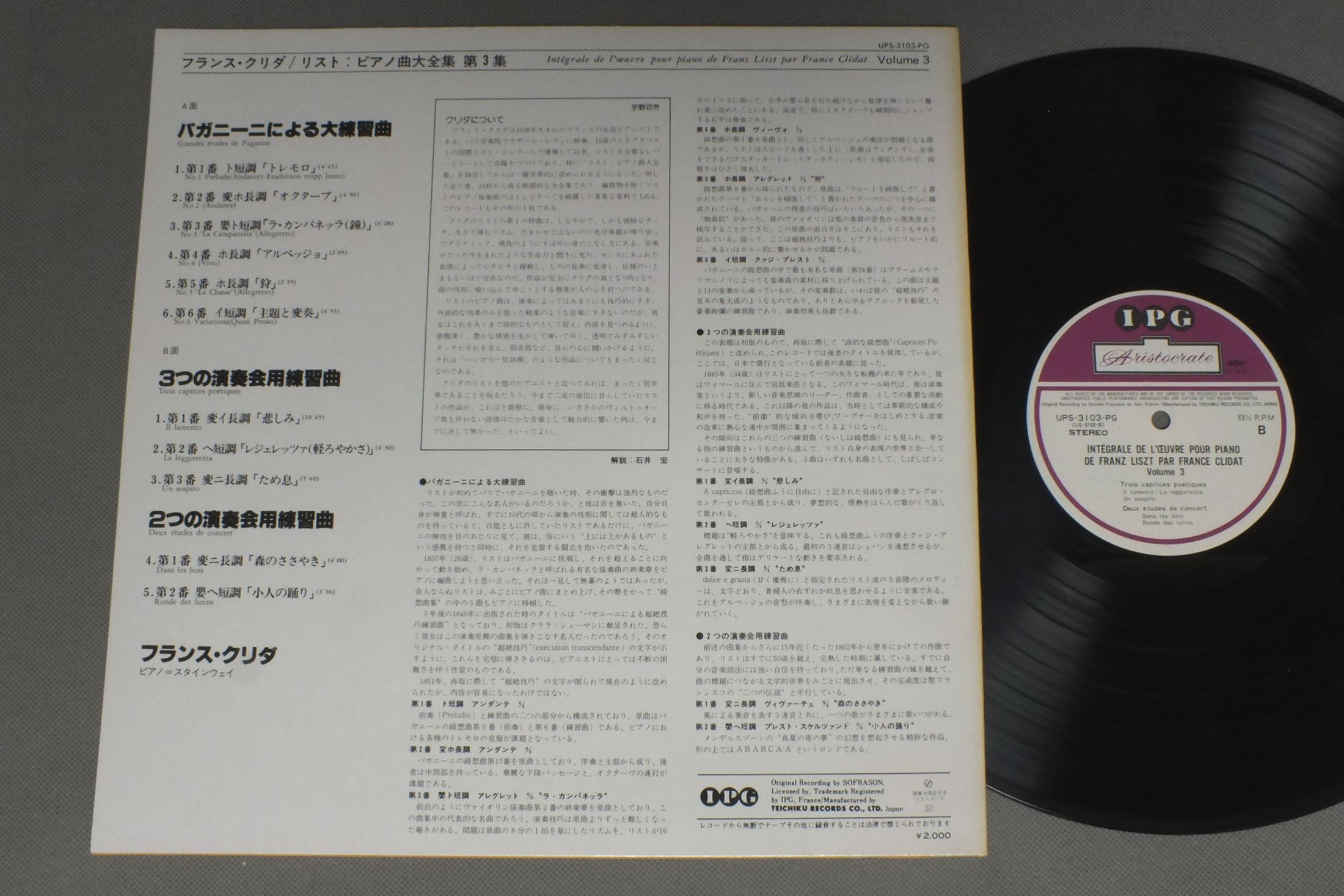 FRANCE CLIDATフランス・クリダ/GRANDES ETUDES DE PAGANINIパガニーニによる大練習曲 他 UPS-3103-PG 製造国:日本盤 / Media:LP外観:EX盤の状態:EX+ 価格(税込):¥990 送料 7inch:定形外郵便 360円~LP:定形外郵便 660円~送料は、注文の最終画面で確認頂けます。 > > FRANCE CLIDAT/GRANDES ETUDES DE PAGANINI 外観 (EX)特記事項:背焼け有り外観EXの共通説明:ダメージが限定的。中古品としては保存状態がよい方。シミ、ヨゴレ、スレ 少し~軽度。 盤の状態 (EX+)特記事項:薄いスリキズ・スレ少し。一見してきれいな状態です。盤EX+の共通説明:盤面の極薄いスリキズ、スレ少し程度 音に出そうなものは無いように見える(極軽微なソフトティック音は除く)。 Tweet それぞれの画像をクリックすると、大きい写真が見られます こちらの商品もお勧めです 990円 GULDAグルダ / MOZART BEETHOVEN QUINTET FOR PIANO OBOE CLARINET HORN & BASSOONモーツァルト ベートーヴェン ピアノ五重奏曲 990円 GALWAY-BAUMGARTNERゴールウェイ-バウムガルトナー / MOZART-EINE KLEINE NACHTMUSIK etcモーツァルト-アイネ・クライネ・ナハトムジーク ほか 990円 NAOTAKA NISHIDA & NAOYUKI INOUE西田直孝&井上直幸 / DUO RECITALデュオ・リサイタル 1,320円 JAN PANENKA - MEMBERS OF THE SMETANA QUARTETヤン・パネンカ - スメタナ四重奏団員 / SCHUBERT - TROUTシューベルト - ピアノ五重奏曲 ます 990円 AURELE NICOLETオーレル・ニコレ / DIE KUNST DES AURELE NICOLETオーレル・ニコレの芸術-1 770円 QUATUOR INSTRUMENTAL MAXENCE LARRIEUマクサンス・ラリュー四重奏団 / CONCERT AU CHATEAU DE SAN-SOUCI A POTSDAMポツダムのサン=スーシ宮における音楽会 770円 PAILLARDパイヤール - パイヤール室内管弦楽団 / HAENDEL - WATER MUSICヘンデル -水上の音楽原典版 1,320円 BARYLLI - BADURA-SKODAバリリ & バドゥラ=スコダ / MOZRAT - VIOLIN SONATA NO24 & 28モーツアルト - ヴァイオリン・ソナタ第24番28番41番
