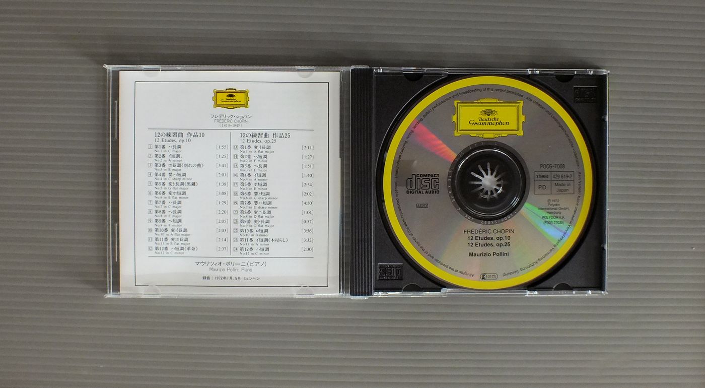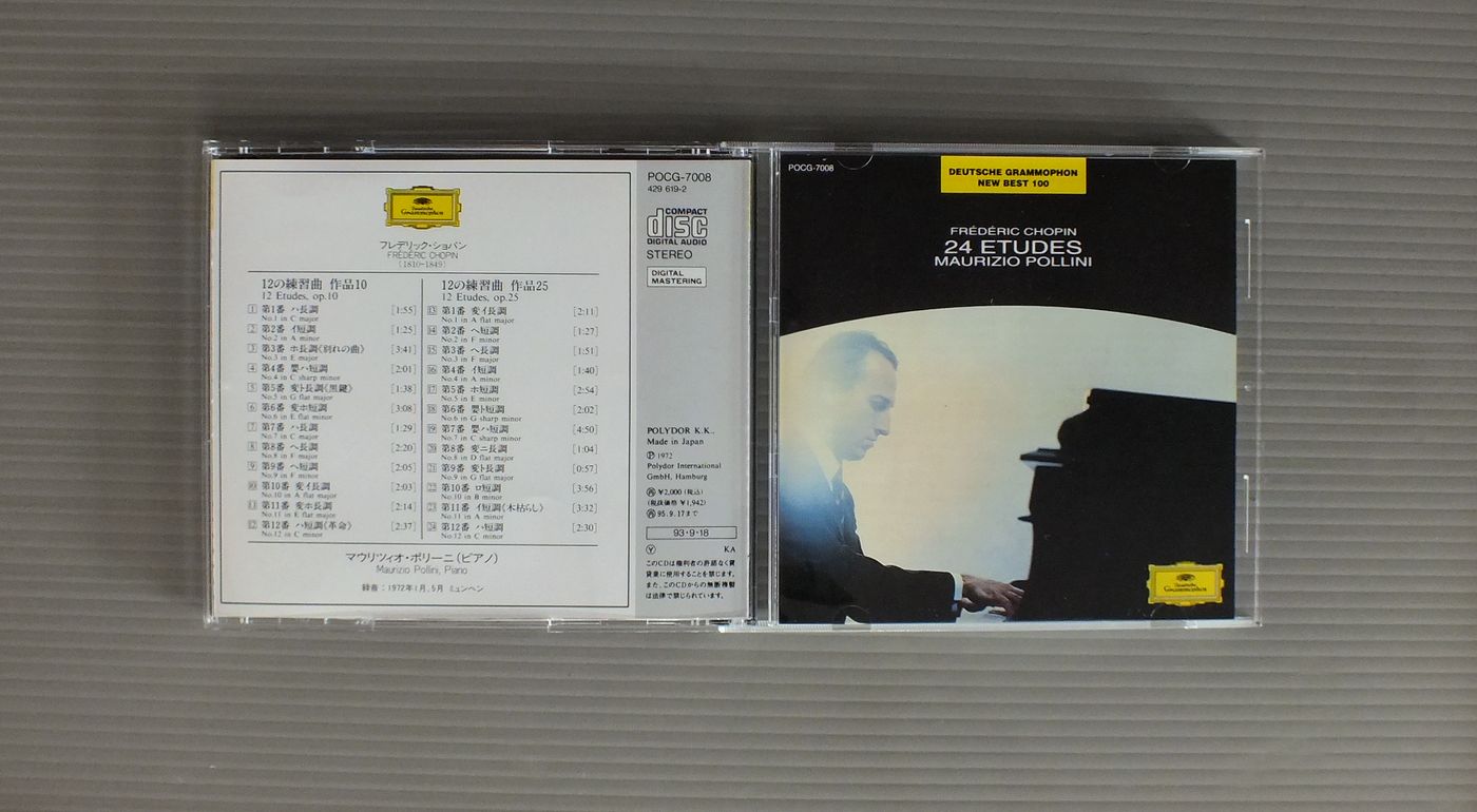 POLLINIマウリツィオ・ポリーニ/CHOPIN-ETUDES OP10-25ショパン-12の練習曲 -25 POCG7008 製造国:日本盤 / Media:CD外観:EX盤の状態:EX+ 価格(税込):¥660 送料 7inch:定形外郵便 360円~LP:定形外郵便 660円~送料は、注文の最終画面で確認頂けます。 > > POLLINI/CHOPIN-ETUDES OP10-25 外観 (EX)特記事項:特記事項無し。コンディションリスト参照。外観EXの共通説明:ダメージが限定的。中古品としては保存状態がよい方。シミ、ヨゴレ、スレ 少し~軽度。 盤の状態 (EX+)特記事項:薄いスリキズ・スレ少し。一見してきれいな状態です。盤EX+の共通説明:盤面の極薄いスリキズ、スレ少し程度 音に出そうなものは無いように見える(極軽微なソフトティック音は除く)。 Tweet それぞれの画像をクリックすると、大きい写真が見られます こちらの商品もお勧めです 990円 WEISSENBERGワイセンベルク / BACH - PARTITAS VOL.2バッハ - パルティータ第2番5番6番 990円 HOROVITZホロヴィッツ / BEETHOVEN - APPASSIONATA WALDSTEINベートーベン - ピアノ・ソナタ21番23番 990円 LANDOWSKA - KREISLER - RACHMANINOV etcランドフスカ - クライスラー - ラフマニノフ他 / FAMOUS INSTRUMENTALISTS OF THE EARLY 20th器楽奏者の巨匠たち 1,760円 KAZUNE SHIMIZU清水和音 / CHOPIN - 4 BALLADESショパン - バラード 990円 KARL RICHTERカール・リヒター / BACH - TOCCATA AND FUGUEバッハ - トッカータとフーガ 1,540円 WANDA LANDOWSKAワンダ・ランドフスカ / ARTISTRY OF WANDA LANDOWSKA 990円 GARRICK OHLSSONギャリック・オールソン / CHOPIN - POLONAISESショパン - ポロネーズ 1,100円 ASHKENAZYアシュケナージ / CHOPIN - PIANO WORKSショパン - 夜想曲