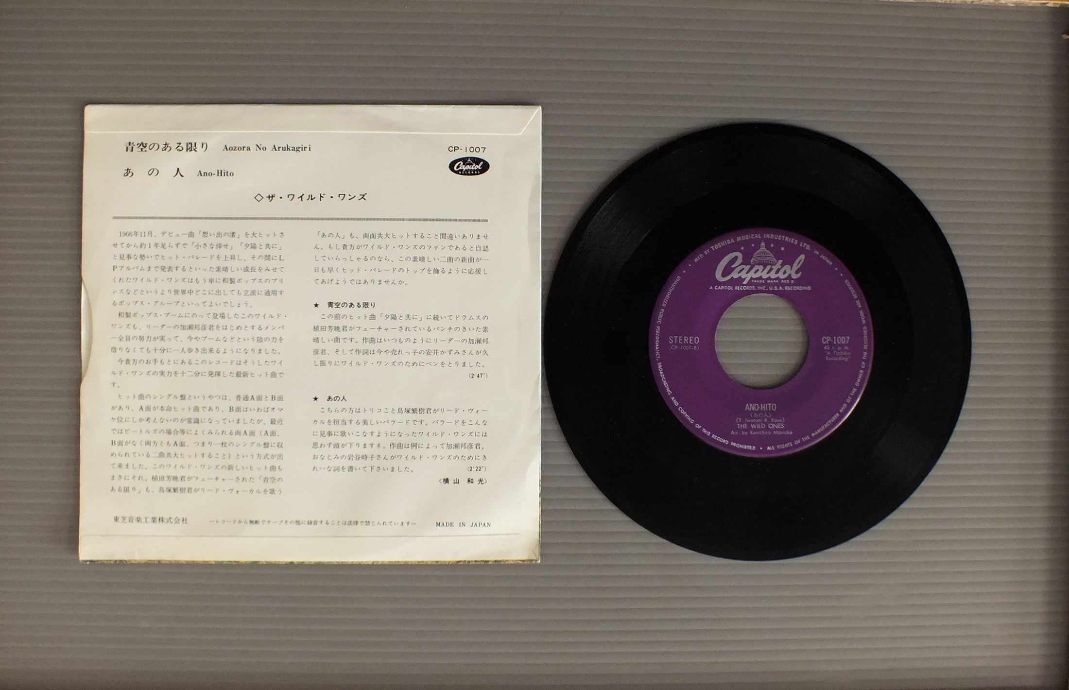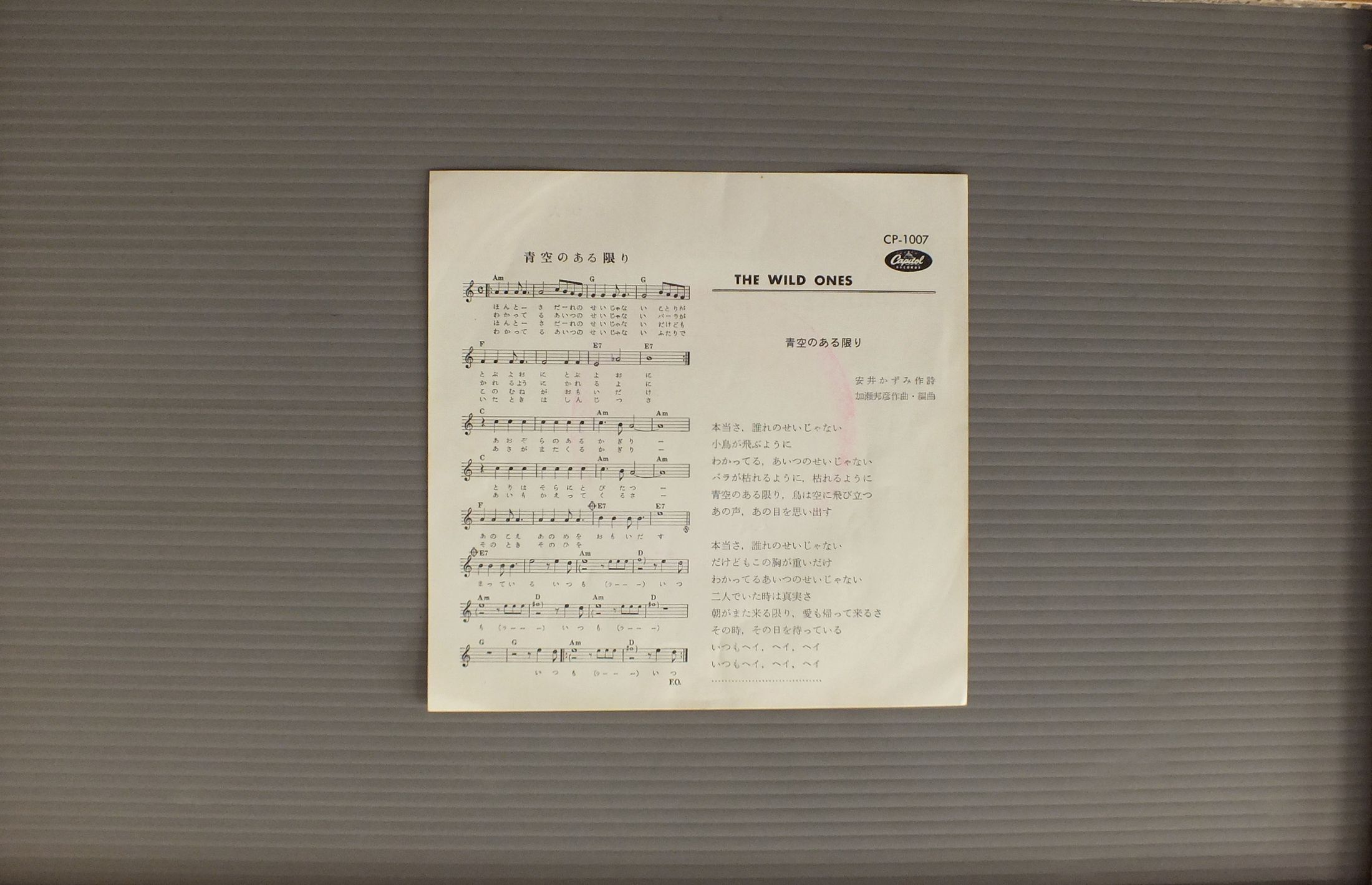 WILD ONESワイルド・ワンズ/AOZORA NO ARUKAGIRI青空のある限り CP1007 製造国:日本盤 / Media:7inch外観:EX盤の状態:EX 価格(税込):¥550 送料 7inch:定形外郵便 360円~LP:定形外郵便 660円~送料は、注文の最終画面で確認頂けます。 > > WILD ONES/AOZORA NO ARUKAGIRI 外観 (EX)特記事項:ヨレ有り。外観EXの共通説明:ダメージが限定的。中古品としては保存状態がよい方。シミ、ヨゴレ、スレ 少し~軽度。 盤の状態 (EX)特記事項:薄いスリキズ・スレ軽くある感じ。殆どが軽微なものの様子です。盤EXの共通説明:盤面のスリキズが薄いものが少し~軽度 音に出そうなものは無いように見える(軽微なソフトティック音は除く)。 Tweet それぞれの画像をクリックすると、大きい写真が見られます こちらの商品もお勧めです 1,320円 TAKESHI TERAUCHI & THE BUNNYS寺内タケシとザ・バニーズ / LET`S GO CLASSICSレッツ・ゴー運命 660円 YUZO KAYAMA加山雄三 / AISURUTOKIHA IMA愛する時は今 660円 YUZO KAYAMA加山雄三 / 15TH ANNIVERSARY加山雄三1976 武道館ライブ 1,650円 MUNETAKA INOUE & HIS SHARP FIVE井上宗孝とシャープ・ファイヴ / SHARP FIVE SCREEN GO GOシャープ・ファイヴ・スクリーン・ゴーゴー 2,420円 OXオックス / TELL ME-OX ON STAGE No1テルミー-オックス・オン・ステージ No1 550円 TIGERSタイガース / 10 YEARS ROMANCE十年ロマンス 1,210円 TIGERSタイガース / TIGERS 1982十年ロマンス 770円 TIGERSタイガース / TIGERS 1982タイガース 1982
