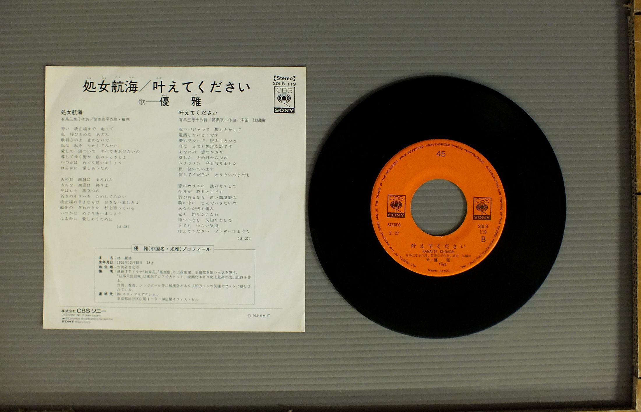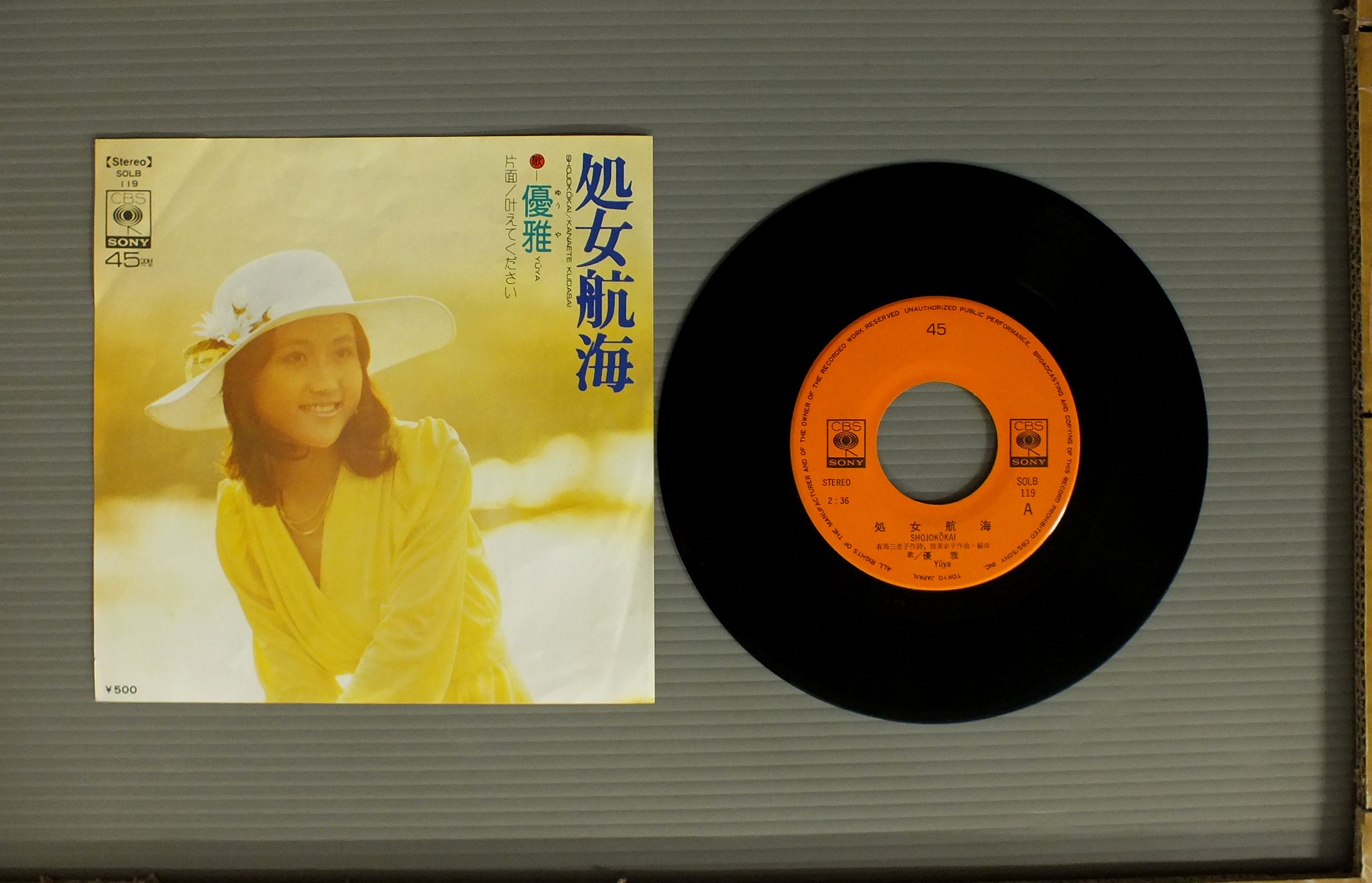 YUYAR優雅(ゆうや)/SHOJOKOKAI処女航海 SOLB119 製造国:日本盤 / Media:7inch外観:EX盤の状態:EX 価格(税込):¥550 送料 7inch:定形外郵便 360円~LP:定形外郵便 660円~送料は、注文の最終画面で確認頂けます。 レコード検索 > CLASSIC ORCH. > YUYAR/SHOJOKOKAI 外観 (EX)特記事項:ジャケ表面にシミやよごれ有り。外観EXの共通説明:ダメージが限定的。中古品としては保存状態がよい方。シミ、ヨゴレ、スレ 少し~軽度。 盤の状態 (EX)特記事項:薄いスリキズ・スレ軽くある感じ。軽微なものの様子です。盤EXの共通説明:盤面のスリキズが薄いものが少し~軽度 音に出そうなものは無いように見える(軽微なソフトティック音は除く)。 Tweet それぞれの画像をクリックすると、大きい写真が見られます こちらの商品もお勧めです 660円 BAKUFU SLUMPA爆風スランプ / YOIよい 660円 CYGNUS白鳥座 / DENEB ( 2nd ALBUM )デネブ ( 2nd ALBUM ) 770円 KENJI SAWADA沢田研二 / OMOIKKIRI KIZA NA JINSEI思いきり気障な人生 1,320円 OKAWARI SISTERSおかわりシスターズ / L.A.S.Tラ・ス・ト カレンダー付 770円 HIROMI IWASAKI岩崎宏美 / HIKOUSEN飛行船 1,430円 ZIG ZAG / FLAMINGO 550円 SOUTHERN ALL STARS.サザンオールスターズ / KAMAKURA 1,210円 EIKICHI YAZAWA矢沢永吉 / KISS ME PLEASEキス・ミー・プリーズ