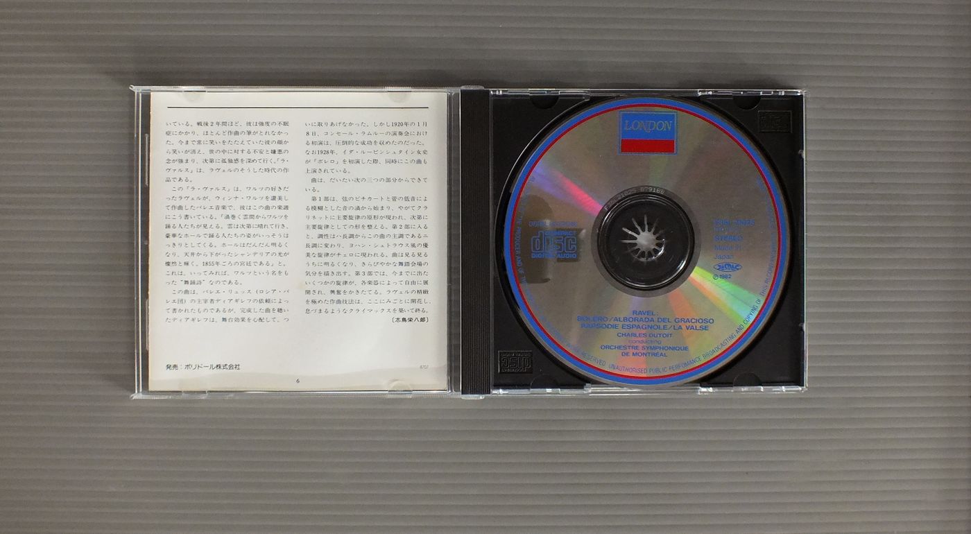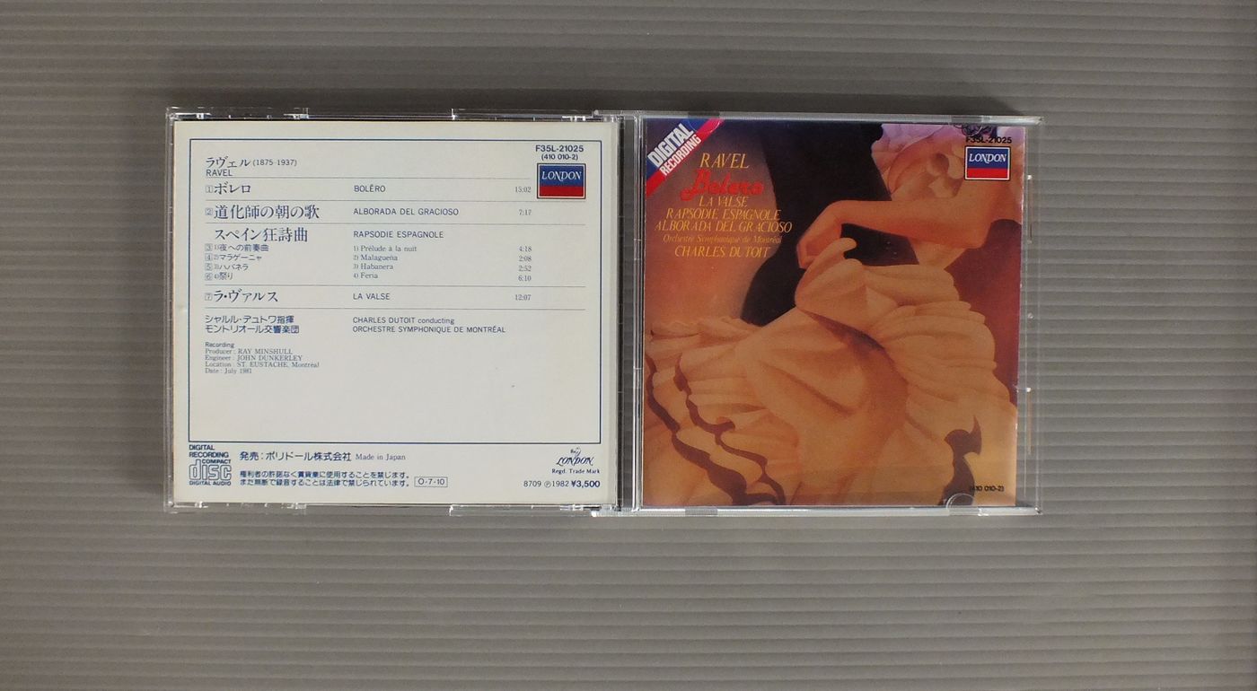 DUTOIT - ORCHESTARE SYMPHONIQUE DE MONTREALデュトワ - OSM/RAVEL - BOLERO-RAPSODIE ESPAGNOLE-LA VAISEラヴェル - ボレロ-スペイン狂詩曲-ラ・ヴァルス F35L21025 製造国:日本盤 / Media:CD外観:EX盤の状態:EX 価格(税込):¥880 送料 7inch:定形外郵便 360円~LP:定形外郵便 660円~送料は、注文の最終画面で確認頂けます。 レコード検索 > HARD ROCK > DUTOIT - ORCHESTARE SYMPHONIQUE DE MONTREAL/RAVEL - BOLERO-RAPSODIE ESPAGNOLE-LA VAISE 外観 (EX)特記事項:ブックレットにシミが少し。外観EXの共通説明:ダメージが限定的。中古品としては保存状態がよい方。シミ、ヨゴレ、スレ 少し~軽度。 盤の状態 (EX)特記事項:あまりスレやスリキズの無いきれいな状態。盤EXの共通説明:盤面のスリキズが薄いものが少し~軽度 音に出そうなものは無いように見える(軽微なソフトティック音は除く)。 Tweet それぞれの画像をクリックすると、大きい写真が見られます こちらの商品もお勧めです 990円 WEISSSENBERG - GIULINI - WIENER SYMPHONYワイセンベルク - ジュリーニ - ウィーン交響楽団 / MOZART - PIANO CINCERTO NO.9モーツァルト - ピアノ協奏曲第9番 990円 TALICH - CZECH PHILHARMONIC ORCH.ターリッヒ - チェコ・フィルハーモニー管弦楽団 / DVORAK - STABAT MATERドヴォルザーク - スターバト・マーテル 2,420円 HIROYUKI IWAKI - THE NHK SYMPHONY ORCHESTRA岩城宏之 - NHK交響楽団 / TOSHIRO MAYUZUMI - BUGAKU黛 敏郎 - バレエ音楽`舞楽` 990円 KARAJAN - BERLINER PHILHARMONIKERカラヤン - ベルリン・フィル / MOZART - EINE KLEINE NACHTMUSIKモーツアルト - アイネ・クライネ・ナハトムジーク 990円 KARAJAN - VIENNA PHILHARMONIC ORCHESTRAカラヤン - ウィーン・フィルハーモニー管弦楽団 / HOLST - THE PLANETSホルスト - 組曲惑星 1,540円 BOHM - BERLINER PHILHARMONIKERベーム - ベルリン・フィル / MOZART - SINFONIE CONCERTANTI KV364&297モーツアルト協奏交響曲KV364&297 1,540円 HAGER - MOZAARTEUM ORCHESTER SALZBURGレオポルト・ハーガー - ザルツブルク・モーツァルテウム管弦楽団 / MOZART - THAMOS KING OF EGYPT 1,540円 ABBADO - VIENER PHILHARMONIKERアバド - ウィーン・フィル / BRAHMS - HANGARIAN DANCESブラームス - ハンガリア舞曲