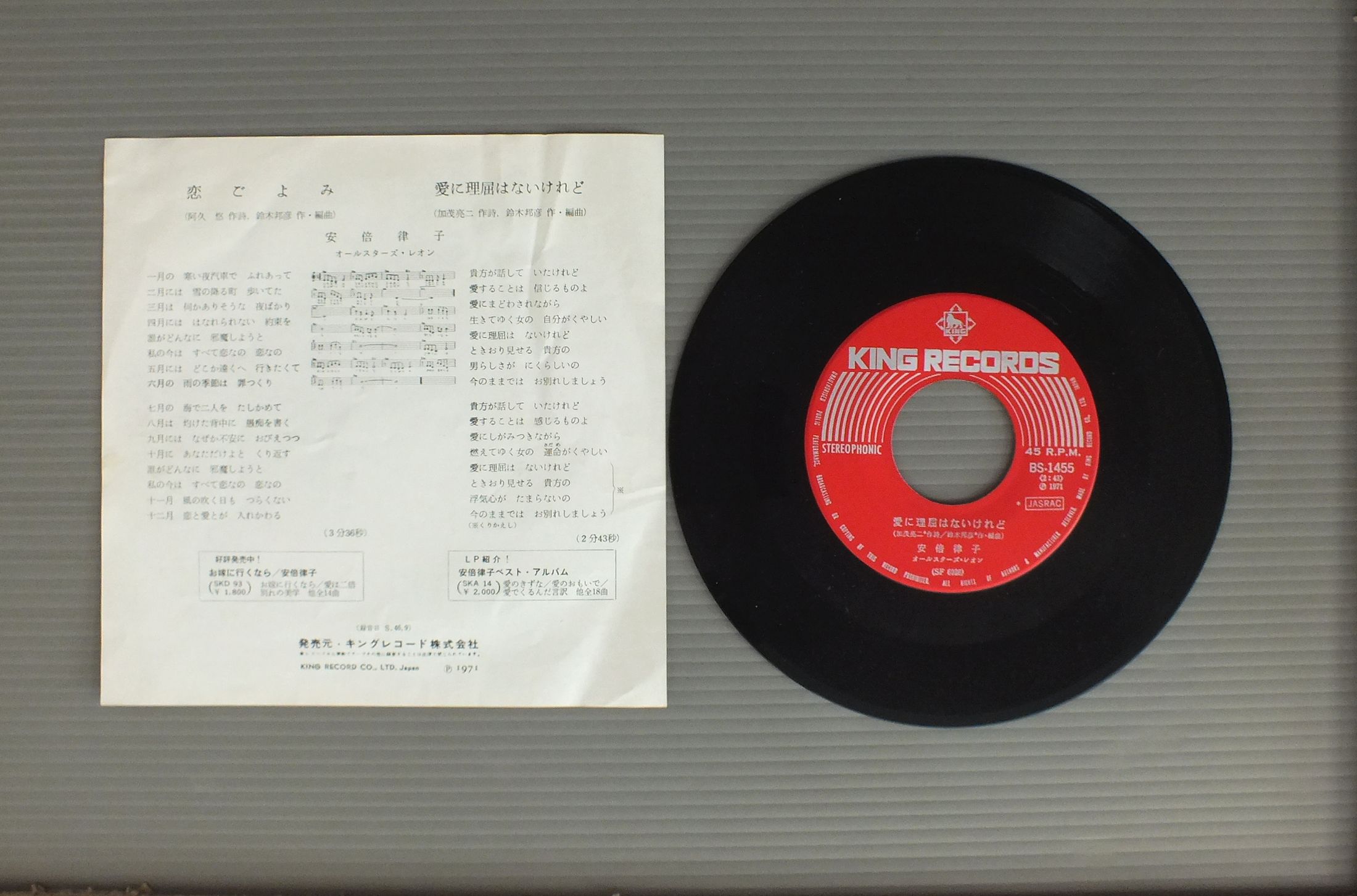 RITSUKO ABE安倍律子/KOI GONOMI恋ごよみ BS1455 製造国:日本盤 / Media:7inch外観:EX盤の状態:EX 価格(税込):¥550 送料 7inch:定形外郵便 360円~LP:定形外郵便 660円~送料は、注文の最終画面で確認頂けます。 レコード検索 > CLASSIC ORCH. > RITSUKO ABE/KOI GONOMI 外観 (EX)特記事項:ヨレ有り。外観EXの共通説明:ダメージが限定的。中古品としては保存状態がよい方。シミ、ヨゴレ、スレ 少し~軽度。 盤の状態 (EX)特記事項:薄いスリキズ・スレ軽くある感じ。軽微なものの様子です。盤EXの共通説明:盤面のスリキズが薄いものが少し~軽度 音に出そうなものは無いように見える(軽微なソフトティック音は除く)。 Tweet それぞれの画像をクリックすると、大きい写真が見られます こちらの商品もお勧めです 880円 AKIRA INABA因幡晃 / NANIKA IIWASURETA YOUNA何か言い忘れたようで… 990円 DR. RIVERBEACH & HIS ORCHESTRA / GOOD-BYE SONG BOOK 2,750円 STAGE 101ステージ101 / AKAI YANE NO IE赤い屋根の家 770円 TULIPチューリップ / TULIP BEST心の旅 770円 YOSHITAROU KANAZAKI加奈崎芳太郎 (古井戸) / AIGA MOSHI SUBETENARA愛がもしすべてなら 770円 OFF COURSEオフコース / FAIRWAYフェアウェイ 770円 AMI OZAKI尾崎亜美 / STOP MOTIONストップ・モーション 880円 KAZUHIKO KATOH加藤和彦 / L`OPERA FRAGILE