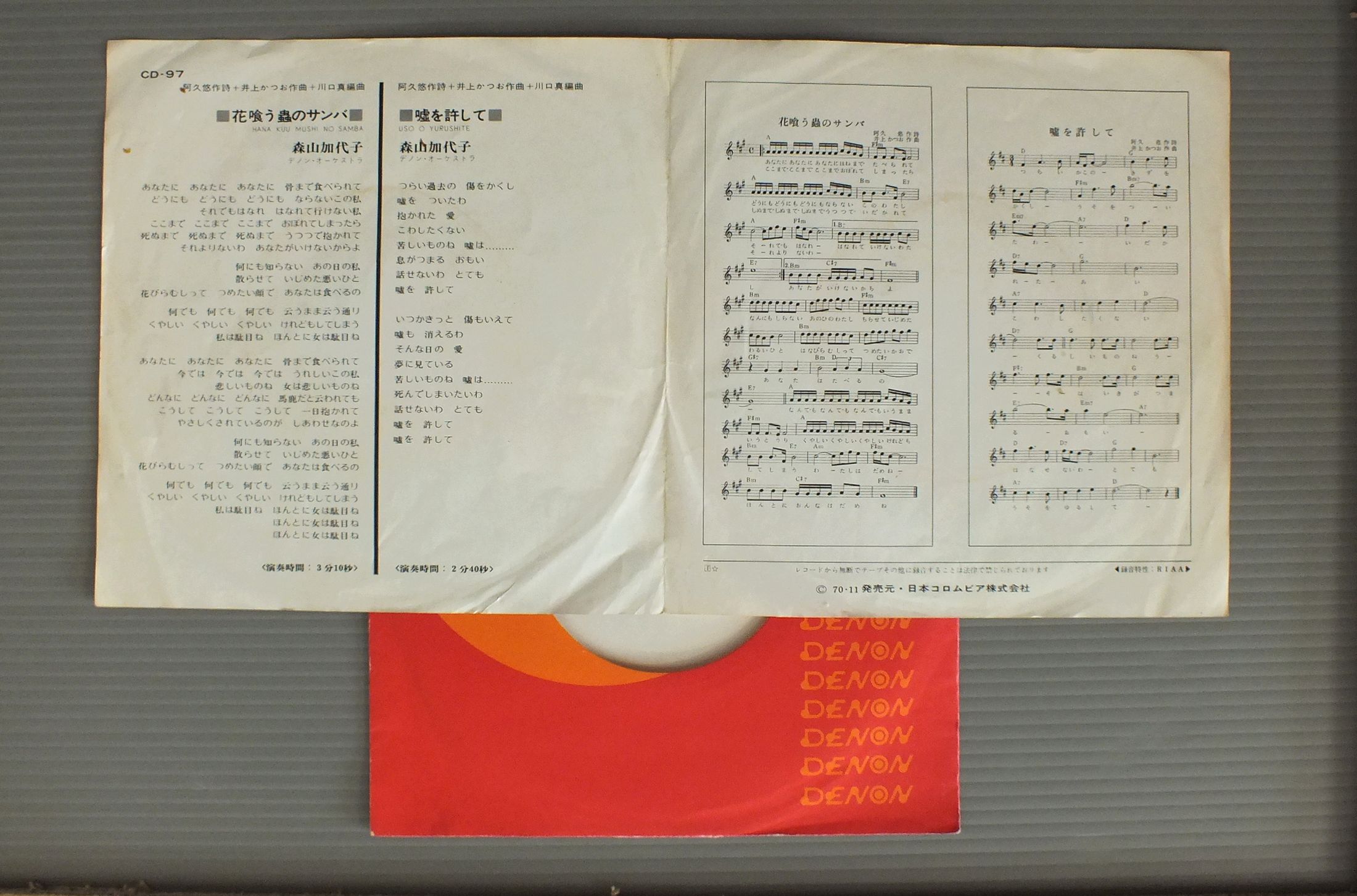 KANAKO MORIYAMA森山加奈子/HANA KUU MUSHI NO SAMBA花喰う蟲のサンバ CD97 製造国:日本盤 / Media:7inch外観:VG+盤の状態:VG+ 価格(税込):¥990 送料 7inch:定形外郵便 360円~LP:定形外郵便 660円~送料は、注文の最終画面で確認頂けます。 レコード検索 > J-POP > KANAKO MORIYAMA/HANA KUU MUSHI NO SAMBA 外観 (VG+)特記事項:ヨレ有り。見開きにシミやよごれ。外観VG+の共通説明:ダメージやや有り。シミ、ヨゴレ、スレなど多少~やや多め。 盤の状態 (VG+)特記事項:薄いスレやスリキズやや有り。音は出ていますが、多少チリ有り。A面の最初のエッジに欠け有。音溝にはかかってはいません。盤VG+の共通説明:盤面にスリキズが多少~やや有り、音に出そうなものも多少ある。 Tweet それぞれの画像をクリックすると、大きい写真が見られます こちらの商品もお勧めです 880円 SUGIYAMA-K杉山清貴 / KONA WEATHER 1,320円 MARI AMACHI天地真理 / WHISPERING GREENLEAVES若葉のささやき/さよならだけ残して 770円 MOTOHARU SANO佐野元春 / VISITORS 770円 KUMIKO YAMASHITA山下久美子 / DANCIN`IN THE KITCHEN 1,210円 SNAKEMAN SHOWスネークマン・ショー / 急いで口で吸え! 990円 MAYUMI ITUWA五輪真弓 / SHUNNSHUU春愁 550円 MIKI ASAKURA麻倉未稀 / ROMANCEロマンス 662円 KATSUO OHNO大野克夫 / WINDWARD HILLウィンドワード・ヒル