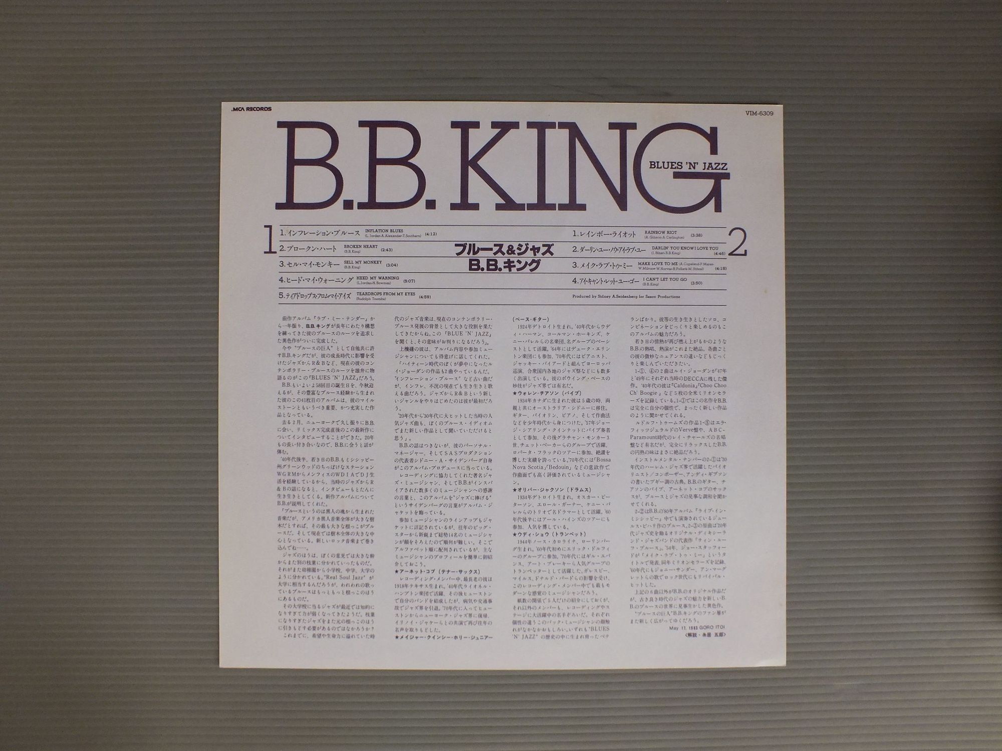 B.B.KINGB.B.キング/BLUES N`JAZZブルース&ジャズ VIM6309 製造国:日本盤 / Media:LP外観:EX盤の状態:EX帯:EX- 価格(税込):¥1,155(売約済) 送料 7inch:定形外郵便 360円~LP:定形外郵便 660円~送料は、注文の最終画面で確認頂けます。 > > B.B.KING/BLUES N`JAZZ 外観 (EX)特記事項:特記なし。外観EXの共通説明:ダメージが限定的。中古品としては保存状態がよい方。シミ、ヨゴレ、スレ 少し~軽度。 盤の状態 (EX)特記事項:薄いスリキズ・スレ軽くある感じ。軽微なものの様子です。盤EXの共通説明:盤面のスリキズが薄いものが少し~軽度 音に出そうなものは無いように見える(軽微なソフトティック音は除く)。 帯の状態 (EX-):裏側に切れ有り。 その他:白見本盤 Tweet それぞれの画像をクリックすると、大きい写真が見られます こちらの商品もお勧めです 1,980円 BUTTERFIELD BLUES BANDバターフィールド・ブルース・バンド / KEEP ON MOVINGキープ・オン・ムービング 440円 Z.Z.HILLZ.Z.ヒル / Z.Z.HILLZ.Z.ヒル 1,210円 B.B.KINGB.B キング / LOVE ME TENDERラブ・ミ・テンダー