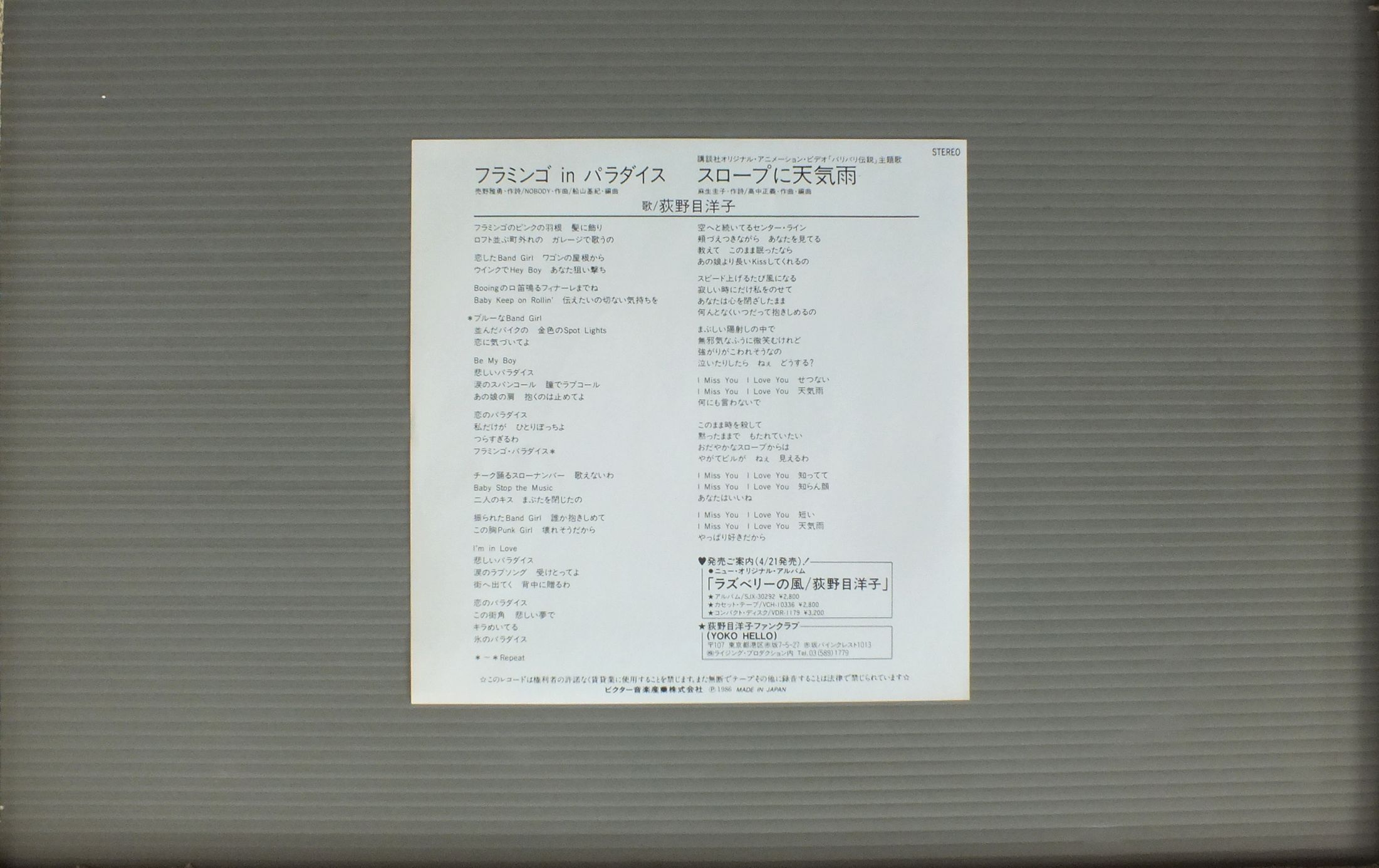 YOKO OGINOME荻野目洋子/FLAMINGO IN PARADAISEフラミンゴ IN パラダイス SV9105 製造国:日本盤 / Media:7inch外観:EX盤の状態:EX+ 価格(税込):¥440 送料 7inch:定形外郵便 360円~LP:定形外郵便 660円~送料は、注文の最終画面で確認頂けます。 > > YOKO OGINOME/FLAMINGO IN PARADAISE 外観 (EX)特記事項:表ジャケに折れ有り。外観EXの共通説明:ダメージが限定的。中古品としては保存状態がよい方。シミ、ヨゴレ、スレ 少し~軽度。 盤の状態 (EX+)特記事項:薄いスリキズ・スレ少し。一見してきれいな状態です。盤EX+の共通説明:盤面の極薄いスリキズ、スレ少し程度 音に出そうなものは無いように見える(極軽微なソフトティック音は除く)。 Tweet それぞれの画像をクリックすると、大きい写真が見られます こちらの商品もお勧めです 880円 MOMOE YAMAGUCHI山口百恵 / 16s THEME16才のテーマ 2,640円 MINAKO HONDA本田美奈子 / MINAKO THE VIRGIN CONCERTMINAKO ザ・ヴァージン・コンサート 1,320円 YOSHIMI IWASAKI岩崎良美 / RING-A-DING (1st ALBUM)リング・ア・ディング (1st ALBUM) 770円 SHOKO SAWADA沢田聖子 / POTENTIALポテンシャル 880円 YUMI MORIO森尾 由美 / YOU & ME 770円 YUKO ISHIKAWA石川優子 / REN`AI KODOKU-JIN恋愛孤独人 1,210円 HIROMI IWASAKI岩崎宏美 / ROMANTIC CONCERT 2ロマンティック・コンサート2 + ピンナップ付 770円 MIKI ASAKURA麻倉末稀 / LOVE AGAIN