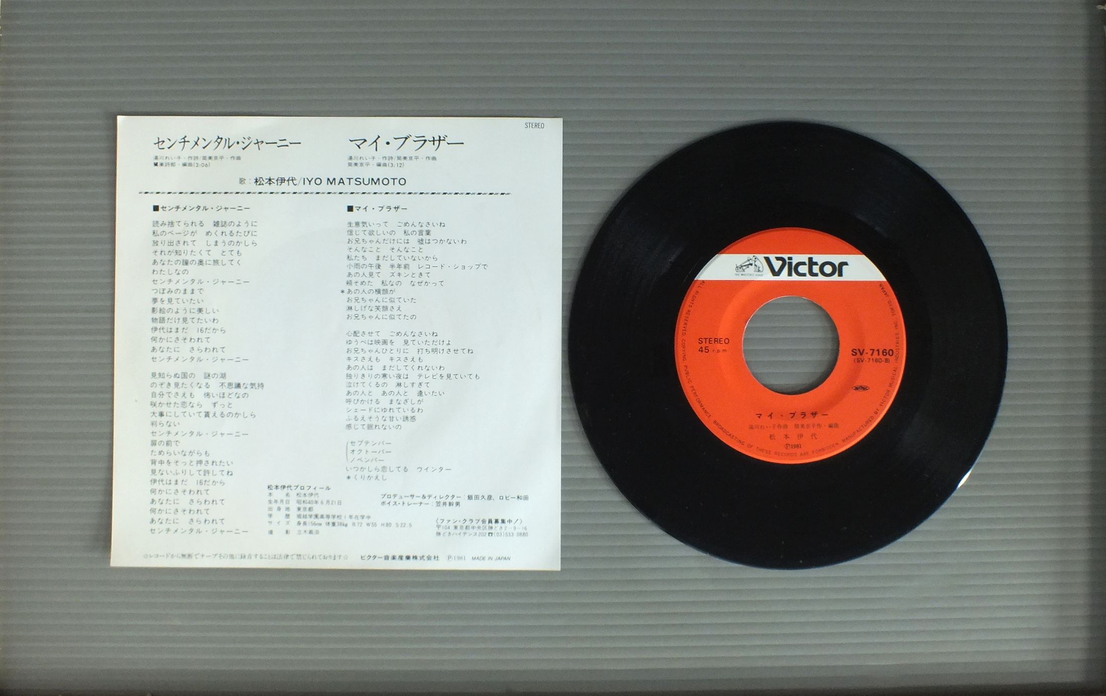IYO MATSUMOTO松本伊代/SENTIMENTAL JOURNEYセンチ・メンタルジャーニー SV7160 製造国:日本盤 / Media:7inch外観:EX盤の状態:EX+ 価格(税込):¥330 送料 7inch:定形外郵便 360円~LP:定形外郵便 660円~送料は、注文の最終画面で確認頂けます。 > > IYO MATSUMOTO/SENTIMENTAL JOURNEY 外観 (EX)特記事項:特記なし。外観EXの共通説明:ダメージが限定的。中古品としては保存状態がよい方。シミ、ヨゴレ、スレ 少し~軽度。 盤の状態 (EX+)特記事項:薄いスリキズ・スレ少し。一見してきれいな状態です。盤EX+の共通説明:盤面の極薄いスリキズ、スレ少し程度 音に出そうなものは無いように見える(極軽微なソフトティック音は除く)。 Tweet それぞれの画像をクリックすると、大きい写真が見られます こちらの商品もお勧めです 1,210円 TSUKASA ITOH伊藤つかさ / SAYONARA KONNICHIWAさよなら、こんにちは 770円 TSUKASA ITOH伊藤つかさ / TSUKASA IN WONDERLANDふしぎの国のつかさ 1,320円 MIKI ASAKURA麻倉未稀 / LOVE AGAIN 1,210円 MOMOE YAMAGUCH山口百恵 / MOBIUS`S GAMEメビウス・ゲーム 880円 SONOKO KAWAI河合その子 / SONOKOその子 990円 SONOKO KAWAI河合その子 / MODE DE SONOKOモード・デ・その子 990円 SONOKO KAWAI河合その子 / SIESTAシエスタ 770円 PINK LADYピンク・レディー / BYE-BYE CARNIVALバイ・バイ・カーニバル