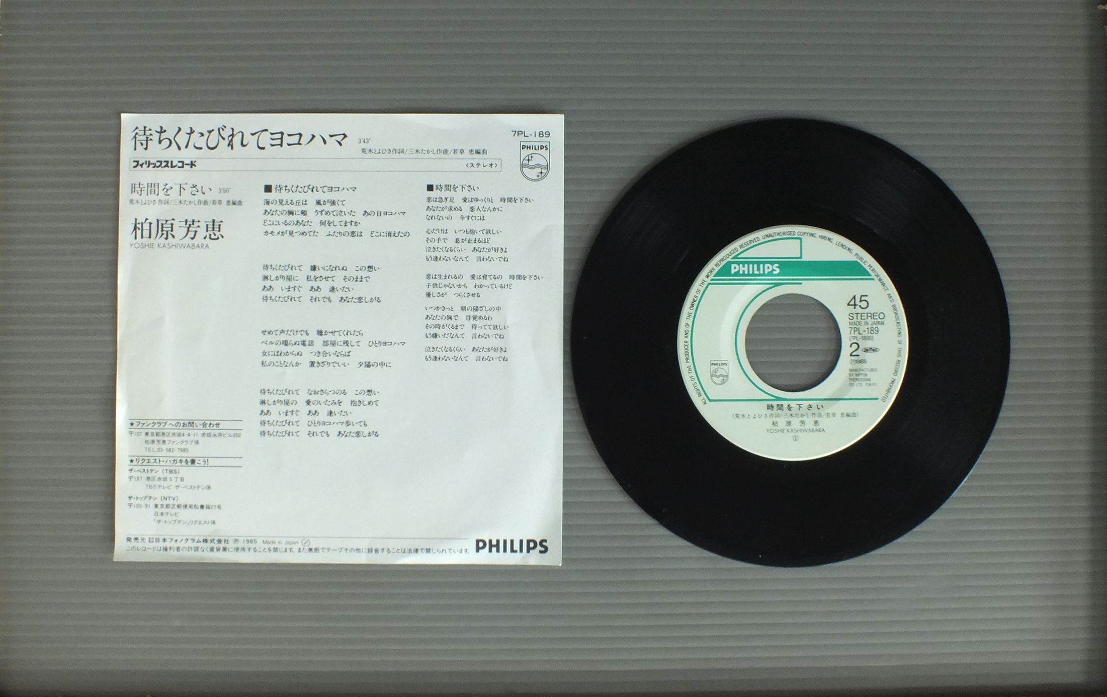 YOSHIE KASHIWABARA柏原芳恵/MACHIKUTABIRETE YOKOHAMA待ちくたびれてヨコハマ 7PL189 製造国:日本盤 / Media:7inch外観:EX盤の状態:EX 価格(税込):¥330 送料 7inch:定形外郵便 360円~LP:定形外郵便 660円~送料は、注文の最終画面で確認頂けます。 > > YOSHIE KASHIWABARA/MACHIKUTABIRETE YOKOHAMA 外観 (EX)特記事項:ヨレ有り。外観EXの共通説明:ダメージが限定的。中古品としては保存状態がよい方。シミ、ヨゴレ、スレ 少し~軽度。 盤の状態 (EX)特記事項:薄いスリキズ・スレ軽くある感じ。軽微なものの様子です。盤EXの共通説明:盤面のスリキズが薄いものが少し~軽度 音に出そうなものは無いように見える(軽微なソフトティック音は除く)。 Tweet それぞれの画像をクリックすると、大きい写真が見られます こちらの商品もお勧めです 880円 MAKO ISHINO石野真子 / MAKO2 660円 YOU HAYAMI早見優 / IMAGEイマージュ 1,210円 USHIRO-YUBI SASAREGUMIうしろゆびさされ組 / 1st LP ( FUWAFURA )ふ・わ・ふ・ら 1,210円 SAORI MINAMI南沙織 / SUFFERING AGEヤングのテーマ 傷つく世代 1,210円 MOMOE YAMAGUCH山口百恵 / MOBIUS`S GAMEメビウス・ゲーム 770円 SHOKO SAWADA沢田聖子 / POTENTIALポテンシャル 660円 MIYOKO ASADA浅田美代子 / TRAVELLING AROUND THE WORLD WITH MIYOKOしあわせの一番星-恋は真珠いろ -(美代子と世界の旅) 1,210円 NAOKO KAWAI河合奈保子 / DIARYダイアリー