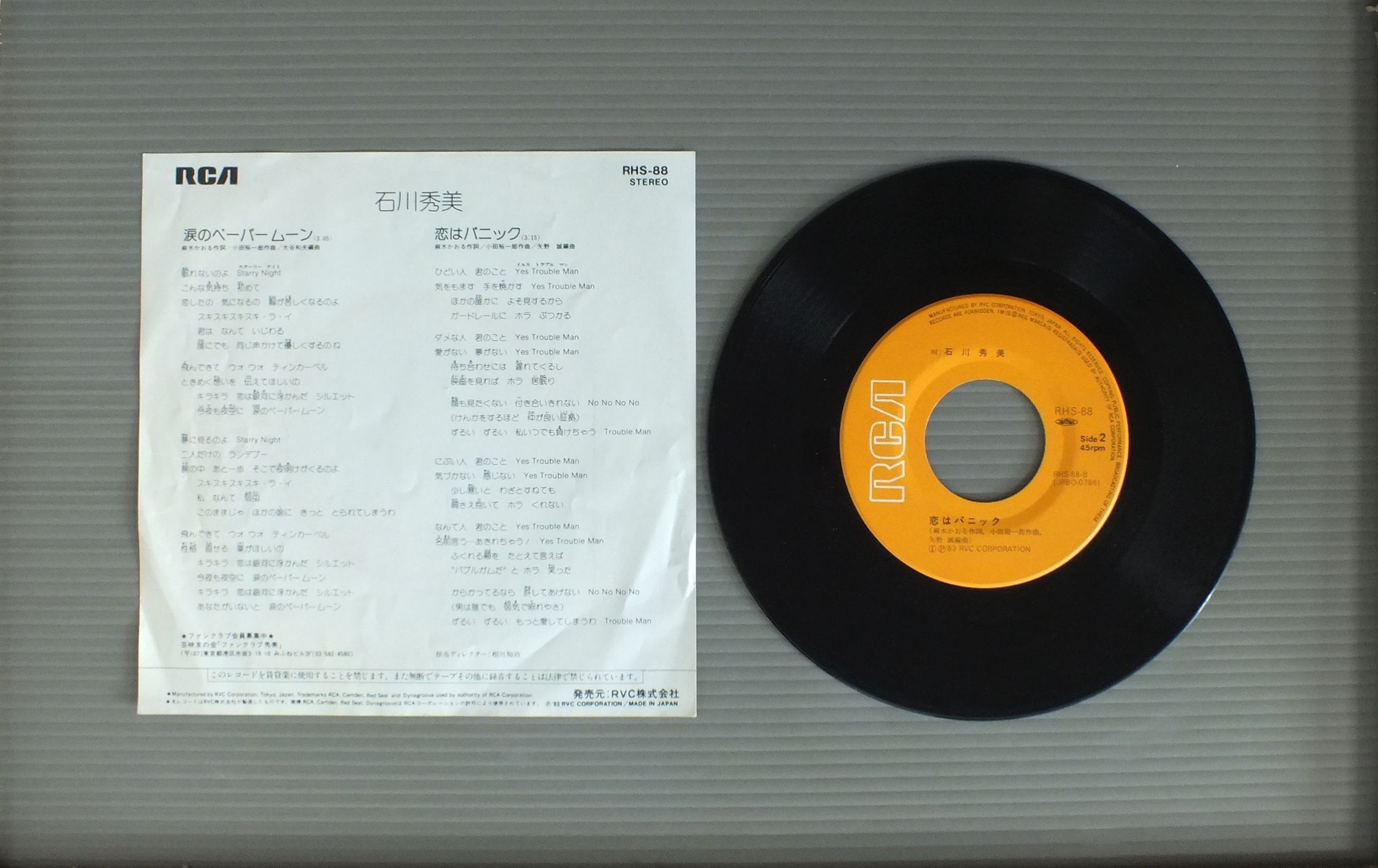HIDEMI ISHIKAWA石川秀美/NAMIDA NO PAPER MOON涙のペーパームーン RHS88 製造国:日本盤 / Media:7inch外観:EX盤の状態:EX 価格(税込):¥330 送料 7inch:定形外郵便 360円~LP:定形外郵便 660円~送料は、注文の最終画面で確認頂けます。 > > HIDEMI ISHIKAWA/NAMIDA NO PAPER MOON 外観 (EX)特記事項:ヨレ有り。外観EXの共通説明:ダメージが限定的。中古品としては保存状態がよい方。シミ、ヨゴレ、スレ 少し~軽度。 盤の状態 (EX)特記事項:薄いスリキズ・スレ軽くある感じ。軽微なものの様子です。盤EXの共通説明:盤面のスリキズが薄いものが少し~軽度 音に出そうなものは無いように見える(軽微なソフトティック音は除く)。 Tweet それぞれの画像をクリックすると、大きい写真が見られます こちらの商品もお勧めです 770円 SEIKO MATSUDA松田聖子 / SEIKO TOWN 880円 MAKO ISHINO石野真子 / MAKO2 880円 MOMOE YAMAGUCHI山口百恵 / BEST HITS山口百恵ヒット全曲集 880円 YUMI MORIO森尾 由美 / YOU & ME 660円 HIROKO TANIYAMA谷山浩子 / MOUHITORI NO ALICEもうひとりのアリス 770円 NAOKO KAWAI河合奈保子 / TWILIGHT DREAM 550円 ONYANKO CLUBおニャン子クラブ / KICK OFFキックオフ 1,320円 YOU HAYAMI早見優 / COLORFUL BOX