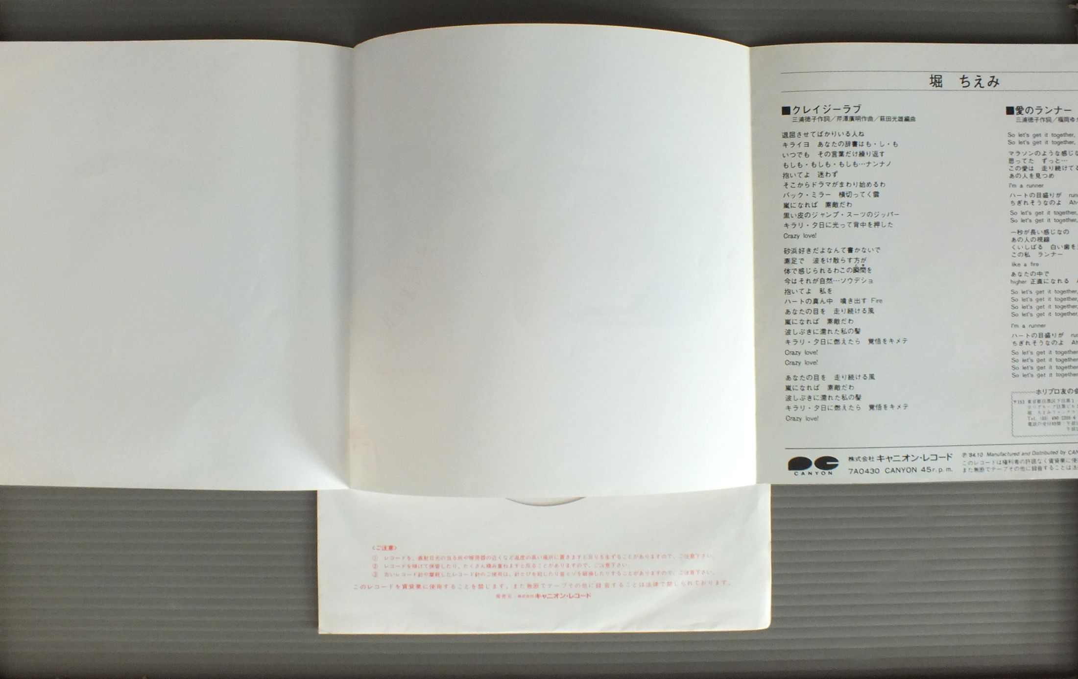 CHIEMI HORI堀ちえみ/CRAZY LOVEクレイジーラブ 7A0430 製造国:日本盤 / Media:7inch外観:EX盤の状態:EX 価格(税込):¥440 送料 7inch:定形外郵便 360円~LP:定形外郵便 660円~送料は、注文の最終画面で確認頂けます。 > > CHIEMI HORI/CRAZY LOVE 外観 (EX)特記事項:特記なし。外観EXの共通説明:ダメージが限定的。中古品としては保存状態がよい方。シミ、ヨゴレ、スレ 少し~軽度。 盤の状態 (EX)特記事項:薄いスリキズ・スレ軽くある感じ。軽微なものの様子です。盤EXの共通説明:盤面のスリキズが薄いものが少し~軽度 音に出そうなものは無いように見える(軽微なソフトティック音は除く)。 Tweet それぞれの画像をクリックすると、大きい写真が見られます こちらの商品もお勧めです 770円 TSUKASA ITOH伊藤つかさ / TSUKASA IN WONDERLANDふしぎの国のつかさ 660円 HIROKO TANIYAMA谷山浩子 / MOUHITORI NO ALICEもうひとりのアリス 770円 SHOKO SAWADA沢田聖子 / POTENTIALポテンシャル 1,210円 SAORI MINAMI南沙織 / SUFFERING AGEヤングのテーマ 傷つく世代 770円 SHOKO SAWADA沢田聖子 / 1st ALBUM坂道の少女 770円 SEIKO MATSUDA松田聖子 / SEIKO TOWN 1,210円 HIROMI IWASAKI岩崎宏美 / ROMANTIC CONCERT 2ロマンティック・コンサート2 + ピンナップ付 770円 SHOKO SAWADA沢田聖子 / GRADUATION卒業