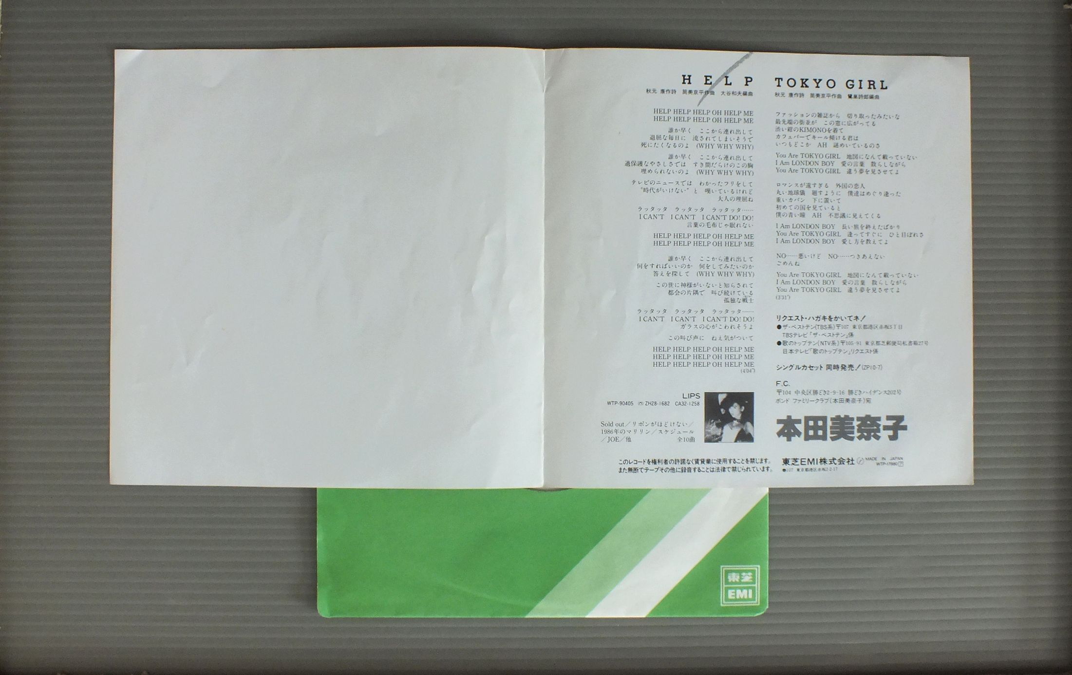 MINAKO HONDA本田美奈子/HELP WTP17880 製造国:日本盤 / Media:7inch外観:EX盤の状態:EX 価格(税込):¥330 送料 7inch:定形外郵便 360円~LP:定形外郵便 660円~送料は、注文の最終画面で確認頂けます。 > > MINAKO HONDA/HELP 外観 (EX)特記事項:ヨレ有り。外観EXの共通説明:ダメージが限定的。中古品としては保存状態がよい方。シミ、ヨゴレ、スレ 少し~軽度。 盤の状態 (EX)特記事項:薄いスリキズ・スレ軽くある感じ。軽微なものの様子です。盤EXの共通説明:盤面のスリキズが薄いものが少し~軽度 音に出そうなものは無いように見える(軽微なソフトティック音は除く)。 Tweet それぞれの画像をクリックすると、大きい写真が見られます こちらの商品もお勧めです 990円 PINK LADYピンク・レディー / CHALLENGE CONCERTチャレンジ・コンサート 990円 YOU HAYAMI早見優 / RECESSリーセス 990円 SONOKO KAWAI河合その子 / SIESTAシエスタ 880円 MOMOE YAMAGUCHI山口百恵 / BEST HITS山口百恵ヒット全曲集 770円 YUKO ISHIKAWA石川優子 / SPICYスパイシィ 1,320円 YOSHIMI IWASAKI岩崎良美 / RING-A-DING (1st ALBUM)リング・ア・ディング (1st ALBUM) 770円 ERI NITTA新田恵利 / E-AREA 1,210円 ERI NITTA新田恵利 / ERI