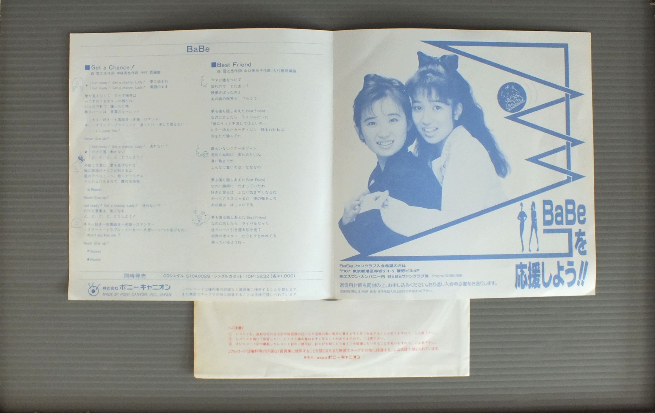 BABE/GET A CHANCE !ドラマ「花のあすか組!」主題歌 GET CHANCE! 7A0853 製造国:日本盤 / Media:7inch外観:EX盤の状態:EX 価格(税込):¥440(売約済) 送料 7inch:定形外郵便 360円~LP:定形外郵便 660円~送料は、注文の最終画面で確認頂けます。 レコード検索 > J-POP > BABE/GET A CHANCE ! 外観 (EX)特記事項:ヨレ有り。外観EXの共通説明:ダメージが限定的。中古品としては保存状態がよい方。シミ、ヨゴレ、スレ 少し~軽度。 盤の状態 (EX)特記事項:薄いスリキズ・スレ軽くある感じ。軽微なものの様子です。盤EXの共通説明:盤面のスリキズが薄いものが少し~軽度 音に出そうなものは無いように見える(軽微なソフトティック音は除く)。 Tweet それぞれの画像をクリックすると、大きい写真が見られます こちらの商品もお勧めです 990円 SONOKO KAWAI河合その子 / SIESTAシエスタ 770円 NAOKO KAWAI河合奈保子 / TWILIGHT DREAM 1,320円 YOU HAYAMI早見優 / COLORFUL BOX 770円 ERI NITTA新田恵利 / ERI 880円 SEIKO MATSUDA松田聖子 / WINDY SHADOW 880円 SONOKO KAWAI河合その子 / SONOKOその子 1,210円 PINK LADYピンク・レディー / PINK LADY CHALLENGE CONCERTピンク・レディー・チャレンジ・コンサート 880円 SEIKO MATSUDA松田聖子 / MORNING SHOWER映画 プルメリアの伝説