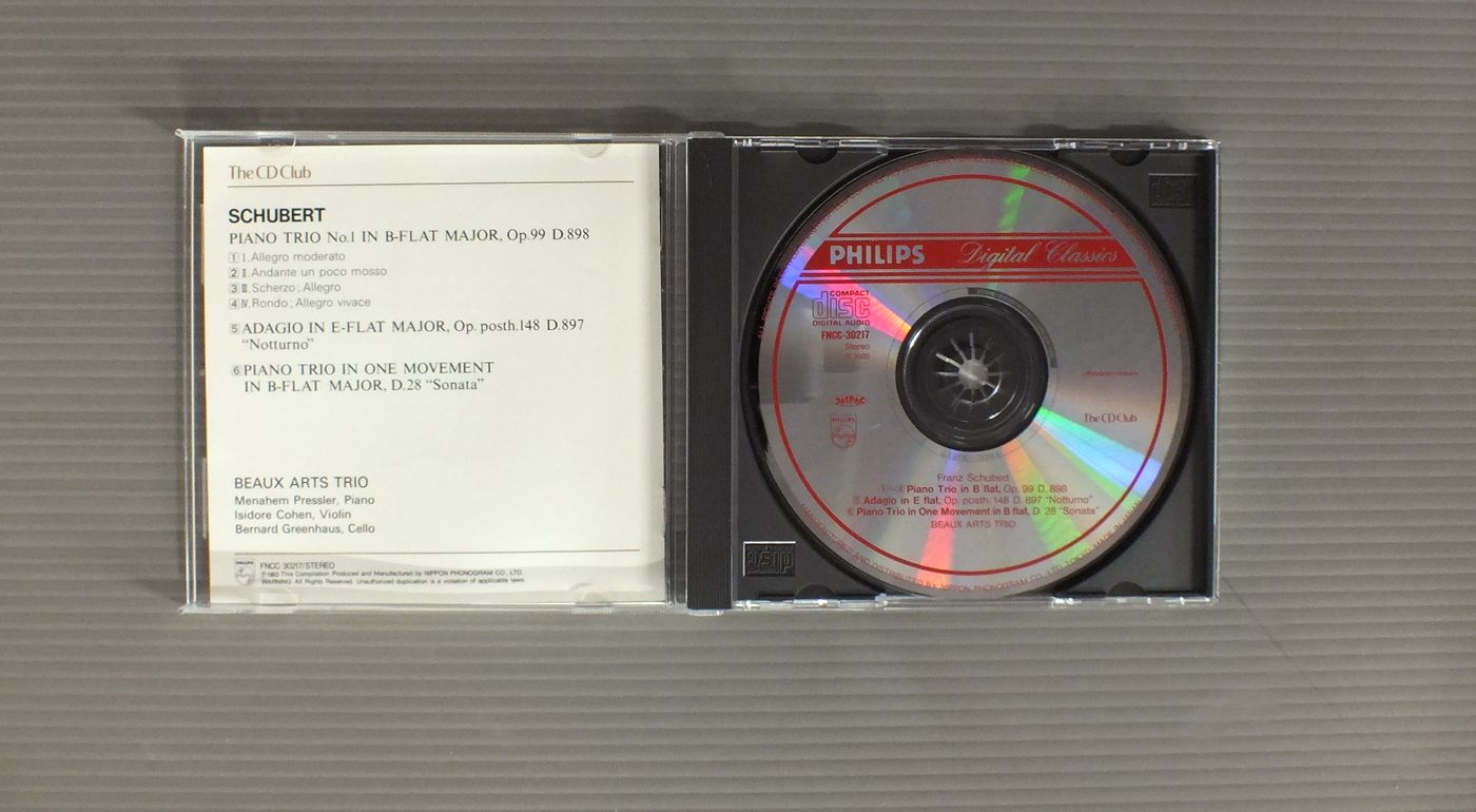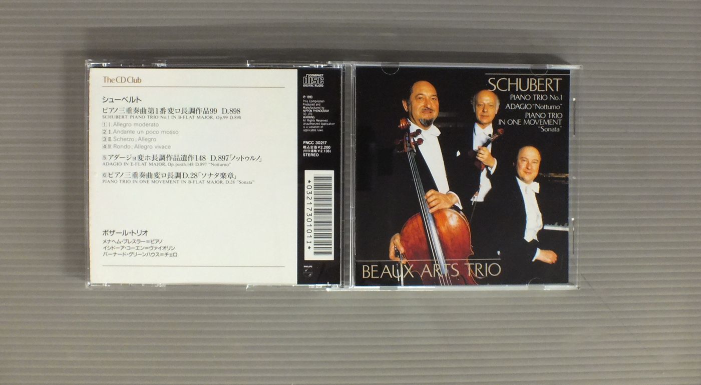 BEAUX ART TRIOボザール・トリオ/SCHUBERT-PIANO TRIOSシューベルト-ピアノ三重奏曲集 FNCC30217 製造国:日本盤 / Media:CD外観:EX盤の状態:EX 価格(税込):¥880 送料 7inch:定形外郵便 360円~LP:定形外郵便 660円~送料は、注文の最終画面で確認頂けます。 > > BEAUX ART TRIO/SCHUBERT-PIANO TRIOS 外観 (EX)特記事項:特記事項無し。外観EXの共通説明:ダメージが限定的。中古品としては保存状態がよい方。シミ、ヨゴレ、スレ 少し~軽度。 盤の状態 (EX)特記事項:あまりスリキズ無くきれいな状態。盤EXの共通説明:盤面のスリキズが薄いものが少し~軽度 音に出そうなものは無いように見える(軽微なソフトティック音は除く)。 Tweet それぞれの画像をクリックすると、大きい写真が見られます こちらの商品もお勧めです 1,540円 KARLBEINZ ZOLLER - BERNHARD KLEE - ENGLISH CHEMBER ORCHESTRAカールハインツ・ツェラー - ベルンハルト・クレー - 英国室内管弦楽団 / MOZART - FLOTENKONZERTEモーツアルト - フルート協奏曲 990円 VIENER STREICHQUARTETTウィーン弦楽四重奏 / HAYDN - STRING QUARTET NO.77 `EMPEROR`ハイドン - 弦楽四重奏曲第77番 皇帝 2,420円 AMADEUS QUARTETアマデウス四重奏団 / HAYDN - KAISERQUARTETTハイドン弦楽四重奏曲第77番 1,540円 HELMUTH RILLING - BACH ENSEMBLEヘルムート・リリング - バッハ・アンサンブル / BACH KANTATE BWV174 & 117バッハ・カンタータ BWV174 & 117 990円 I MUSIEIイ・ムジチ合奏団 / MOZART - DIVERTOMENTO モーツァルト - ディヴェルティメント 1,540円 BAUMGAETNER - FESTIVAL STRINGS LUCERNEバウムガルトナー - ルツェルン音楽祭弦楽合奏団他 / VIVARDI - CONCERTO FOR 2 VIOLINヴィヴァルディ - 2つのヴァイオリンのための協奏曲他 990円 BARENBOIM - ENGLISH CHAMBER ORCHESTRAバレンボエム - イギリス室内管弦楽団 / SCHONBERG - VERKLARTE NACHETシェーンベルク - 浄夜 1,540円 ESCHENBACH - JUSTUS FRANTZエッシェンバッハ&フランツ / MOZART - KLAVIERMUSIK ZU VIER HANDENモーツアルト・デュオ 第2集